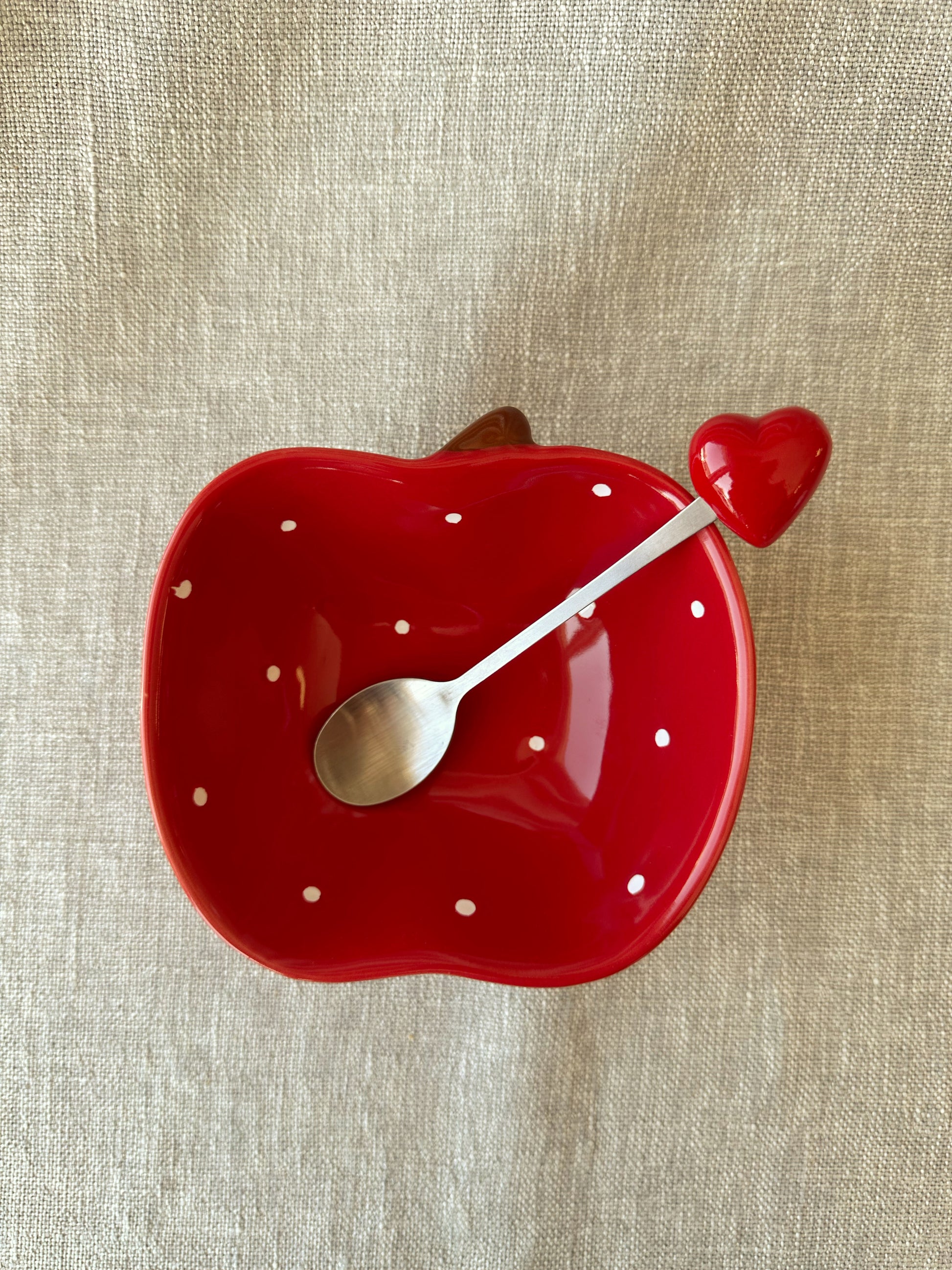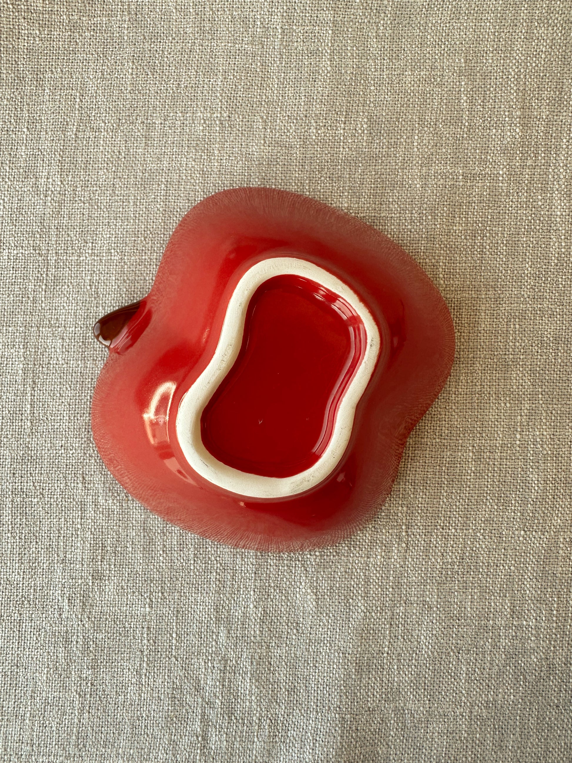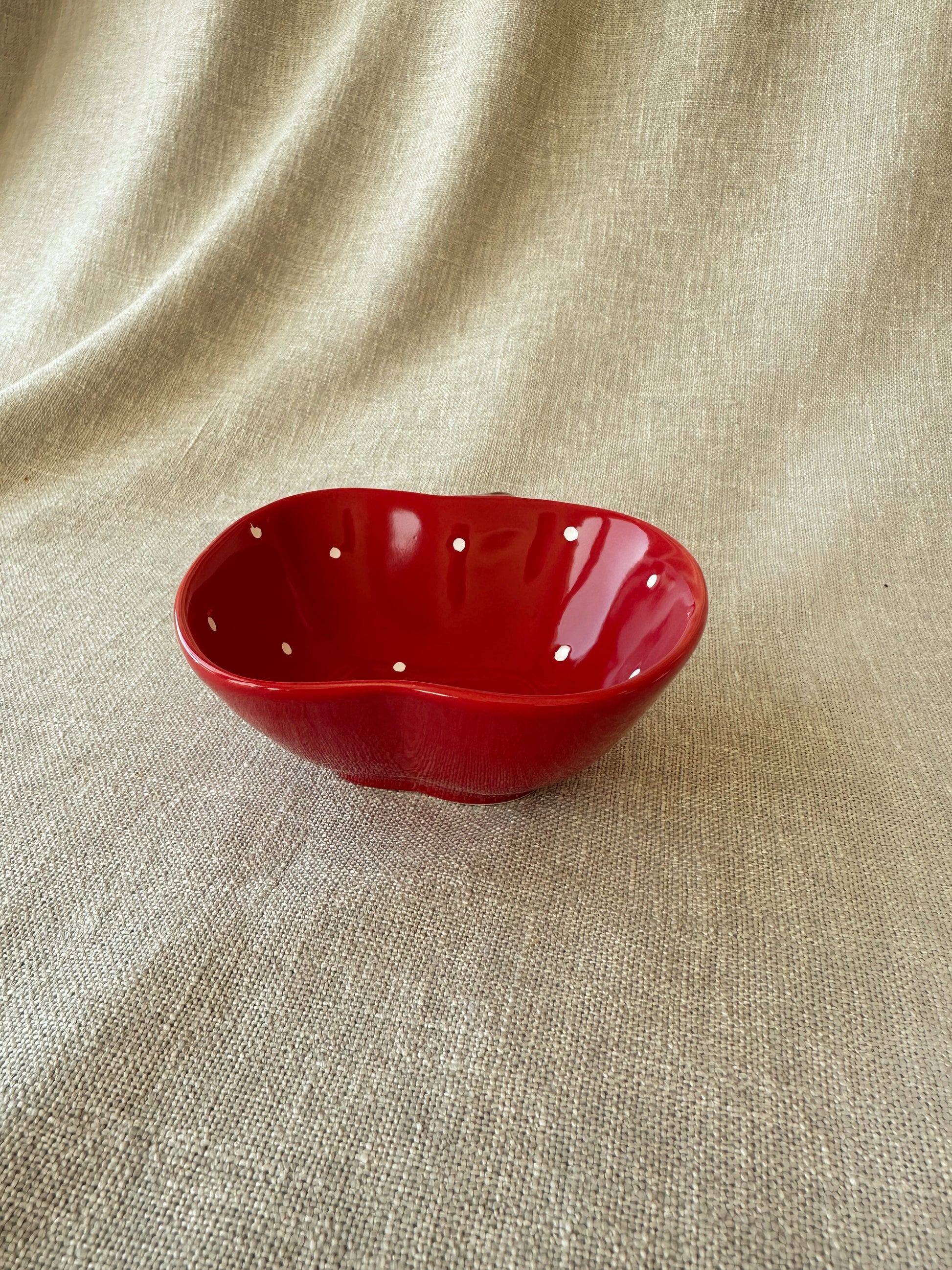 Söt skål format som ett äpple med små vita prickar på. 5 cm hög och 12 cm i diameter. Perfekt vintage skick!