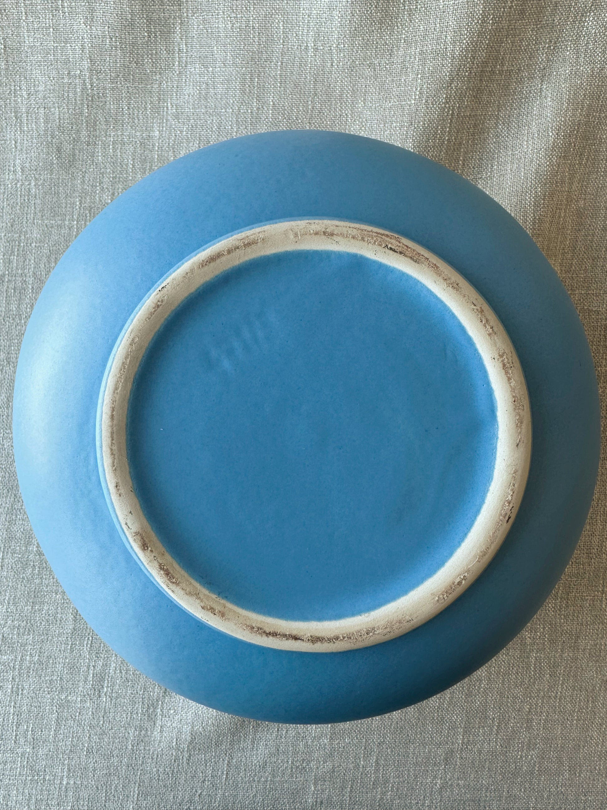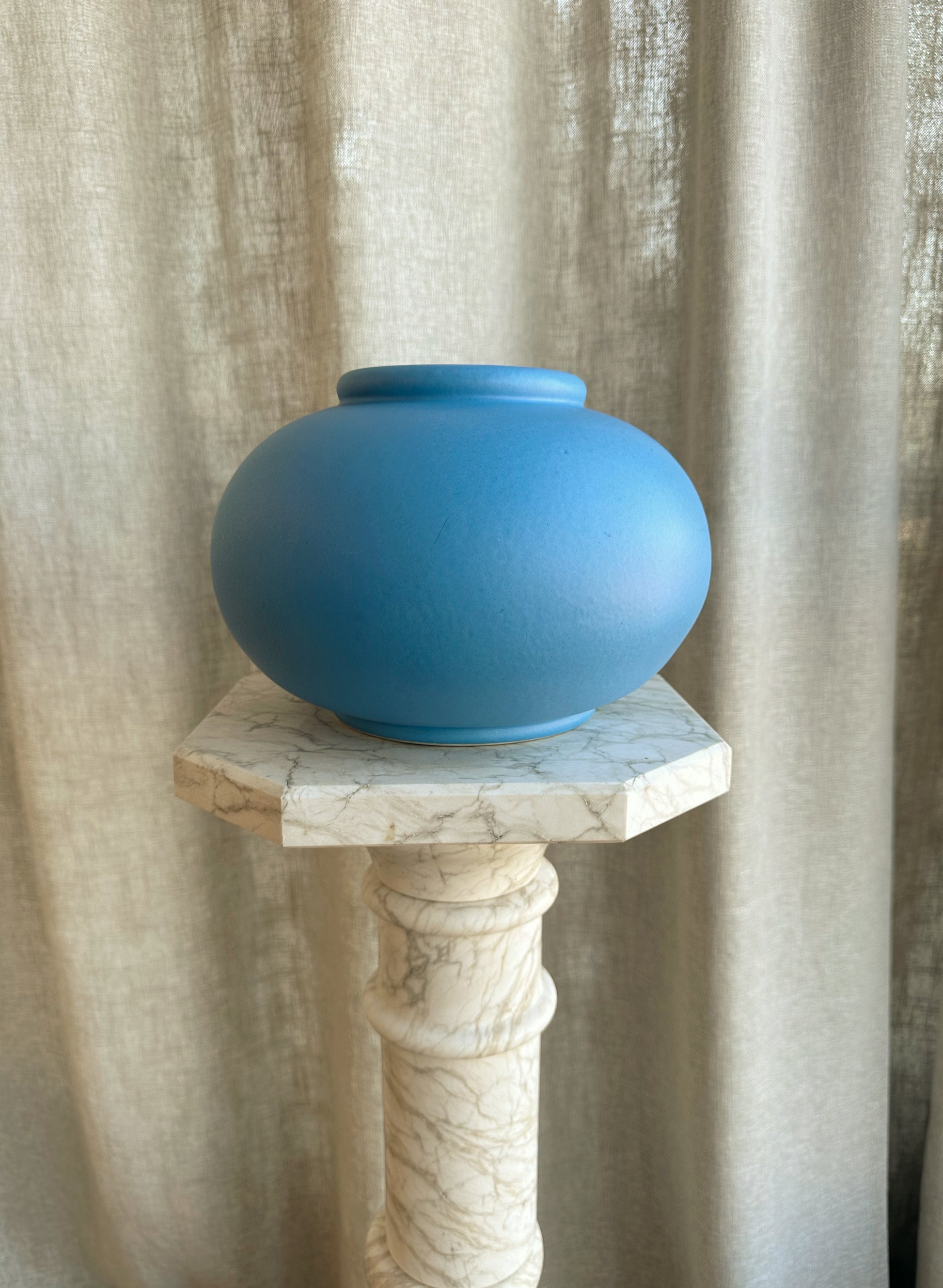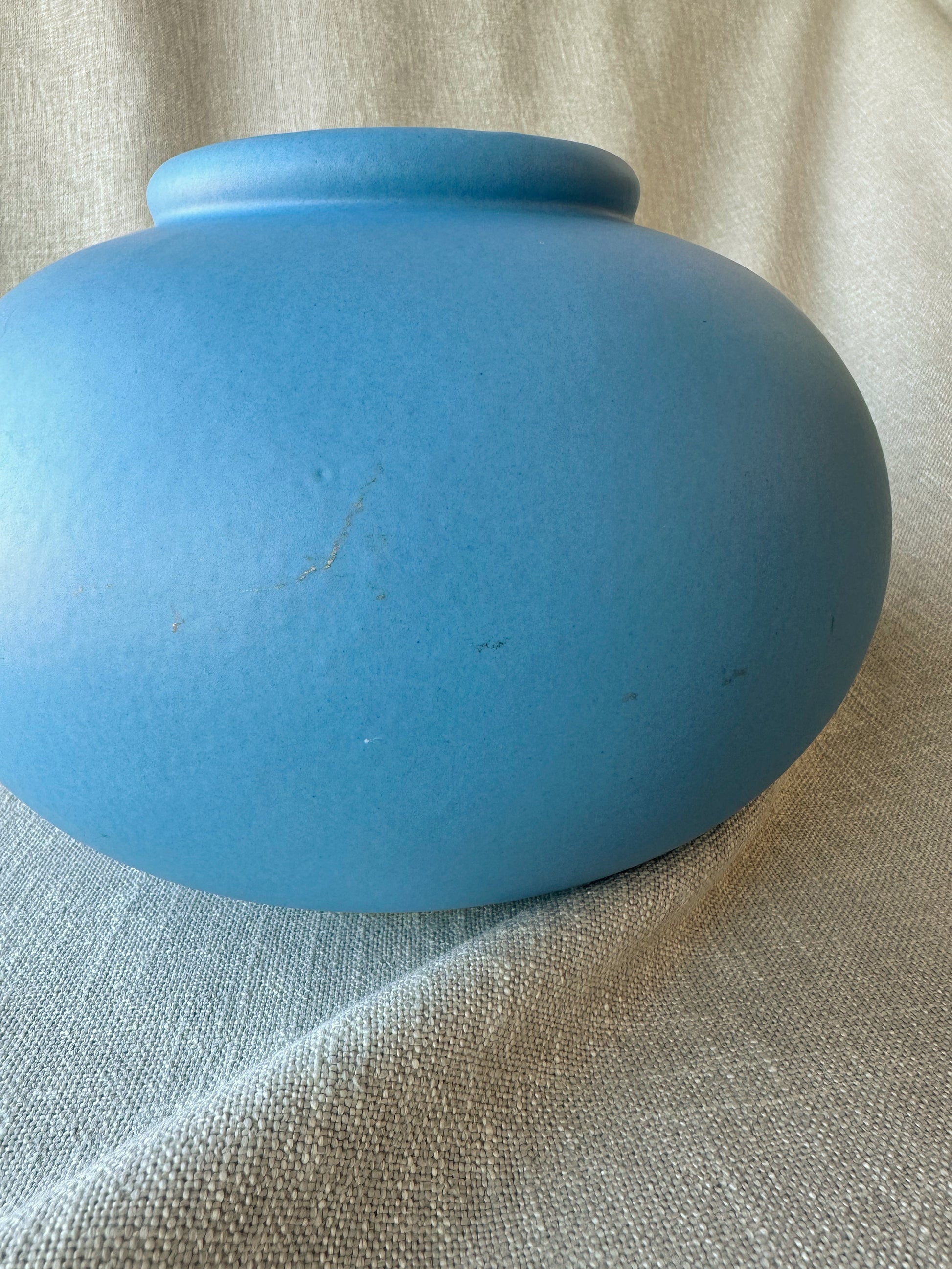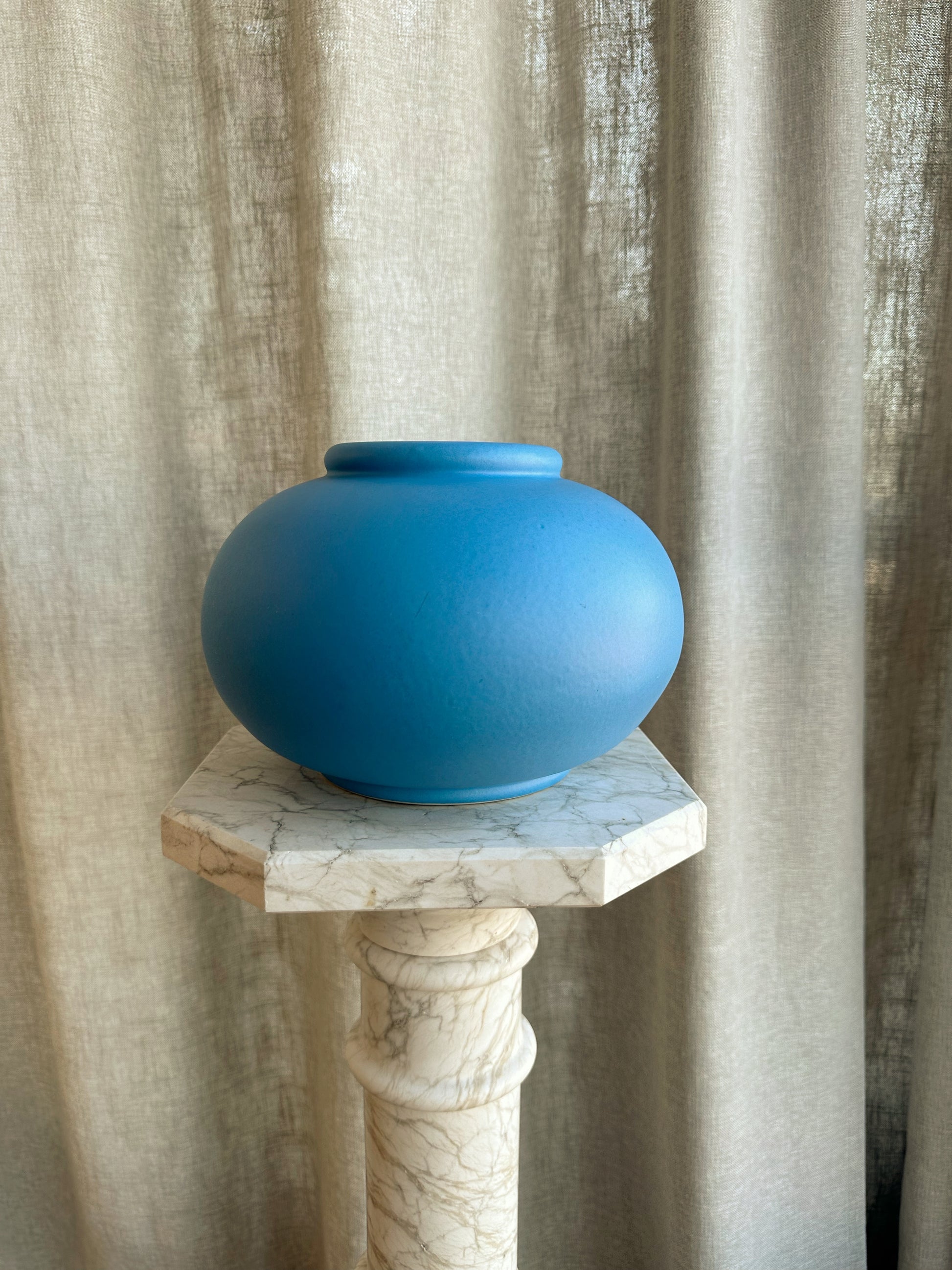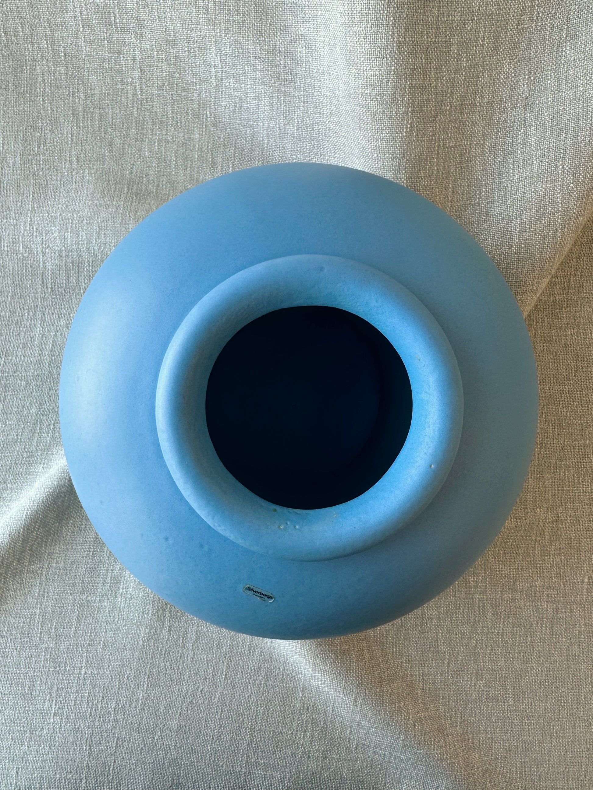 Vintage urna i en underbar blå nyans från svenska Silverbergs. Så fin på ett enkelt ekbord som en egen pjäs. Storleken är ca 24 cm i diameter och 16 cm hög. Några märken finns, se bilder.