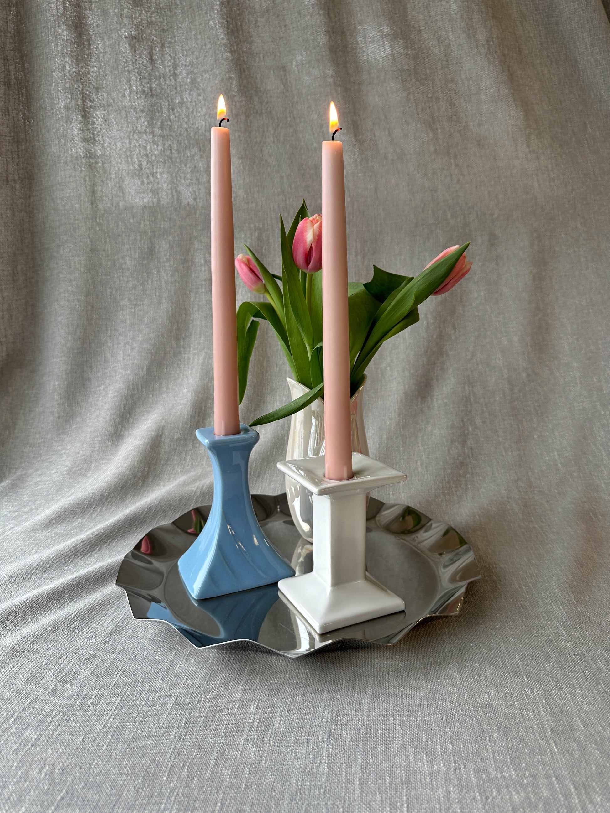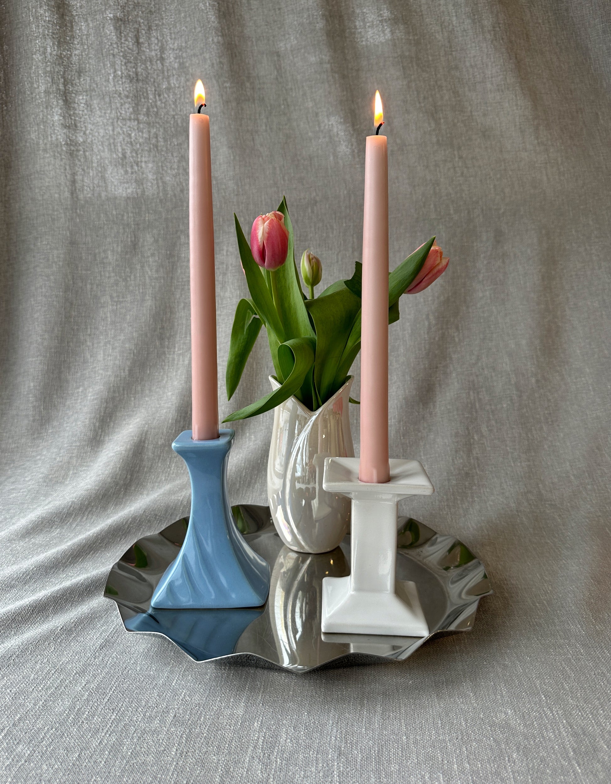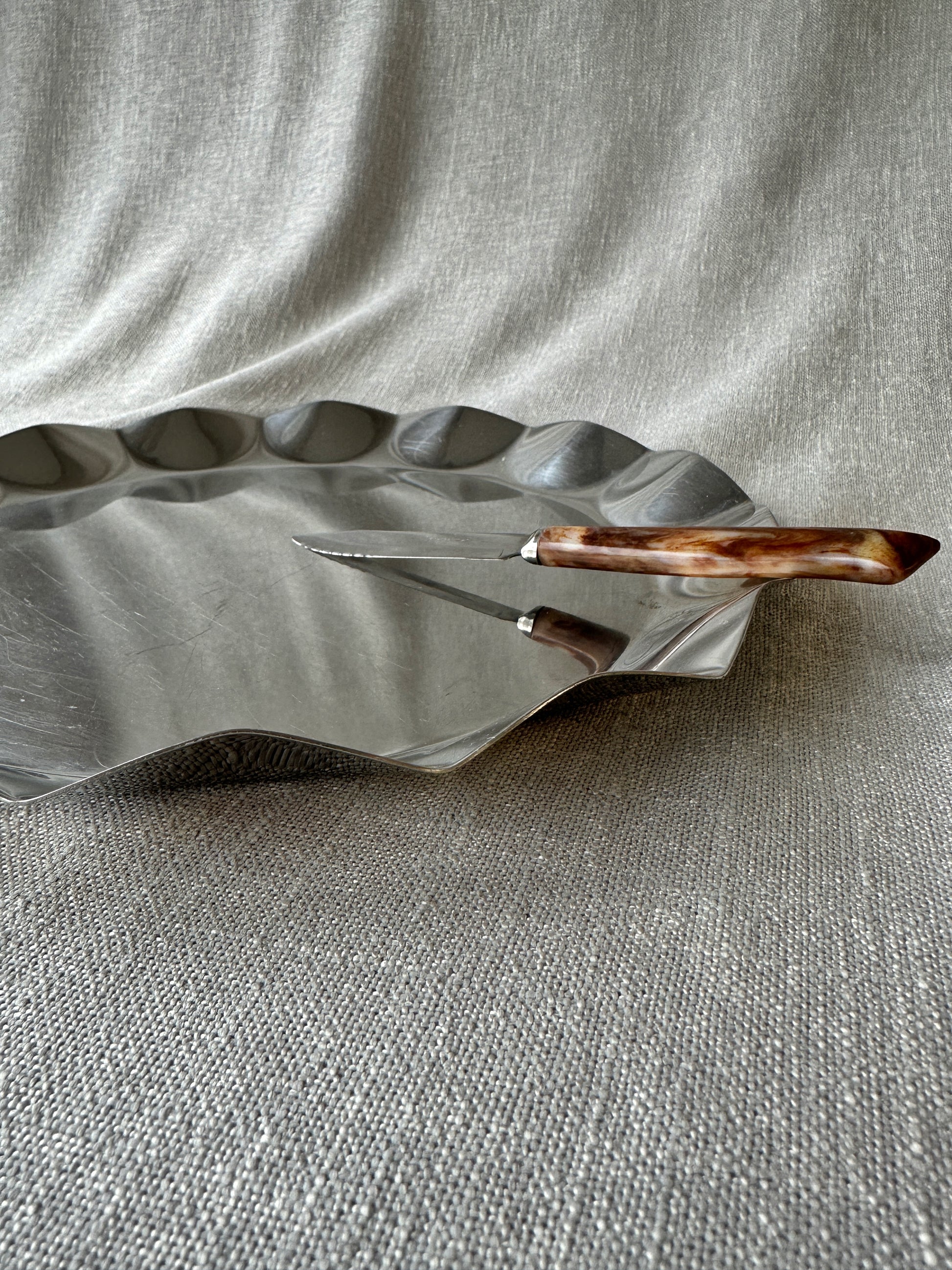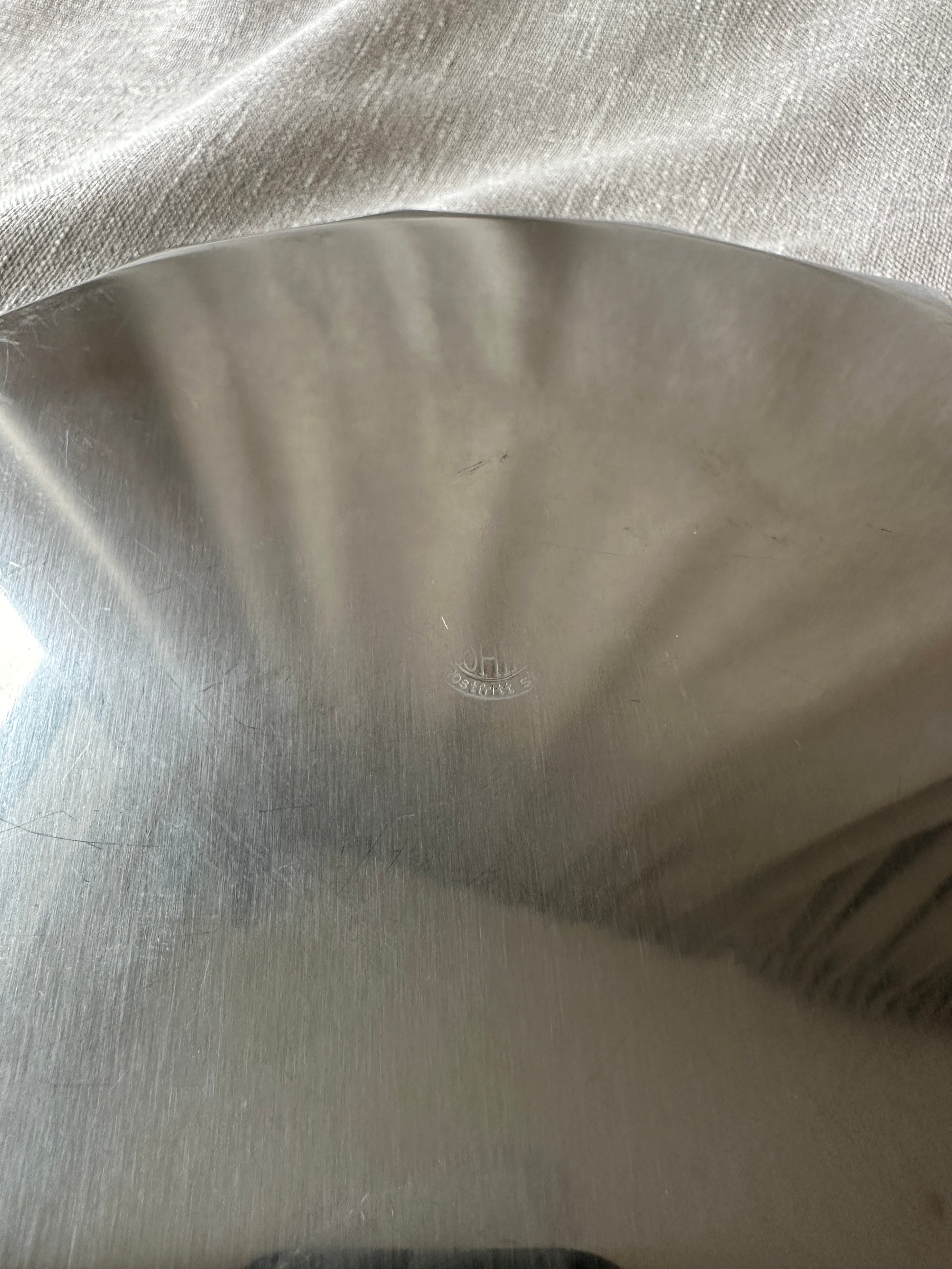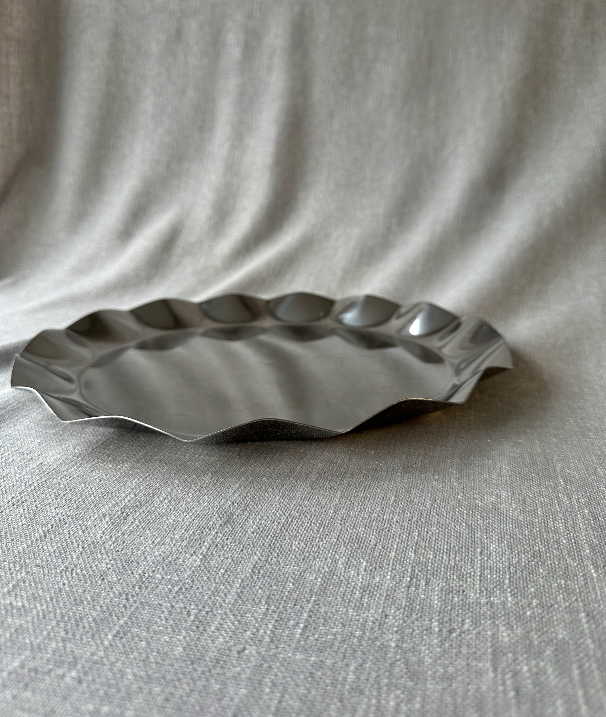 Vacker bricka i rostfritt stål som även fungerar lika bra att använda som uppläggningsfat. Storleken är 29,5 cm i diameter. Ytrepig med ändock blank och fin.