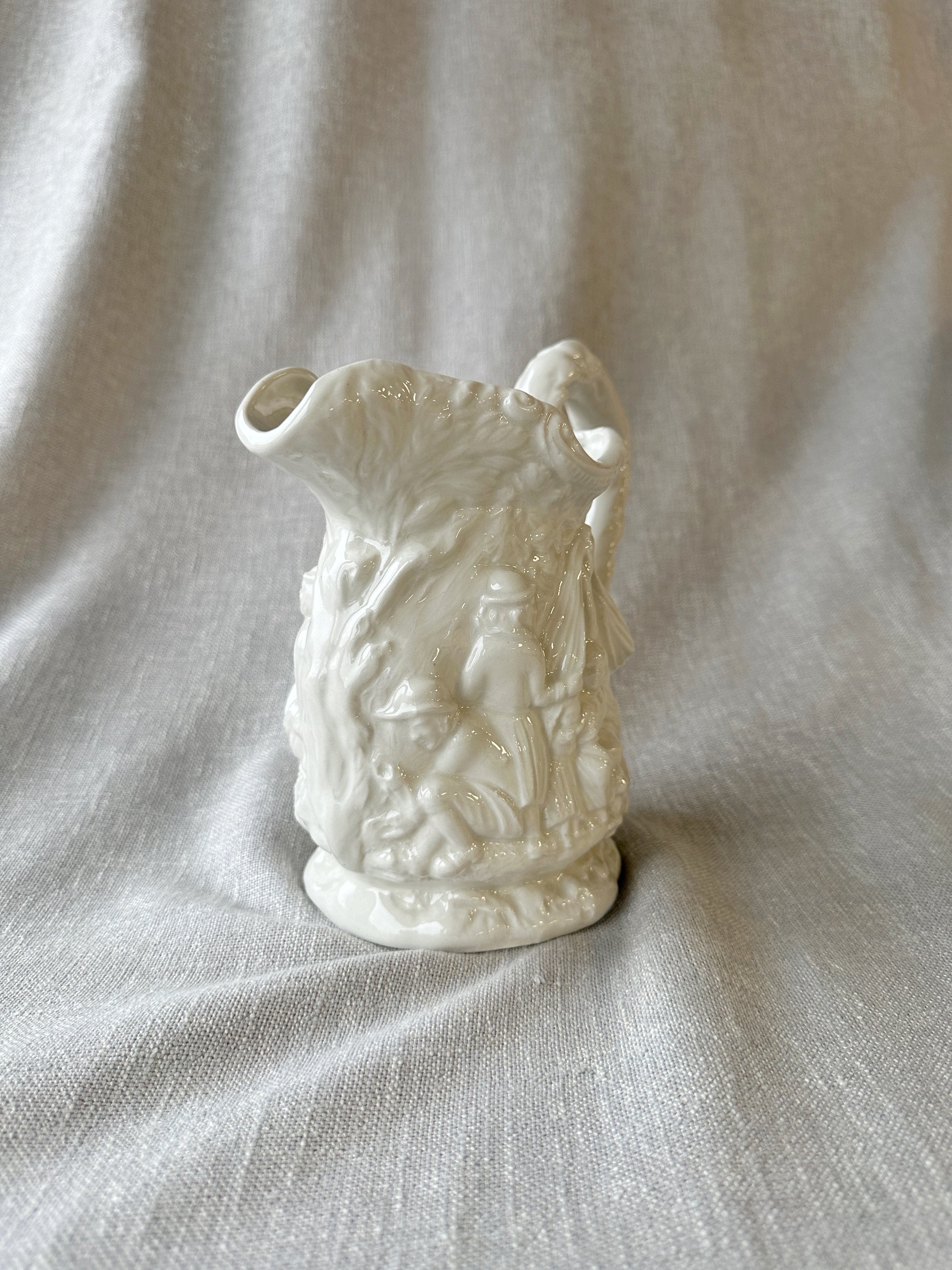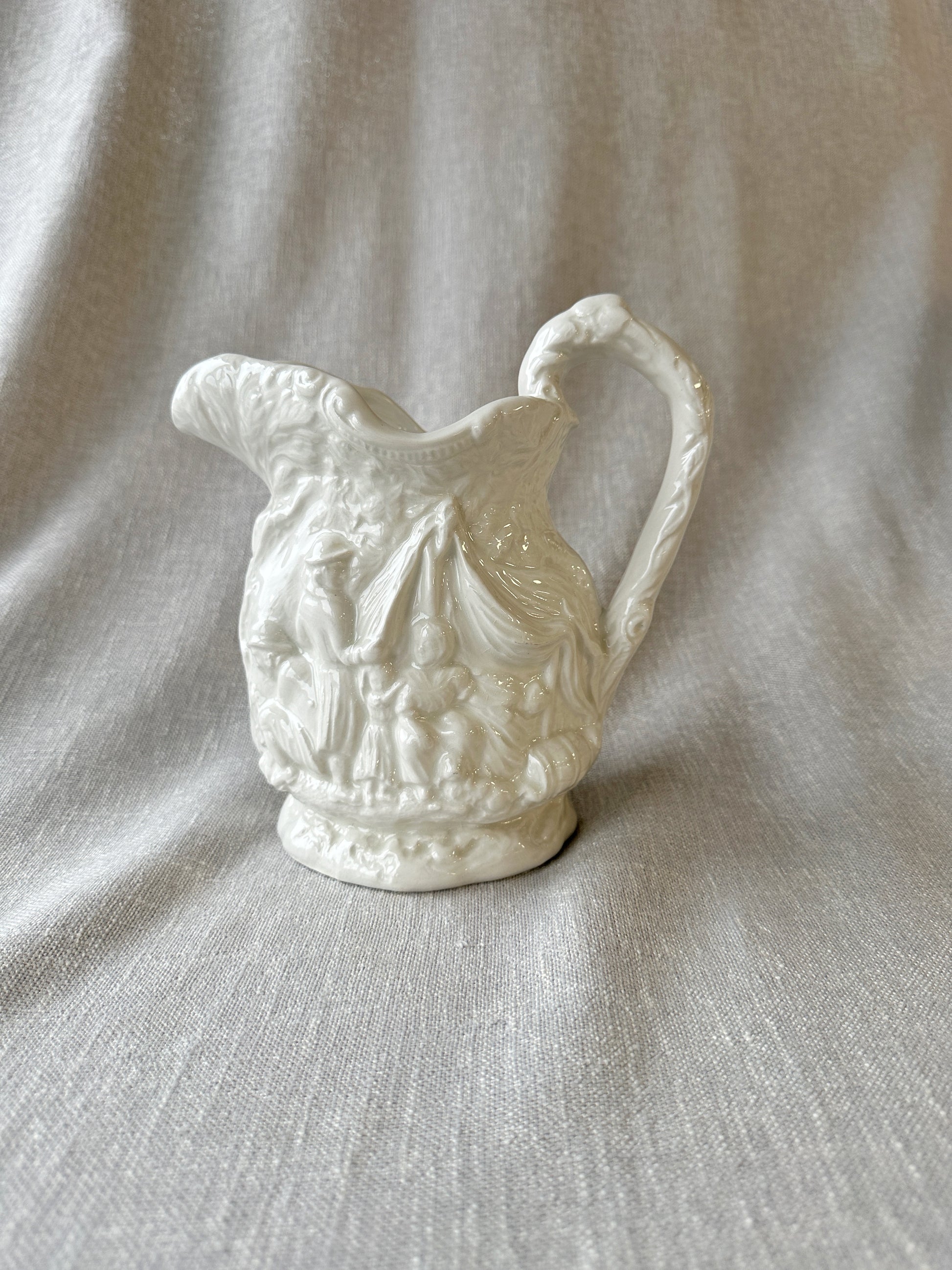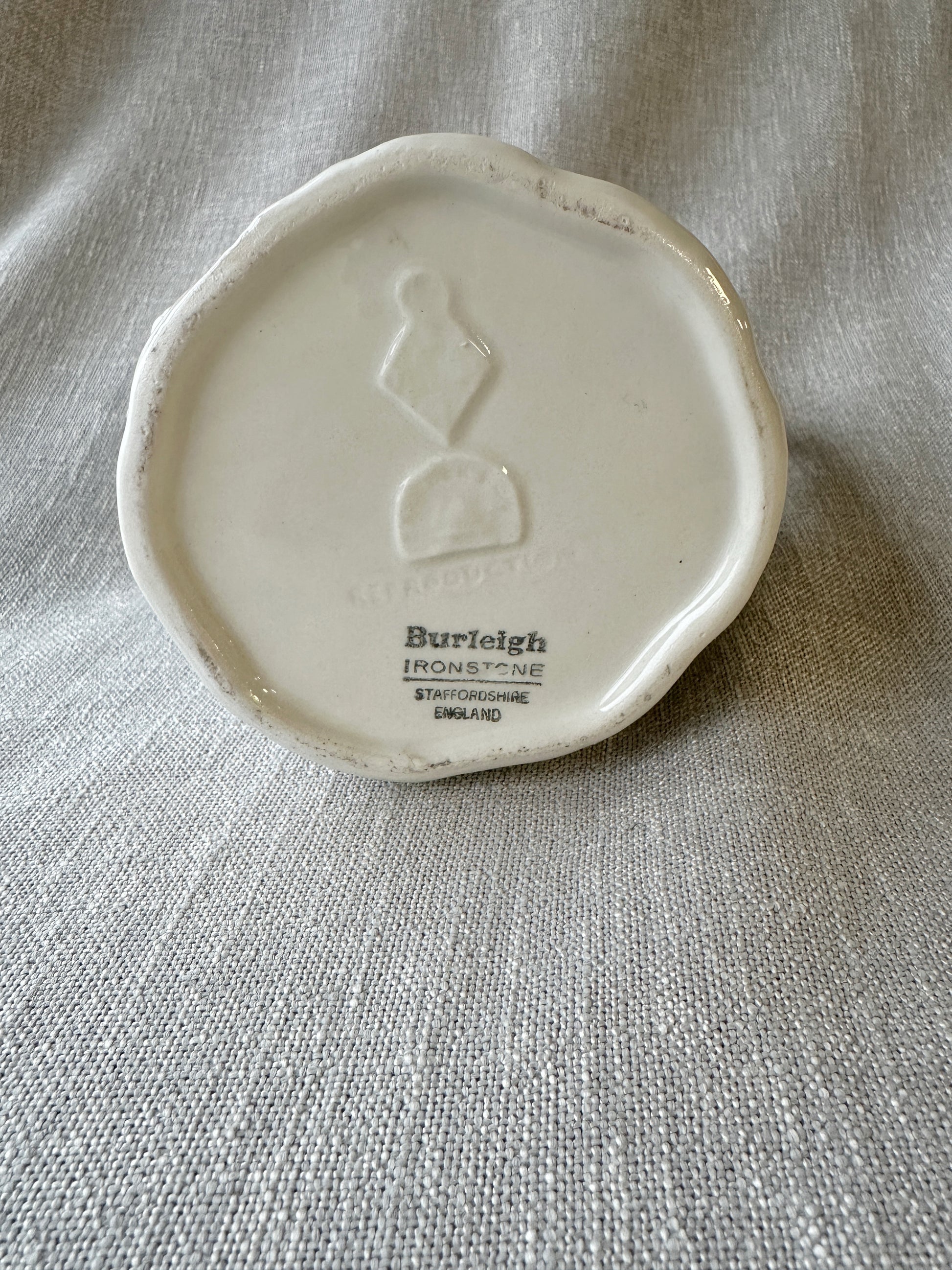 Vacker engelsk kanna. Märkt "Reproduction Burleigh Ironstone Staffordshire England". Superfint skick men med några krackeleringar i botten på insidan. Storleken är 18 cm hög och 14 cm bred.