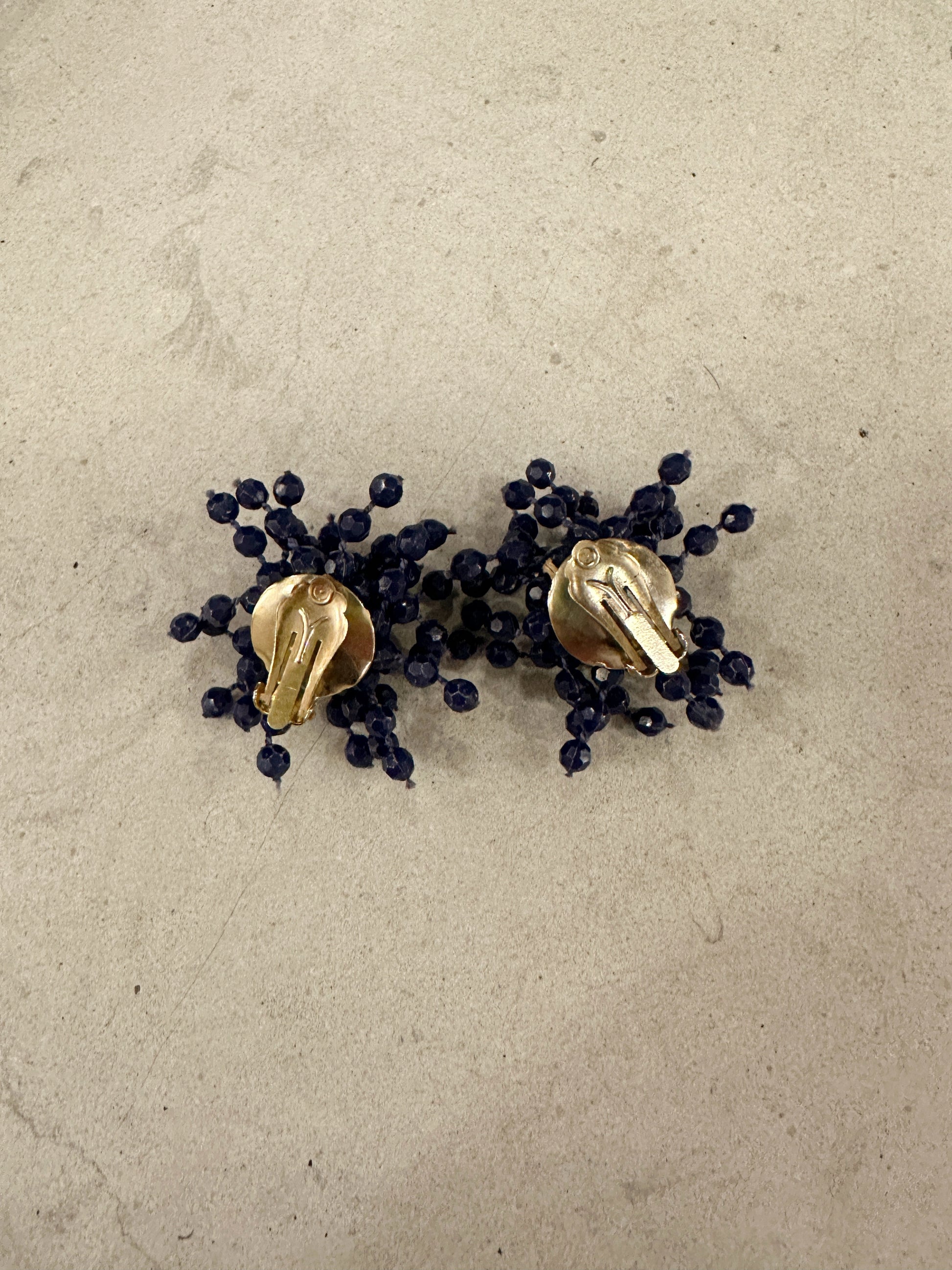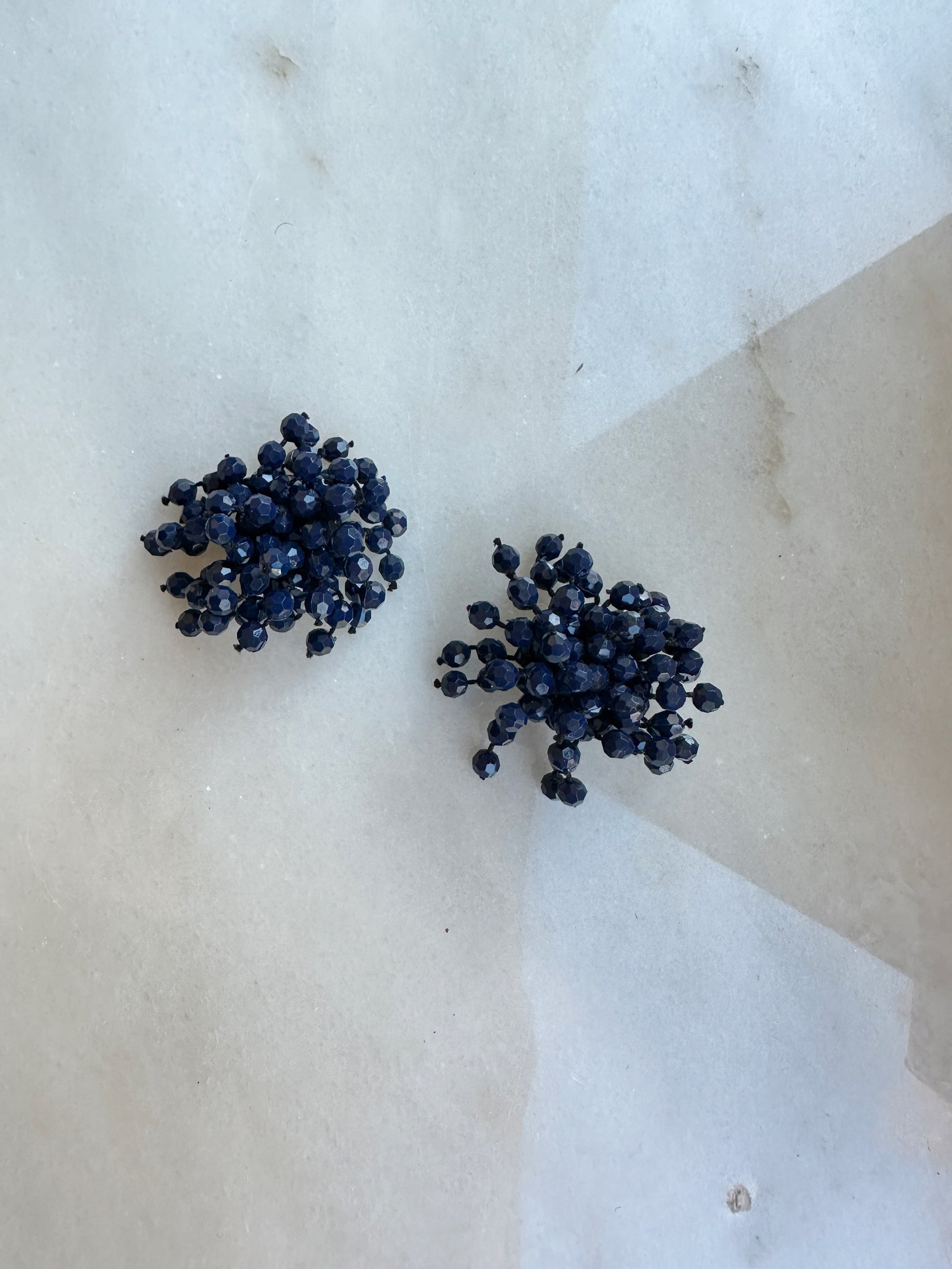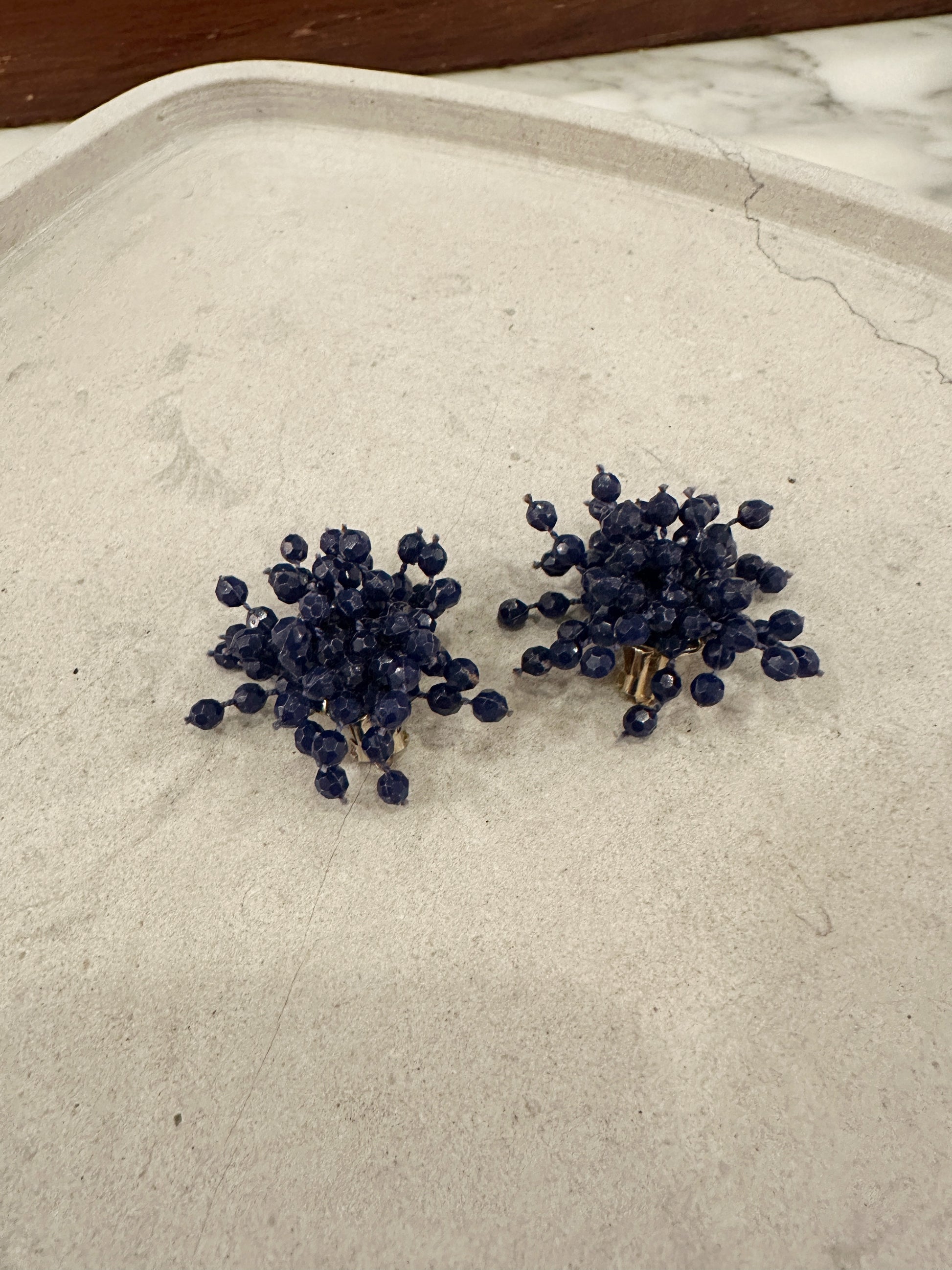 Härliga bubbliga marinblå vintage clips med små strån av blå pärlband på. Fästet är i metall.