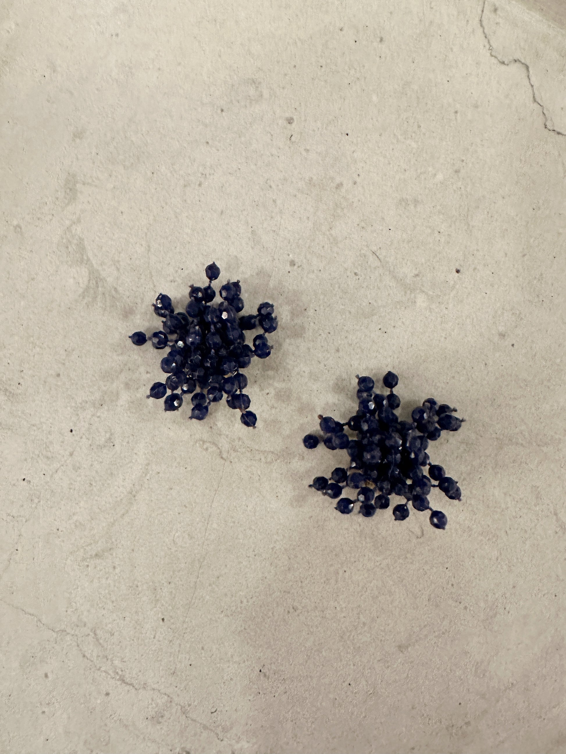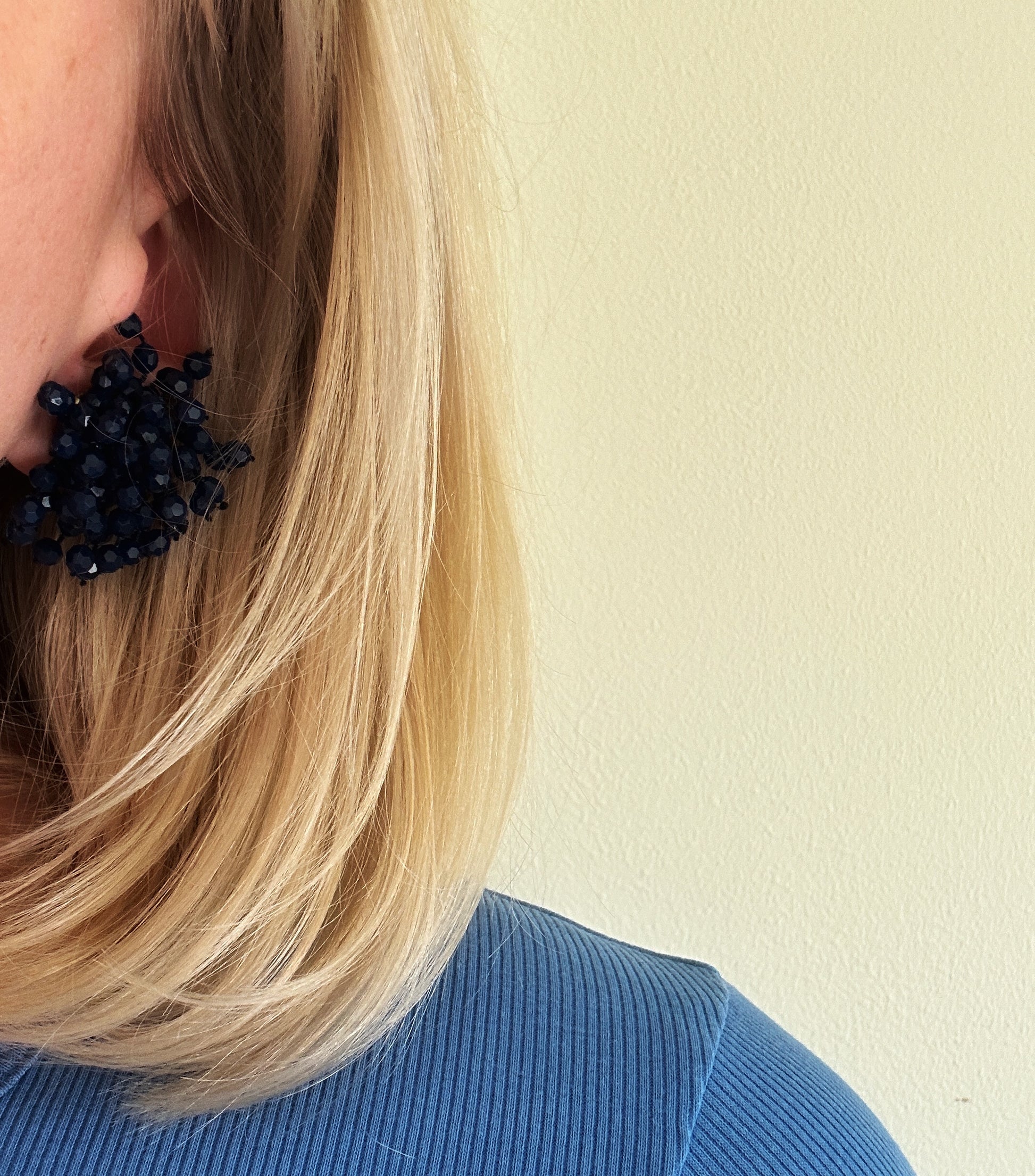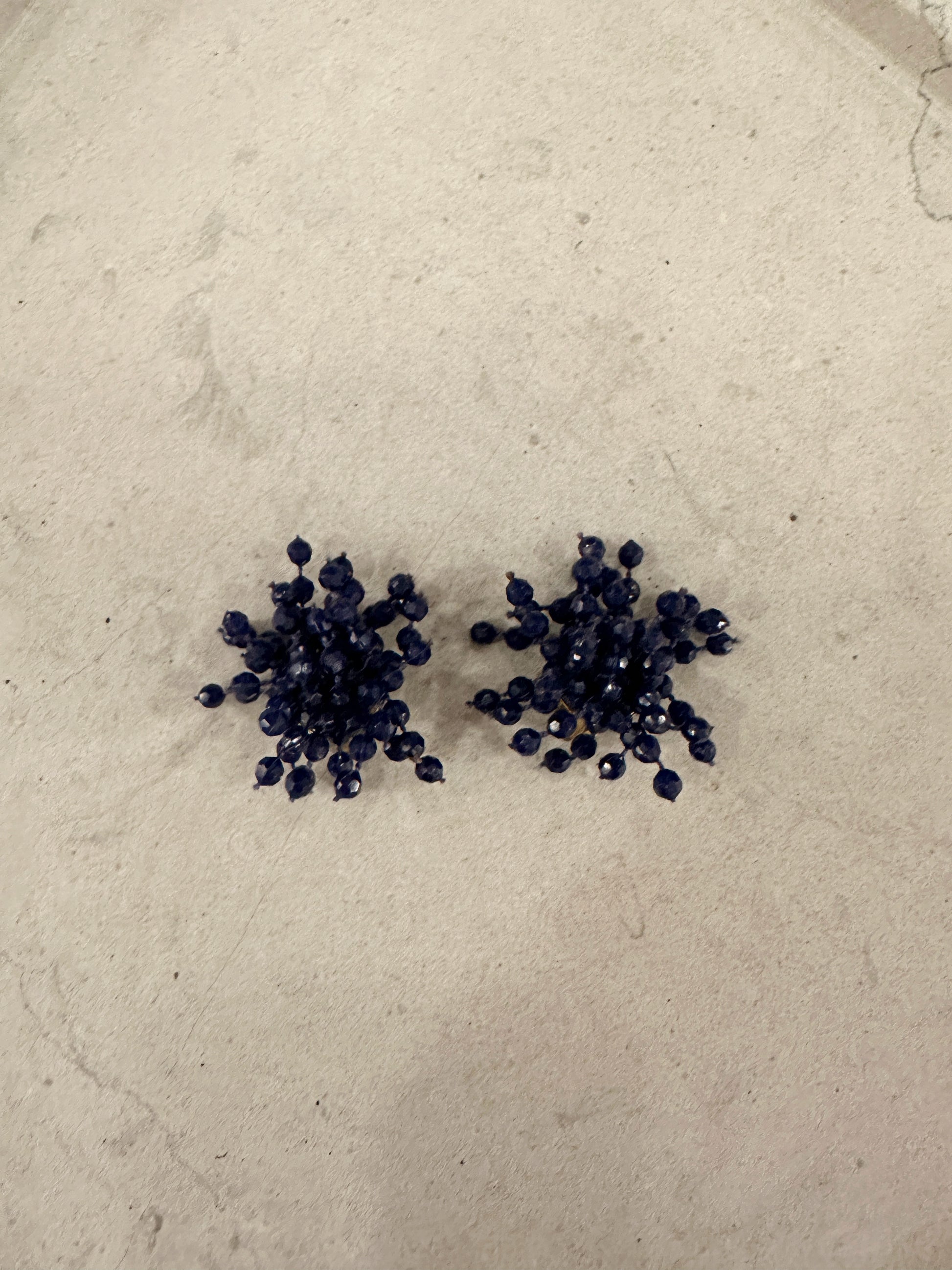 Härliga bubbliga marinblå vintage clips med små strån av blå pärlband på. Fästet är i metall.