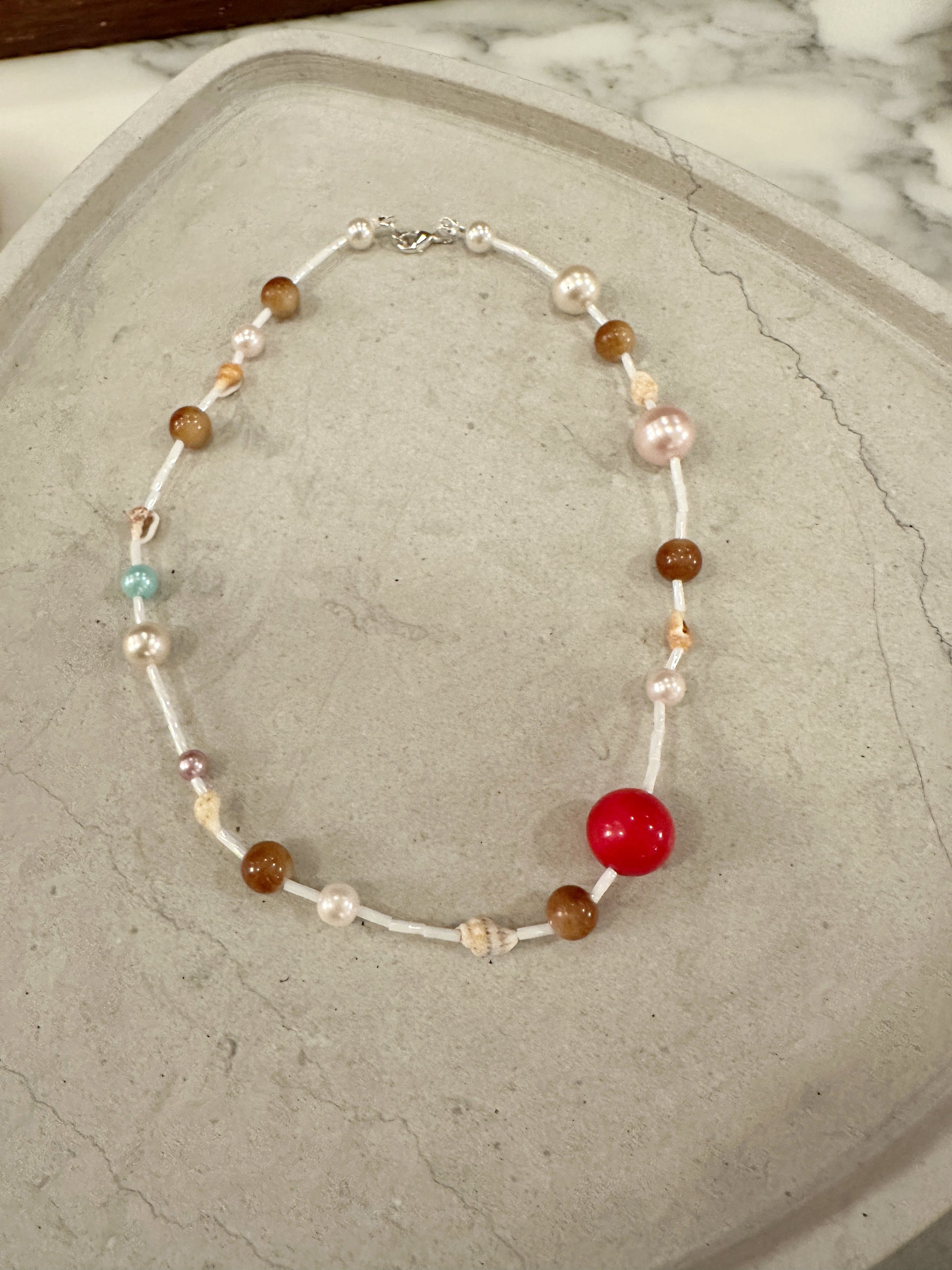 Handgjort halsband gjort av återbrukade pärlor och snäckor. Superfint till en enkel t-shirt eller stickad tröja. Längden på halsbandet är 45 cm.