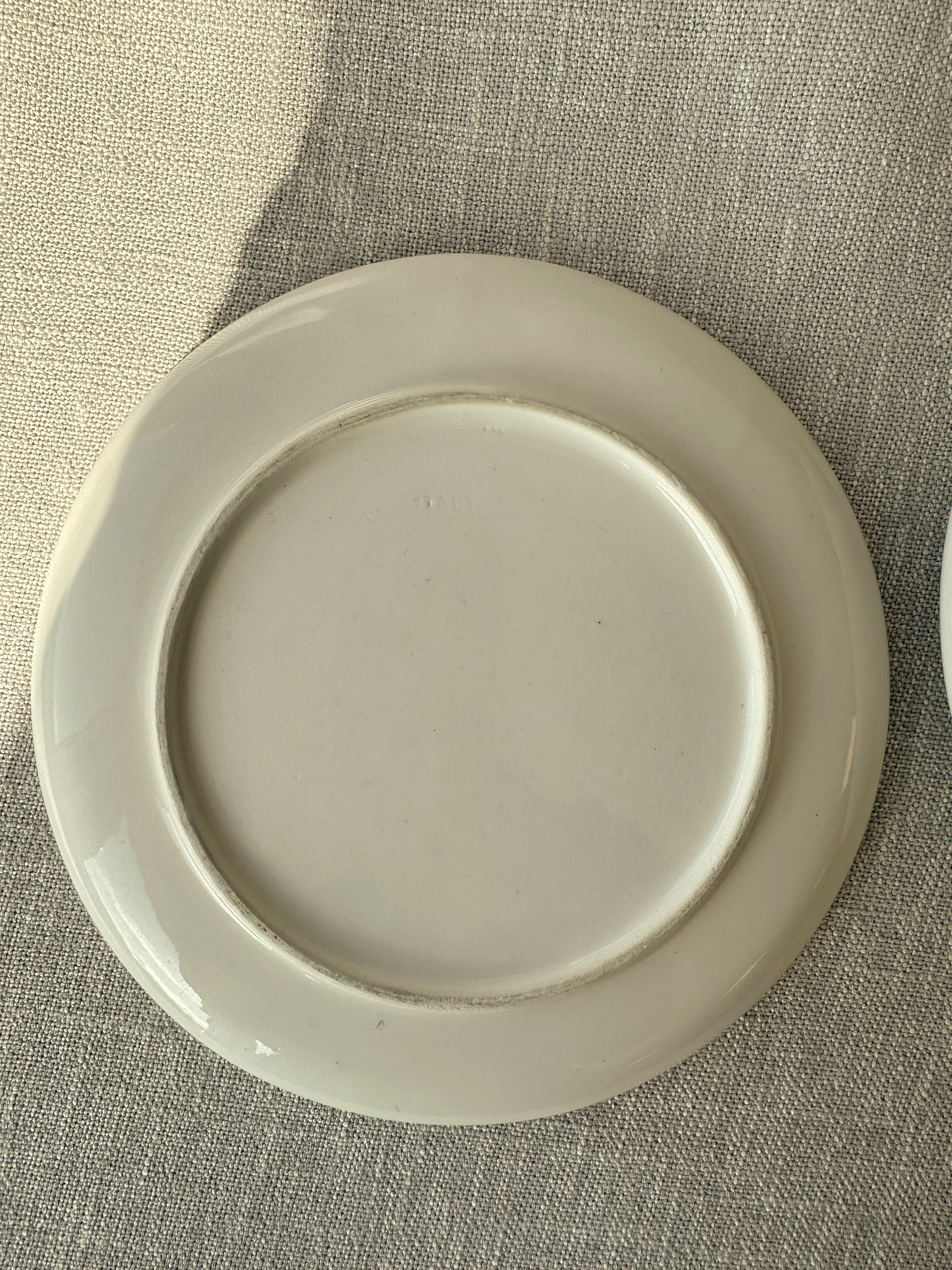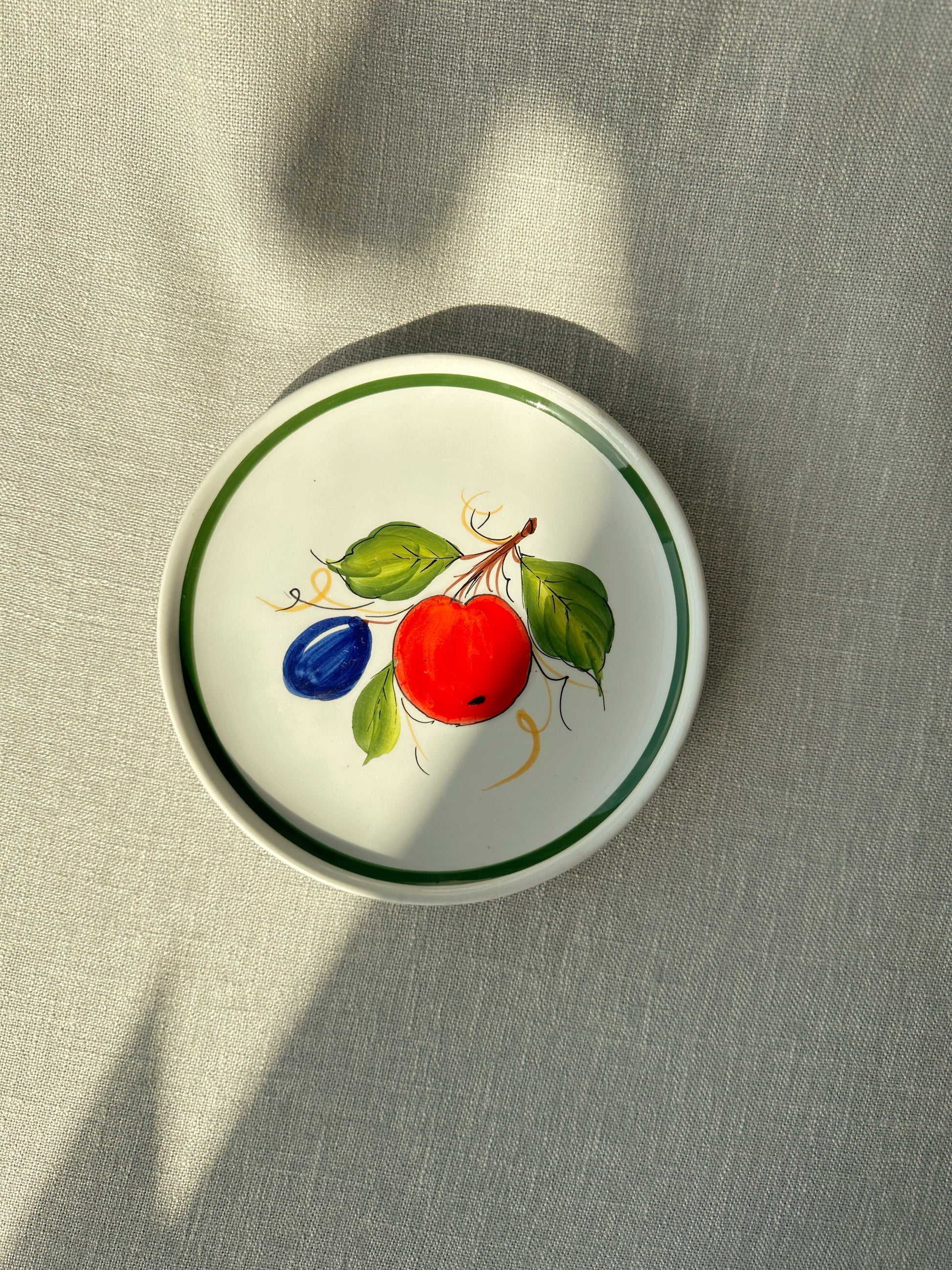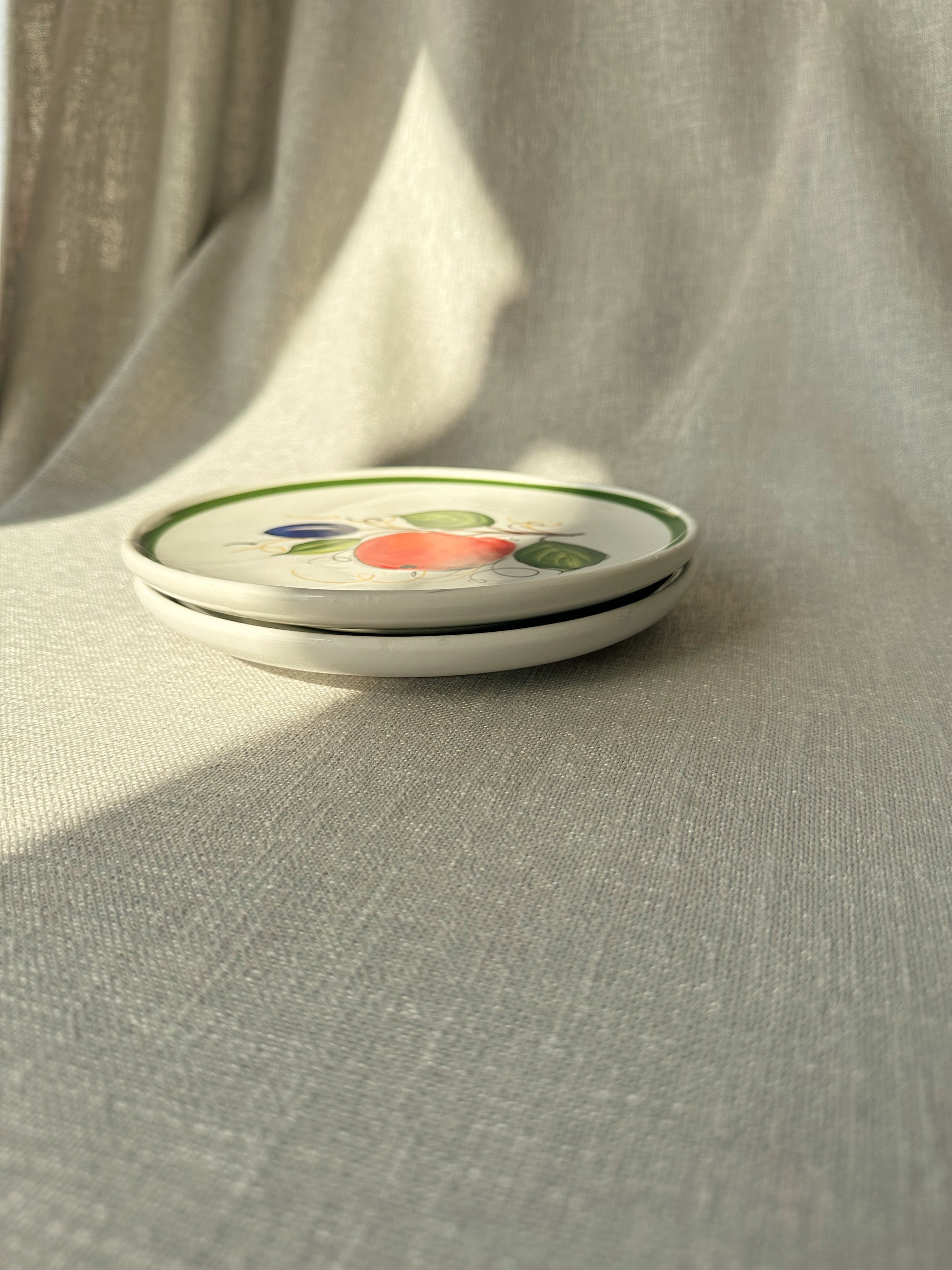 Två assietter med målat motiv av frukter på. Något litet märke på vardera fat men ack så fina ändå! Märkta "Italy". Storleken är 18 cm i diameter. Säljs tillsammans.