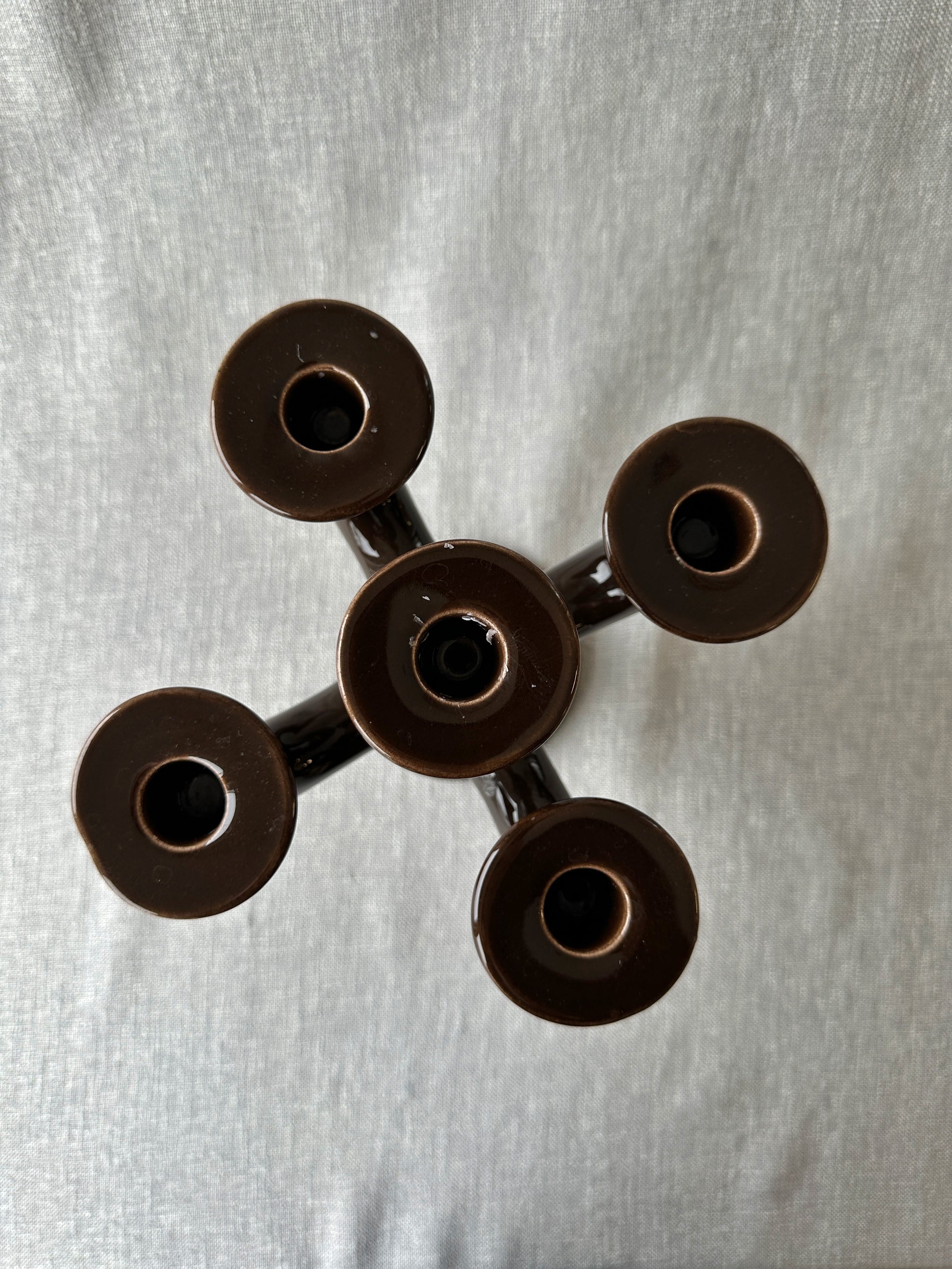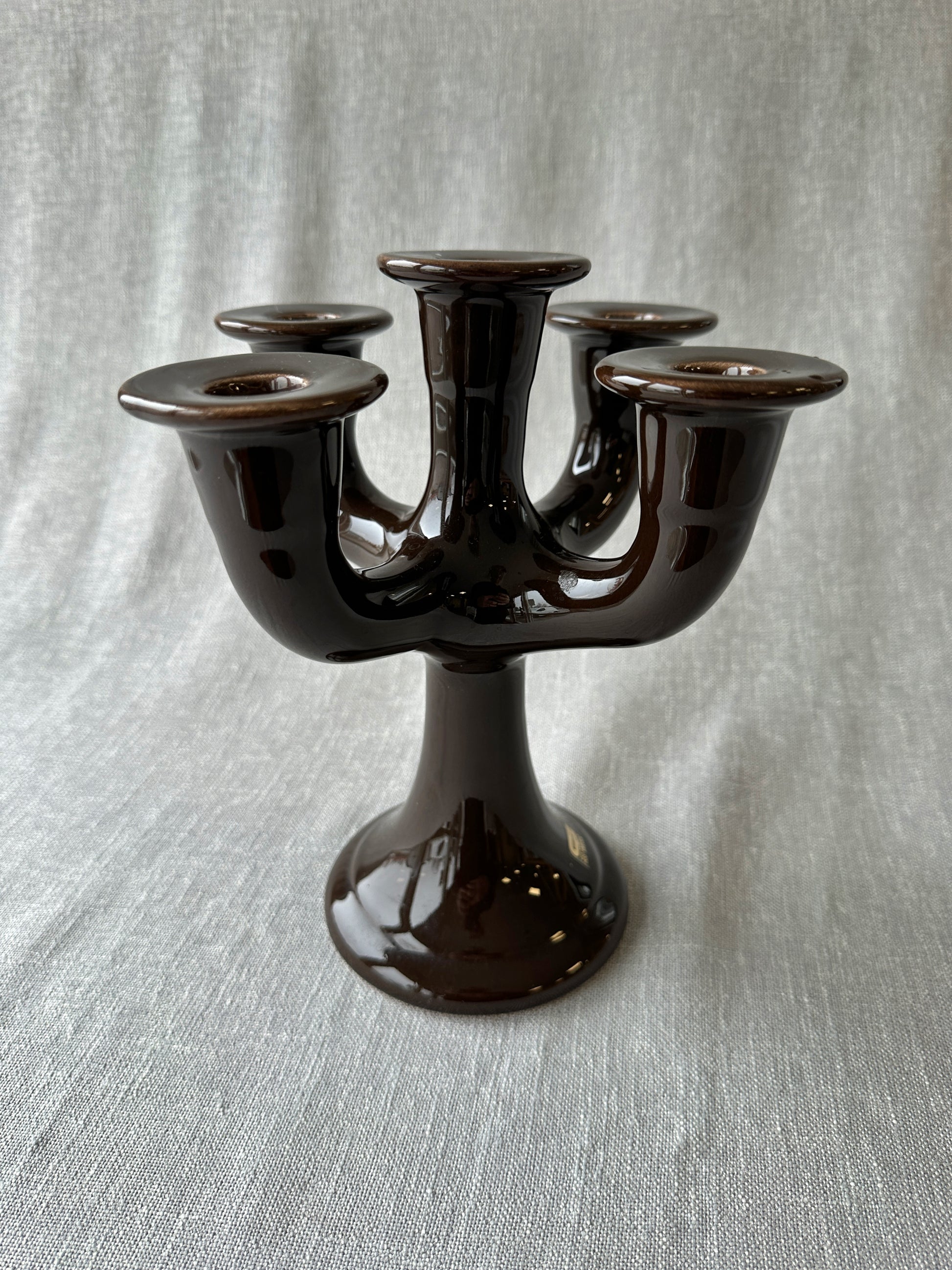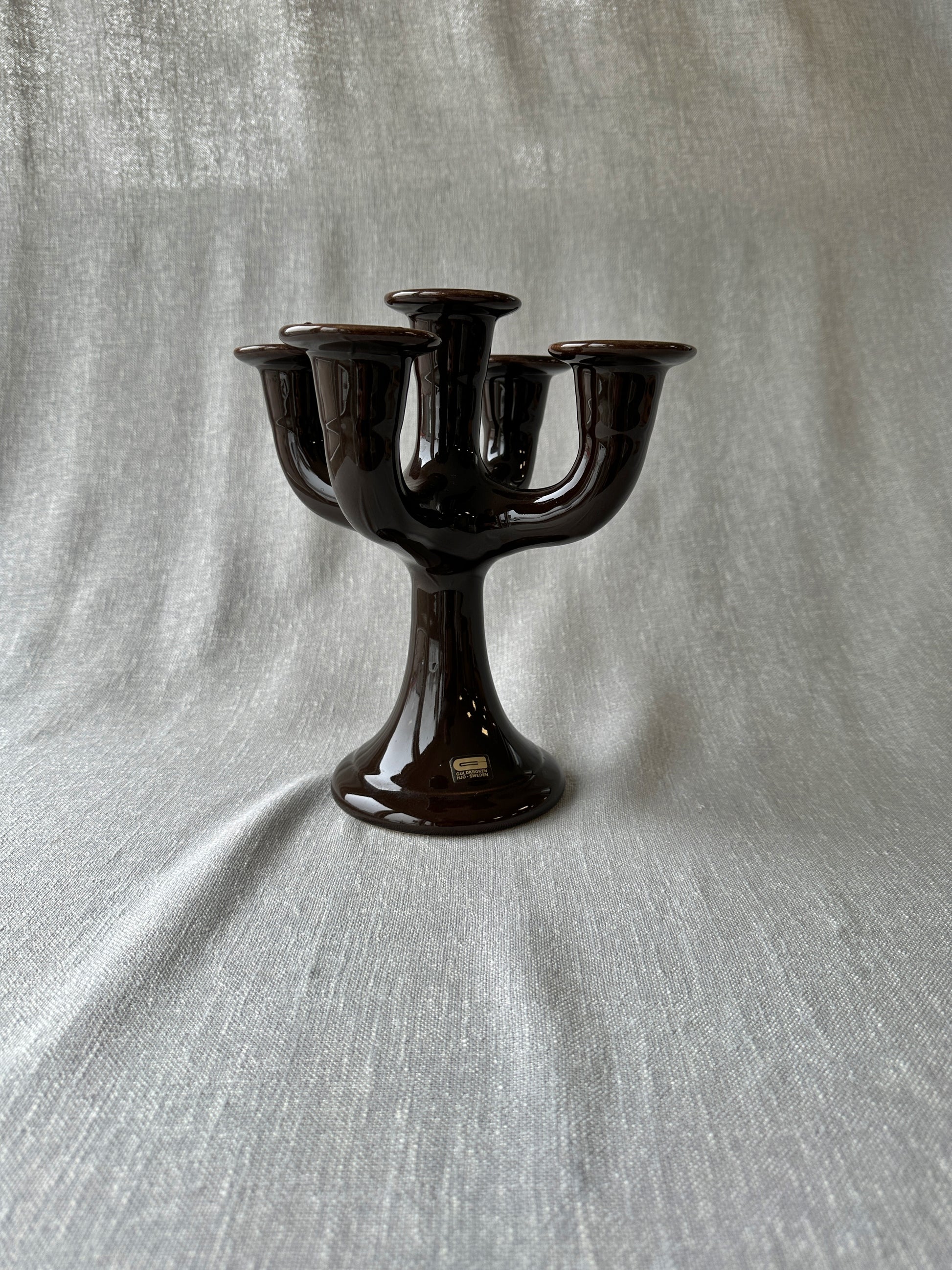 Underbar kandelaber i brun keramik från klassiska Guldkroken. Så rätt i färg just nu! 23 cm hög och ca 22 cm i diameter på vidaste delen vid armarna. Väldigt snyggt att ha färgade ljus i. Superfint vintageskick utan anmärkningar.