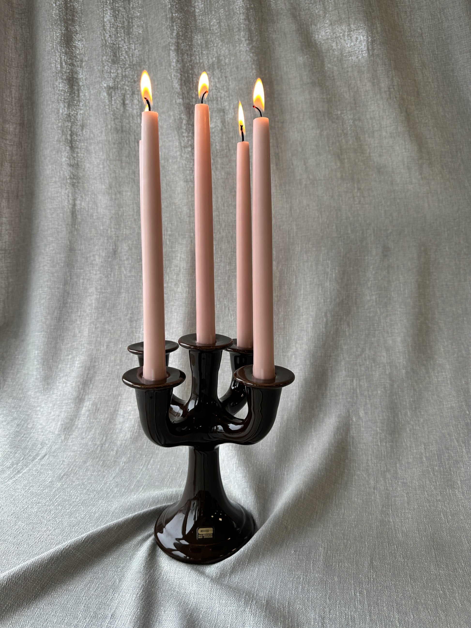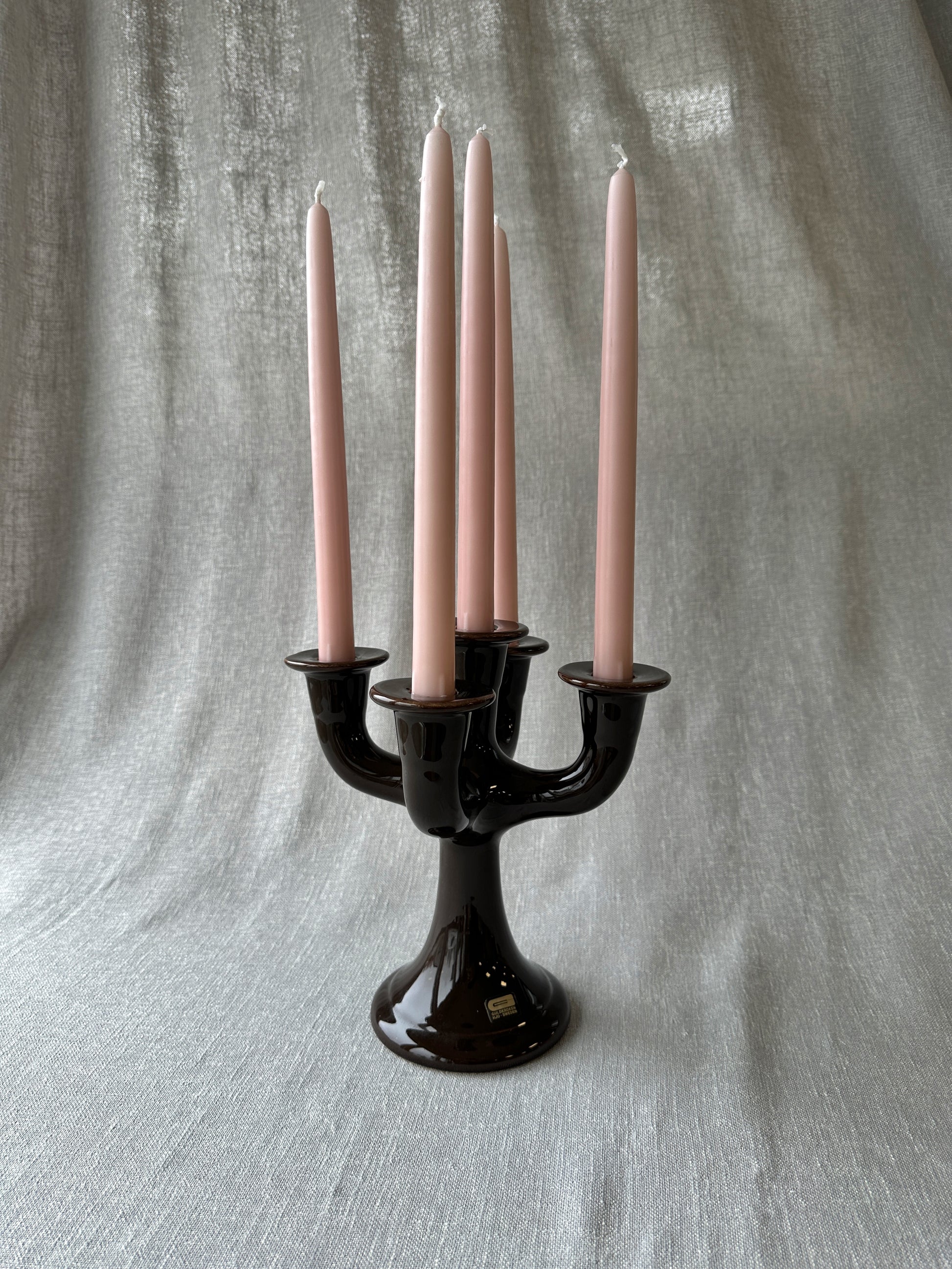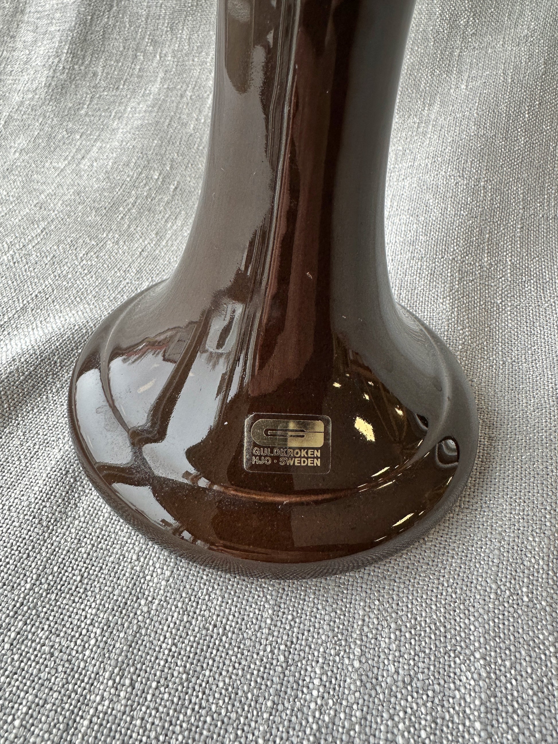 Underbar kandelaber i brun keramik från klassiska Guldkroken. Så rätt i färg just nu! 23 cm hög och ca 22 cm i diameter på vidaste delen vid armarna. Väldigt snyggt att ha färgade ljus i. Superfint vintageskick utan anmärkningar.