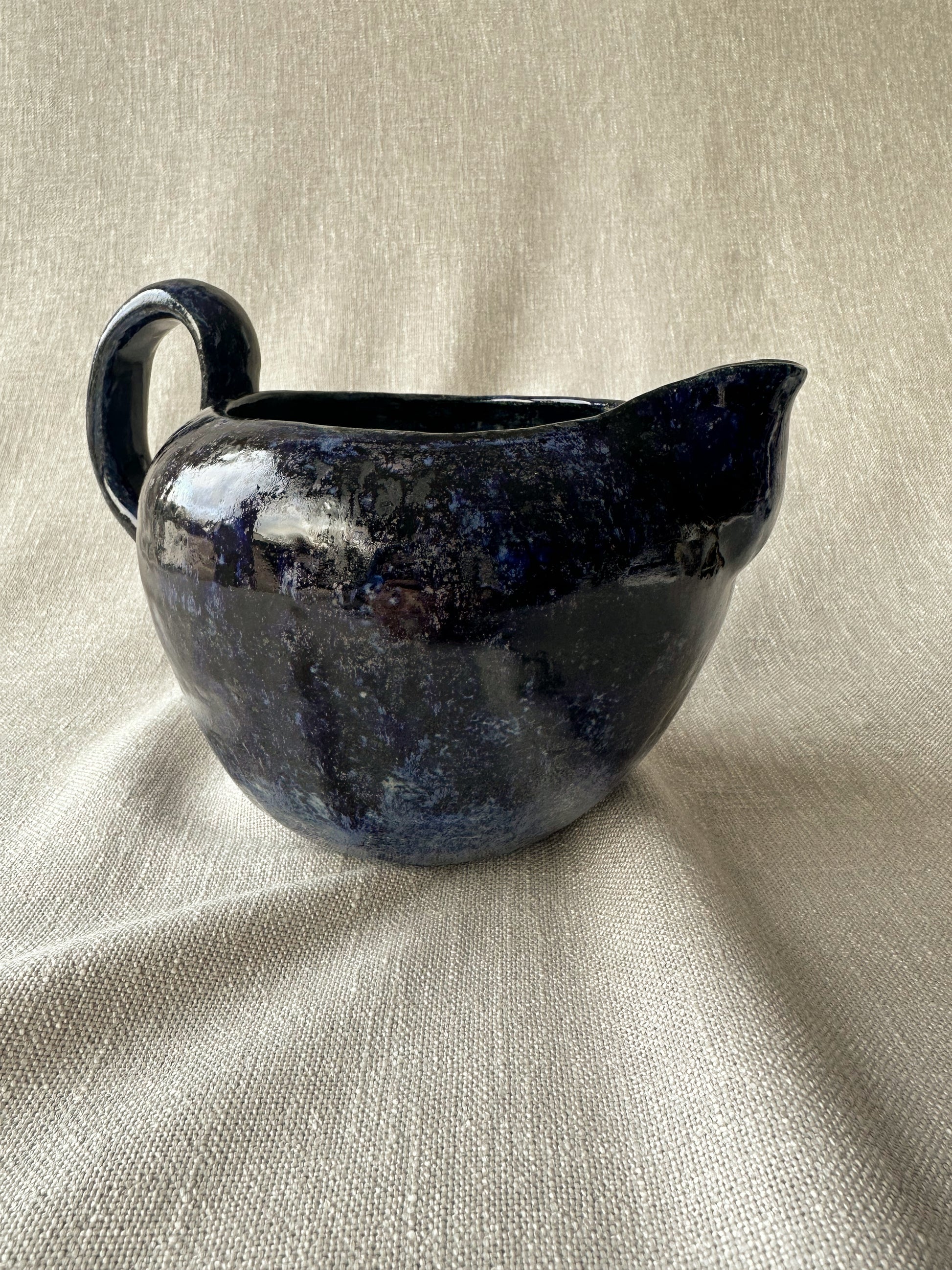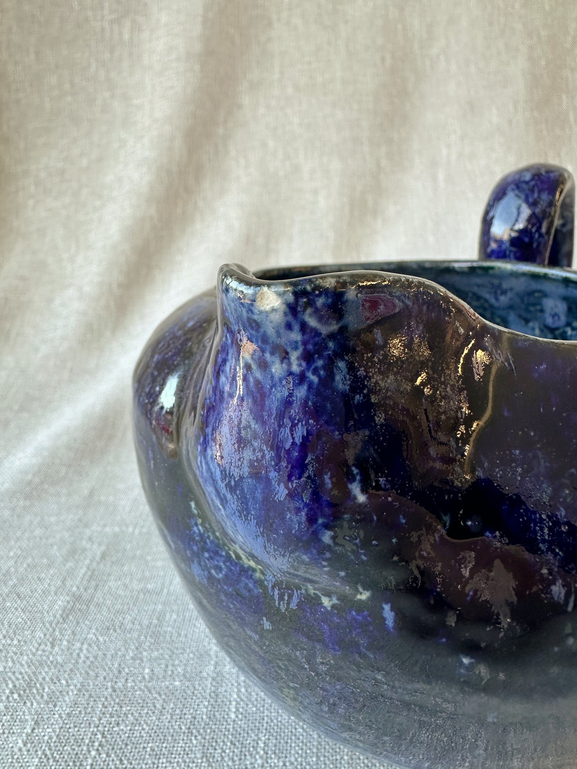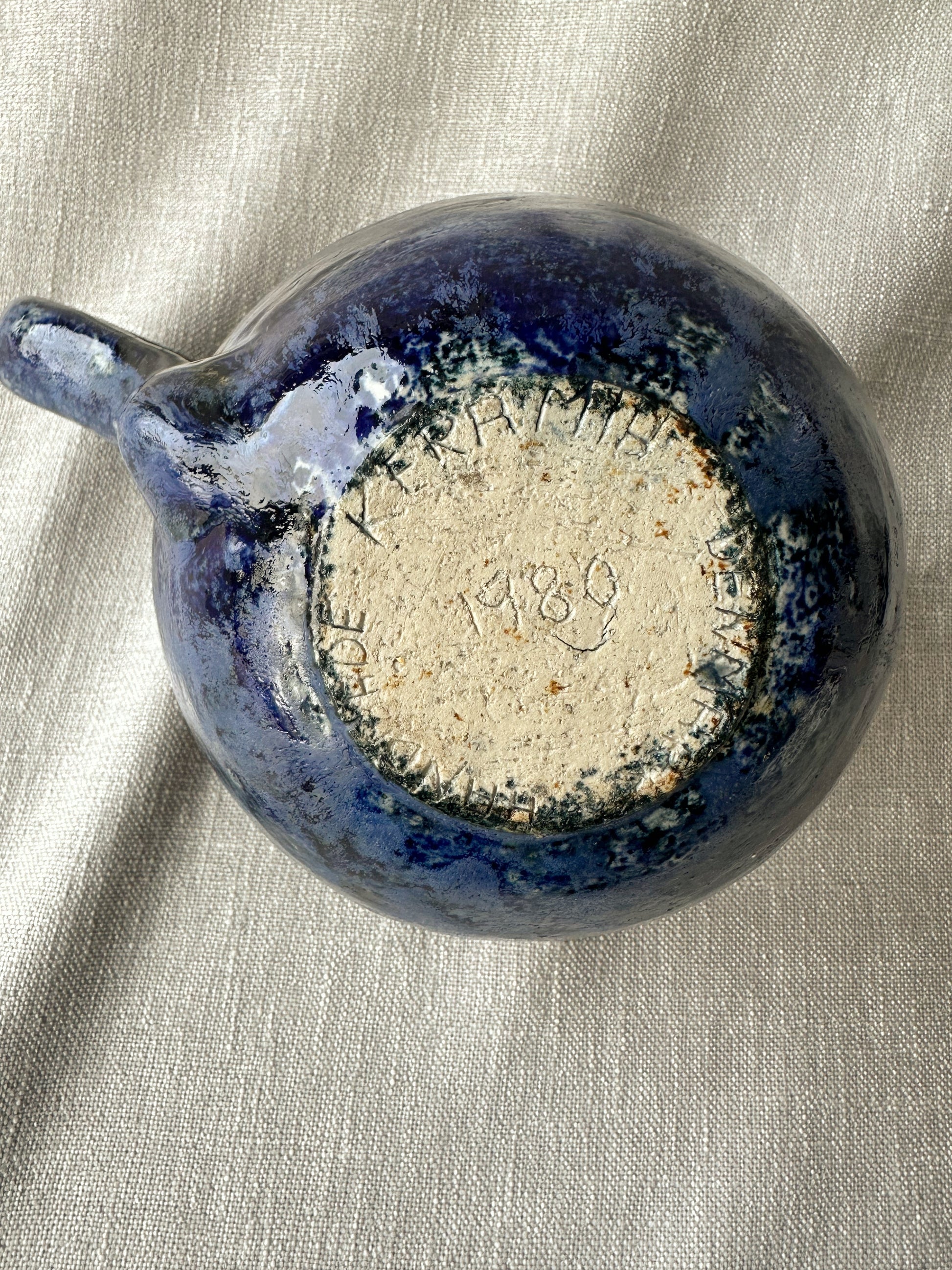 Vacker handgjord kanna från Danmark 1980. Servera bib-vinet ur denna med en liten servett knuten runt handtaget, eller kaffet, eller théet eller vattnet. Funkar även som kruka. Fint, fint, fint! Ca 13 cm hög och 16 cm i diameter. Ett litet nagg vid pipen, se bild.