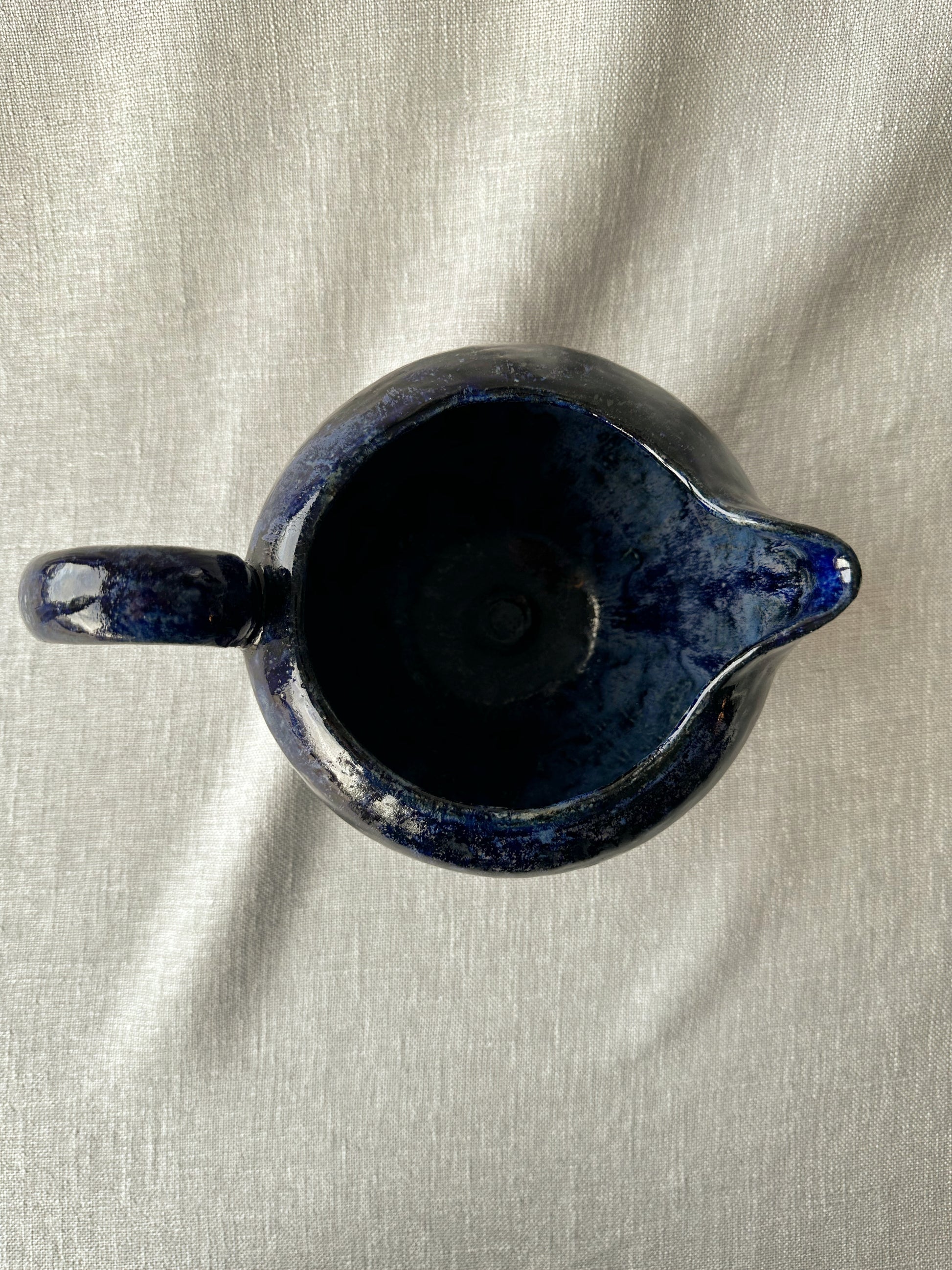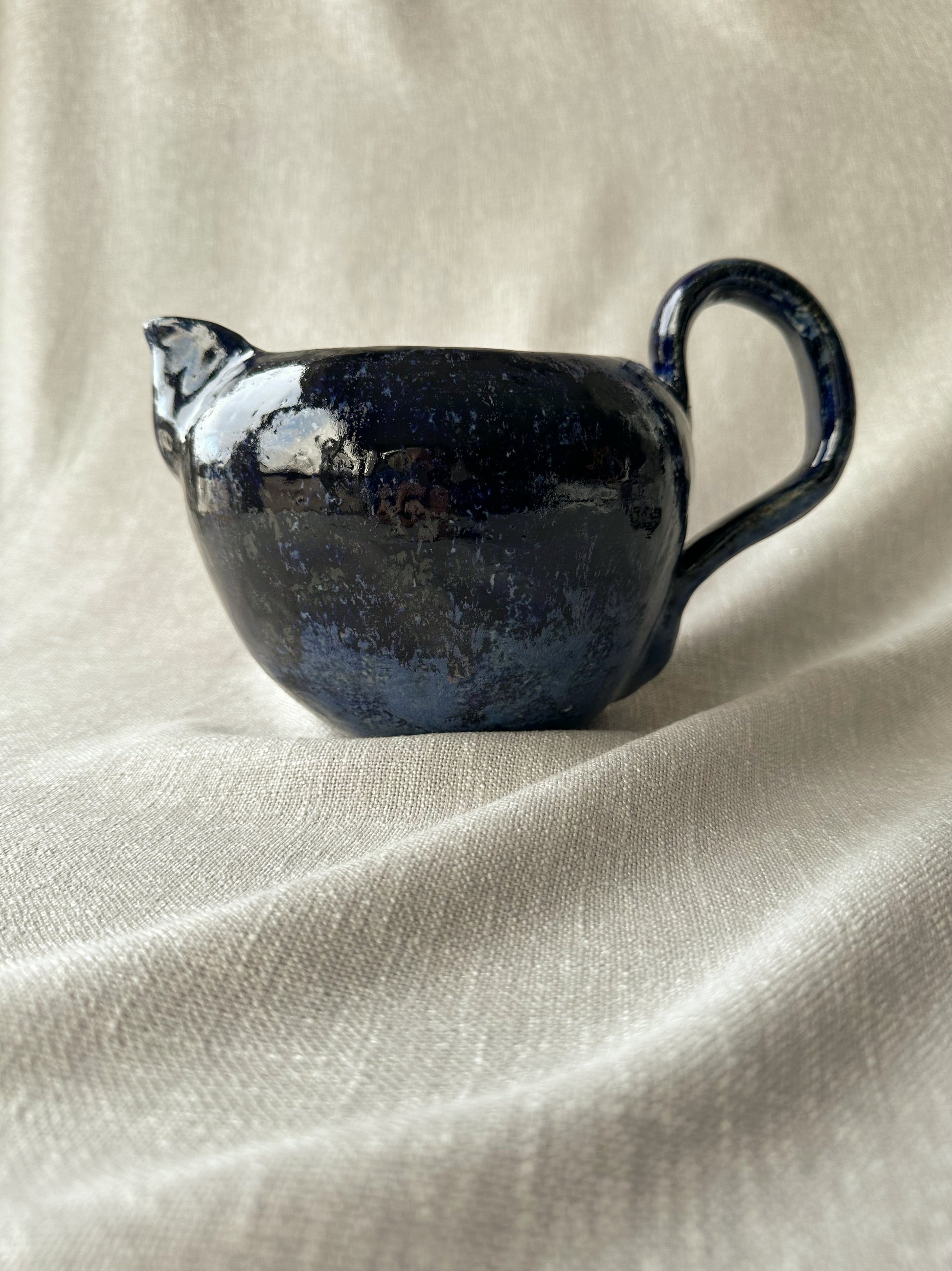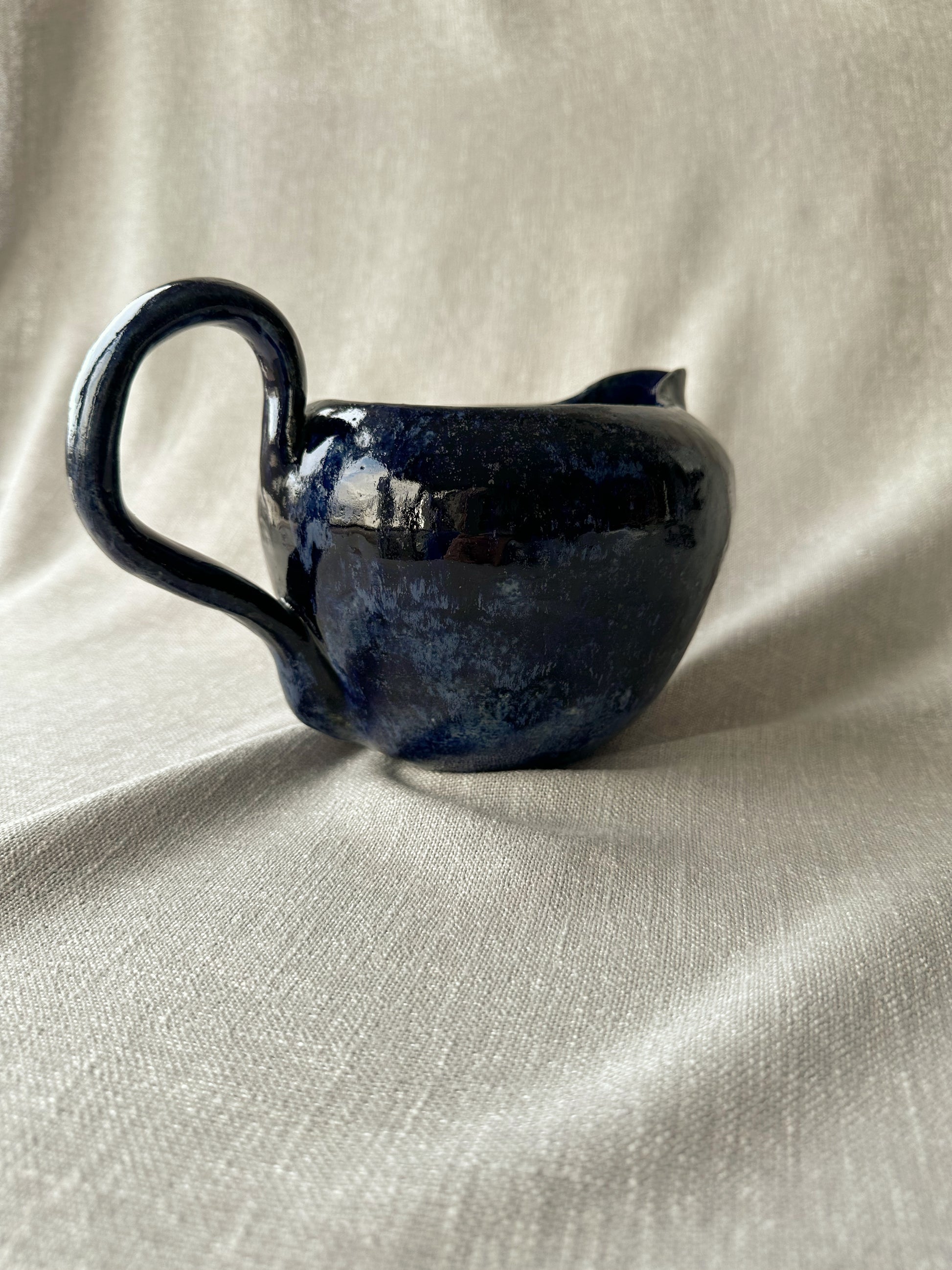 Vacker handgjord kanna från Danmark 1980. Servera bib-vinet ur denna med en liten servett knuten runt handtaget, eller kaffet, eller théet eller vattnet. Funkar även som kruka. Fint, fint, fint! Ca 13 cm hög och 16 cm i diameter. Ett litet nagg vid pipen, se bild.