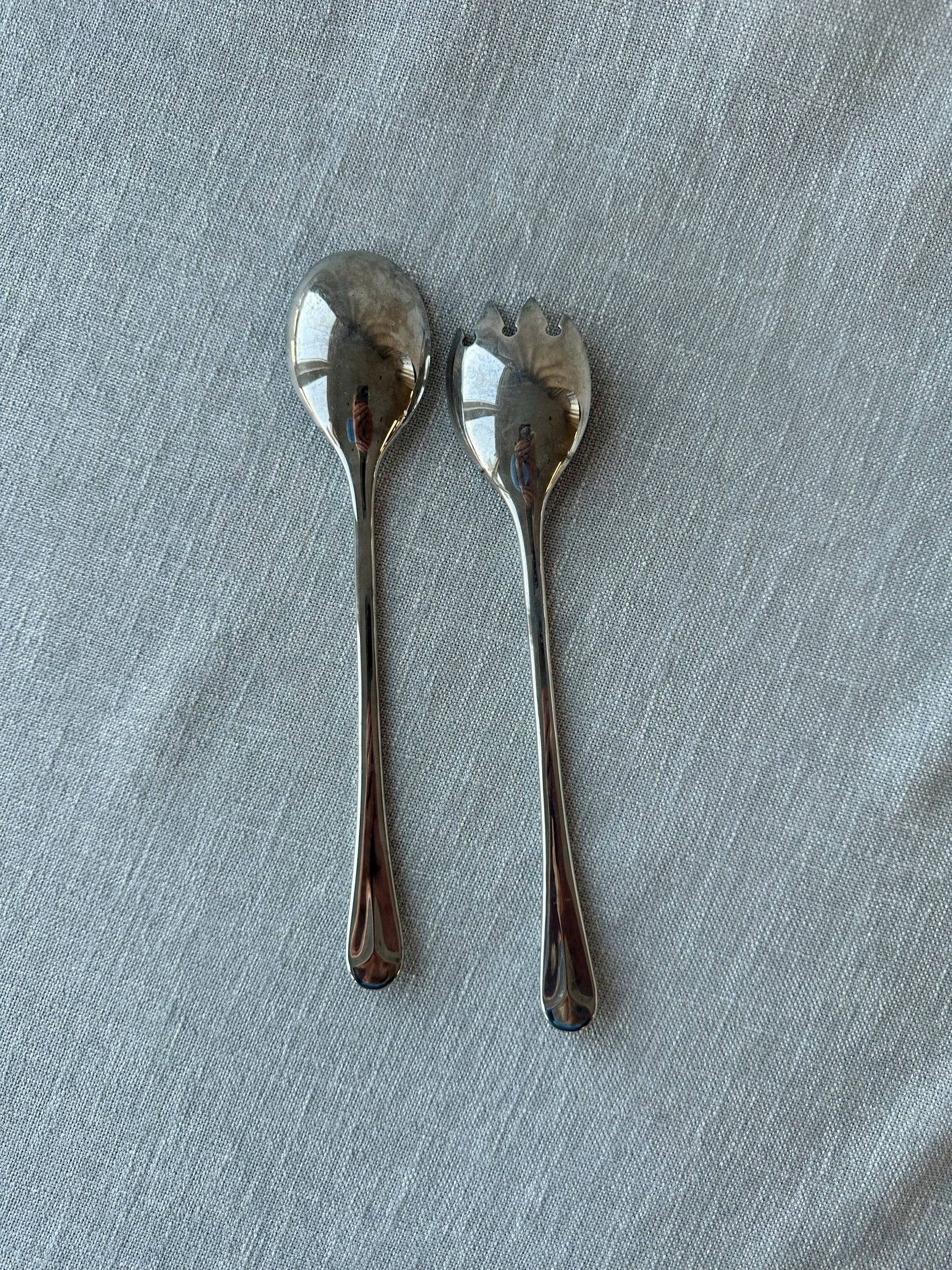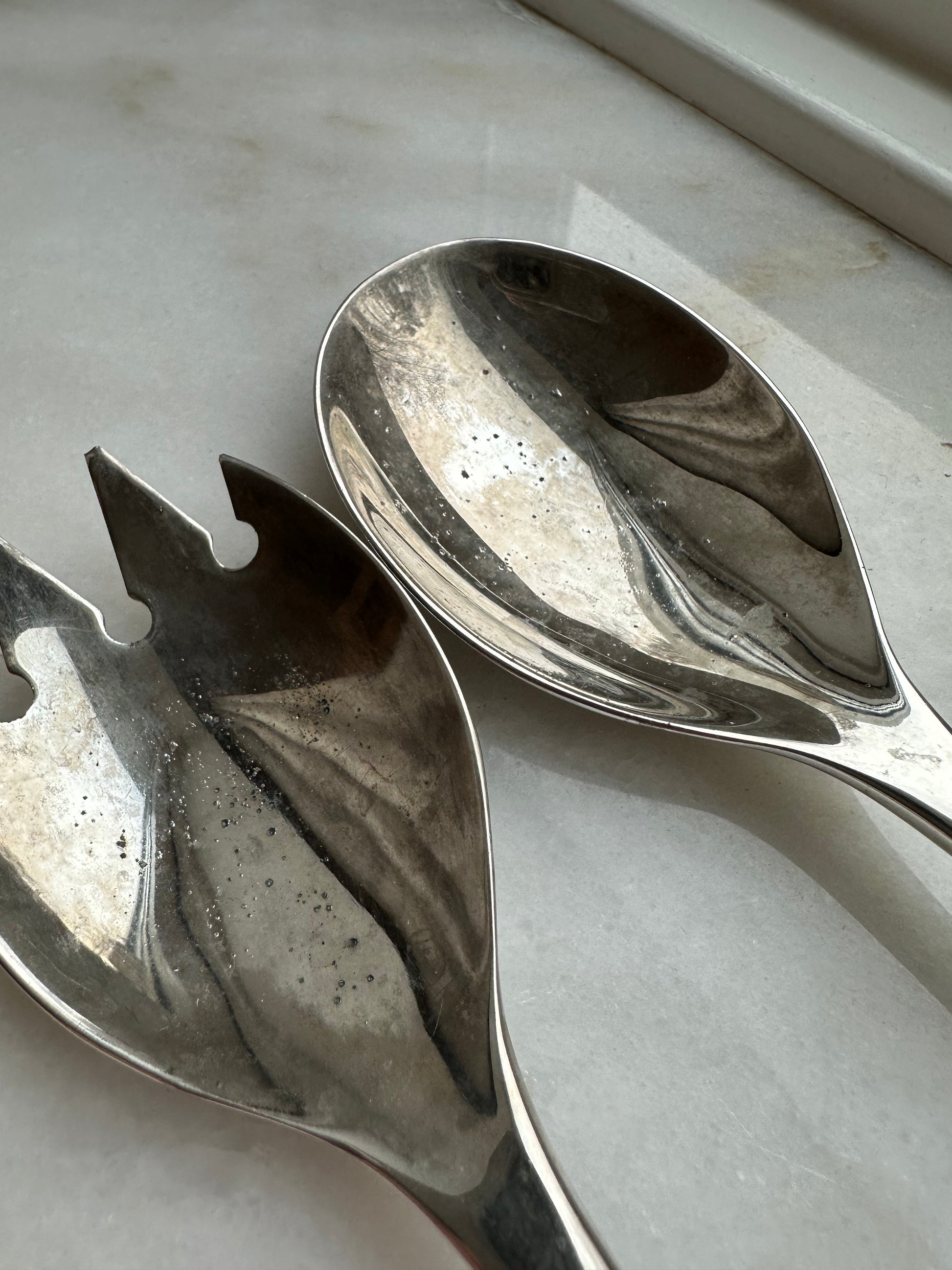 Nätta salladsbestick i nysilver med fin patina. 23 cm långa.