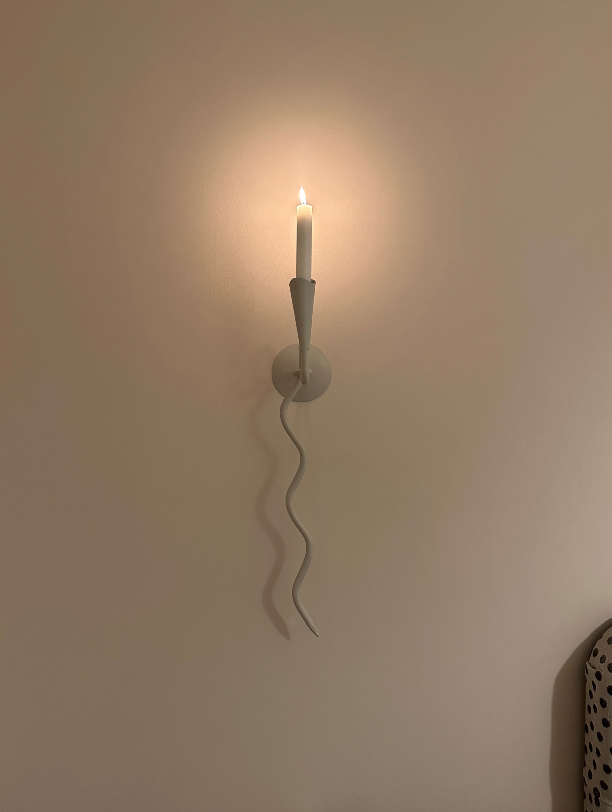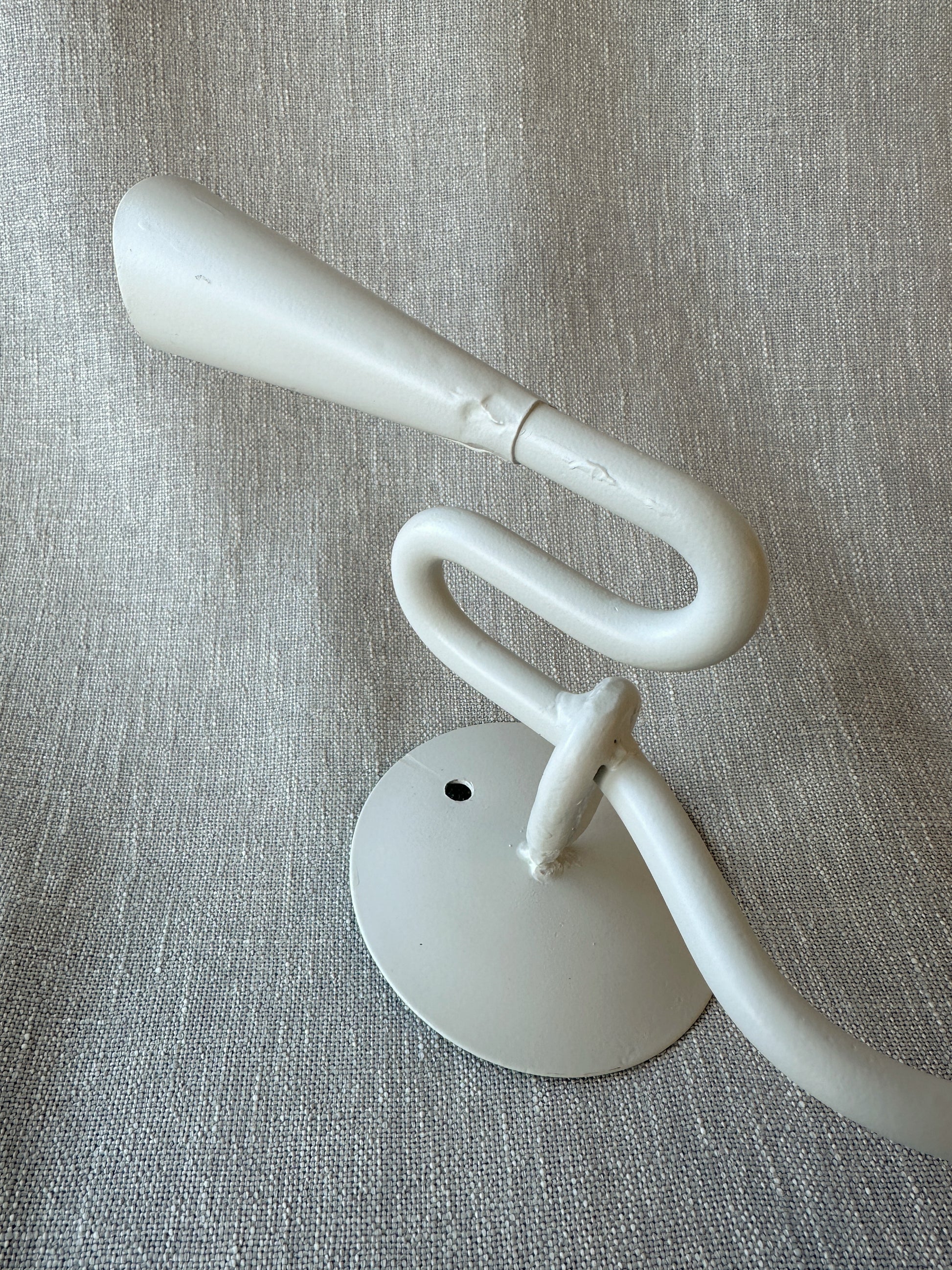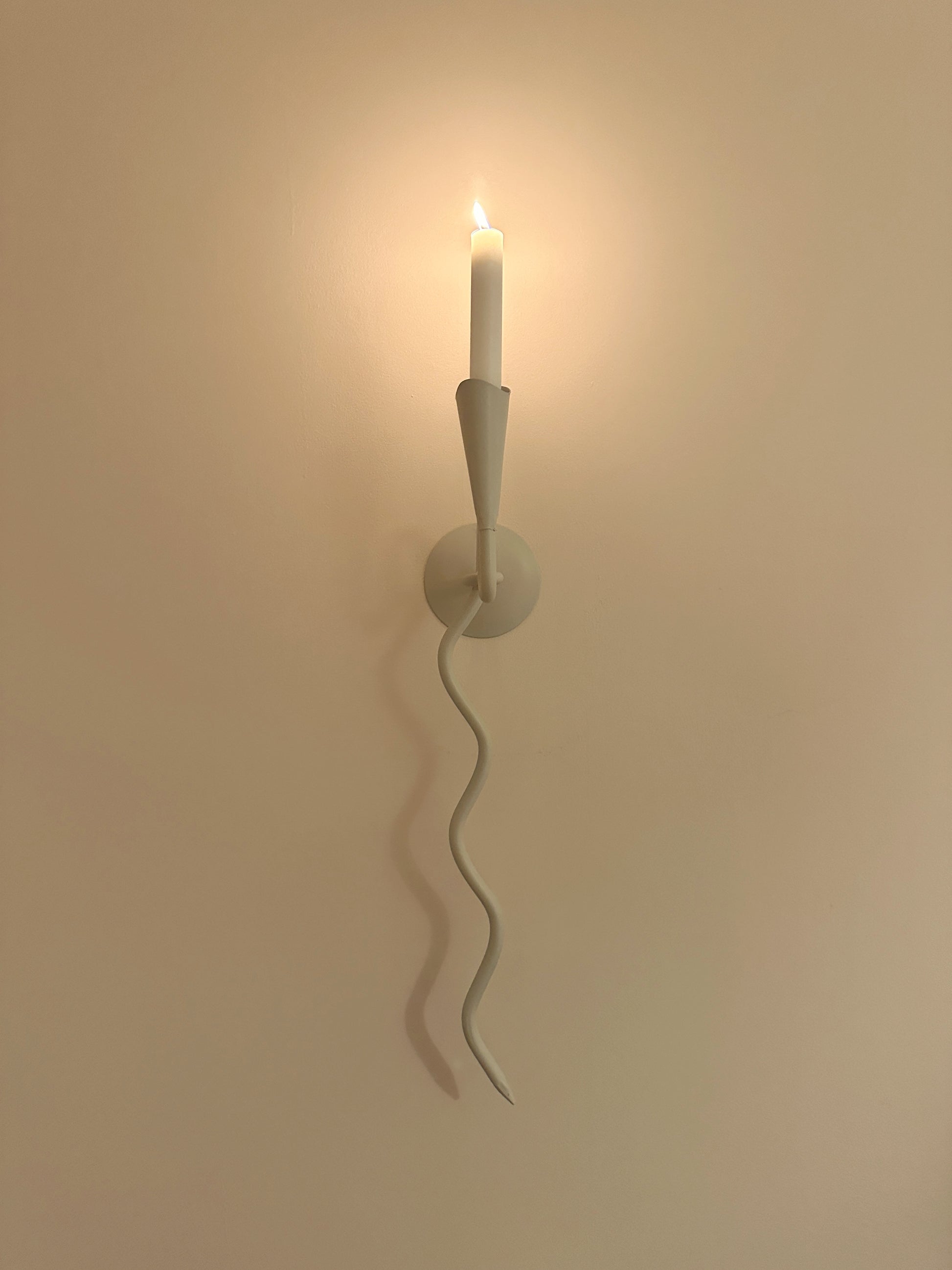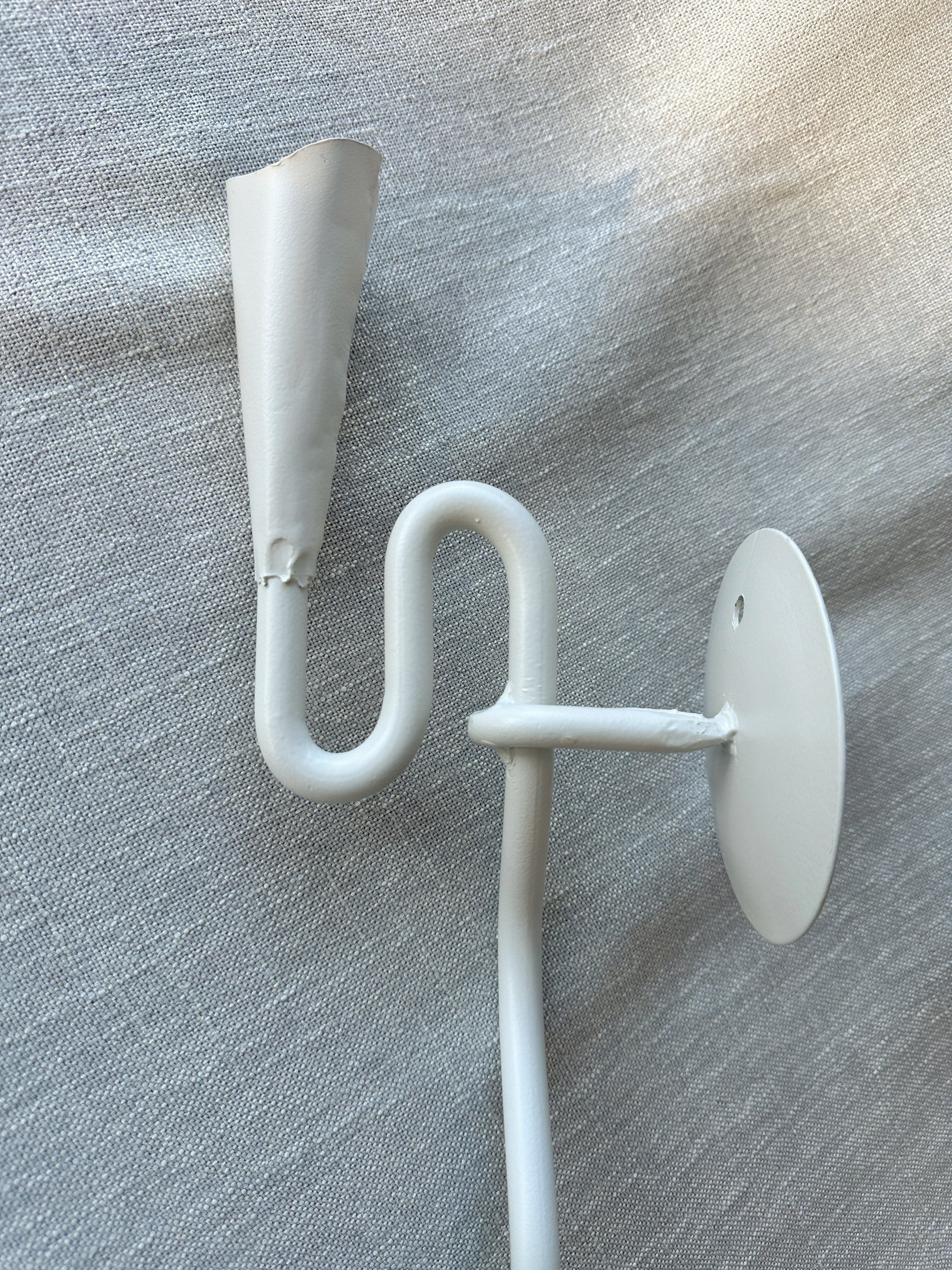 Vacker ljuslampett i smide måls i en ljus gråberget nyans. Storleken är 57 cm från topp till tå. En riktigt vacker pjäs!