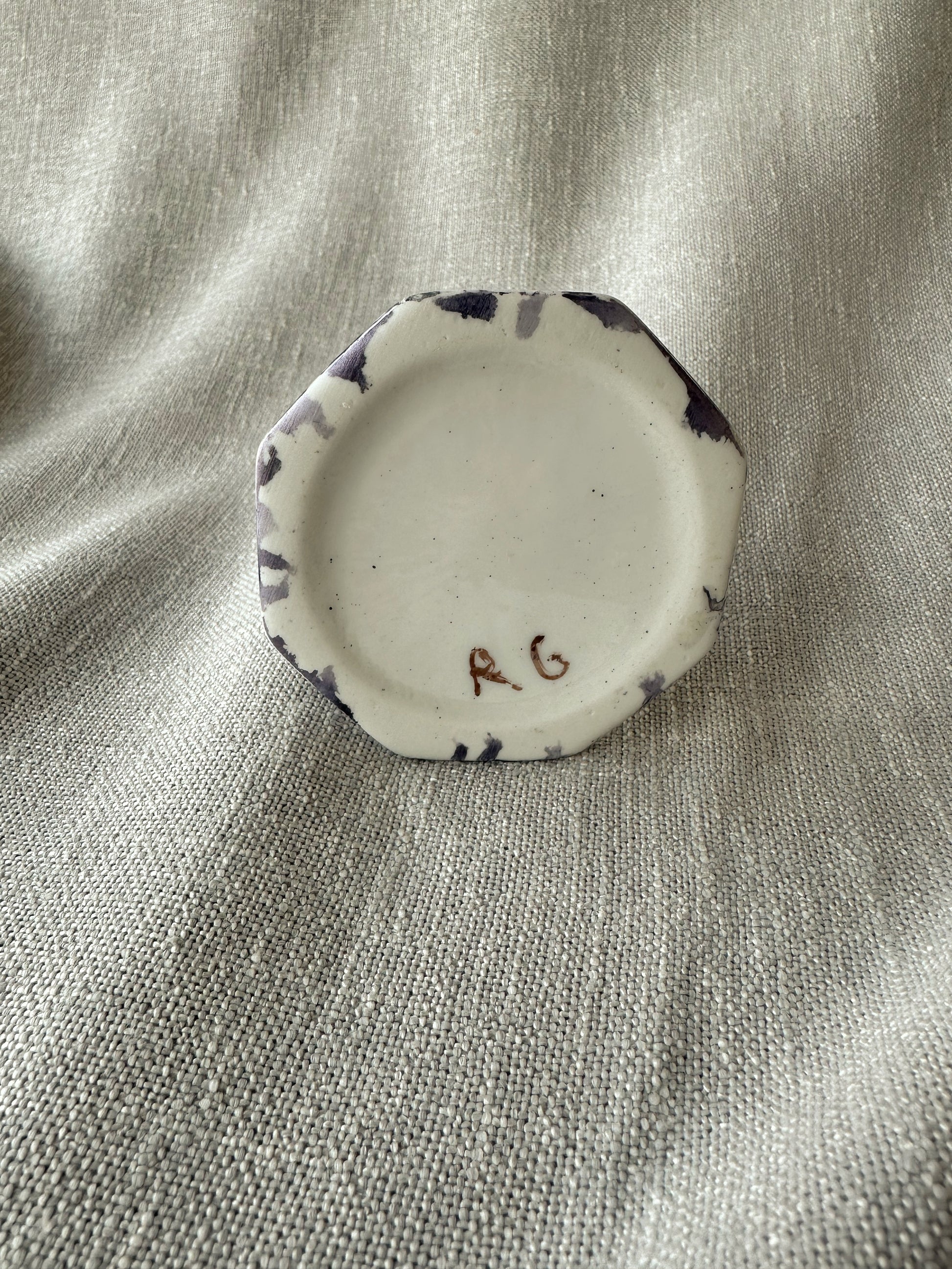 Vackert målad ljusstake i porslin. 8 cm hög och 7,5 cm i diameter. Lite stearin kvar i.