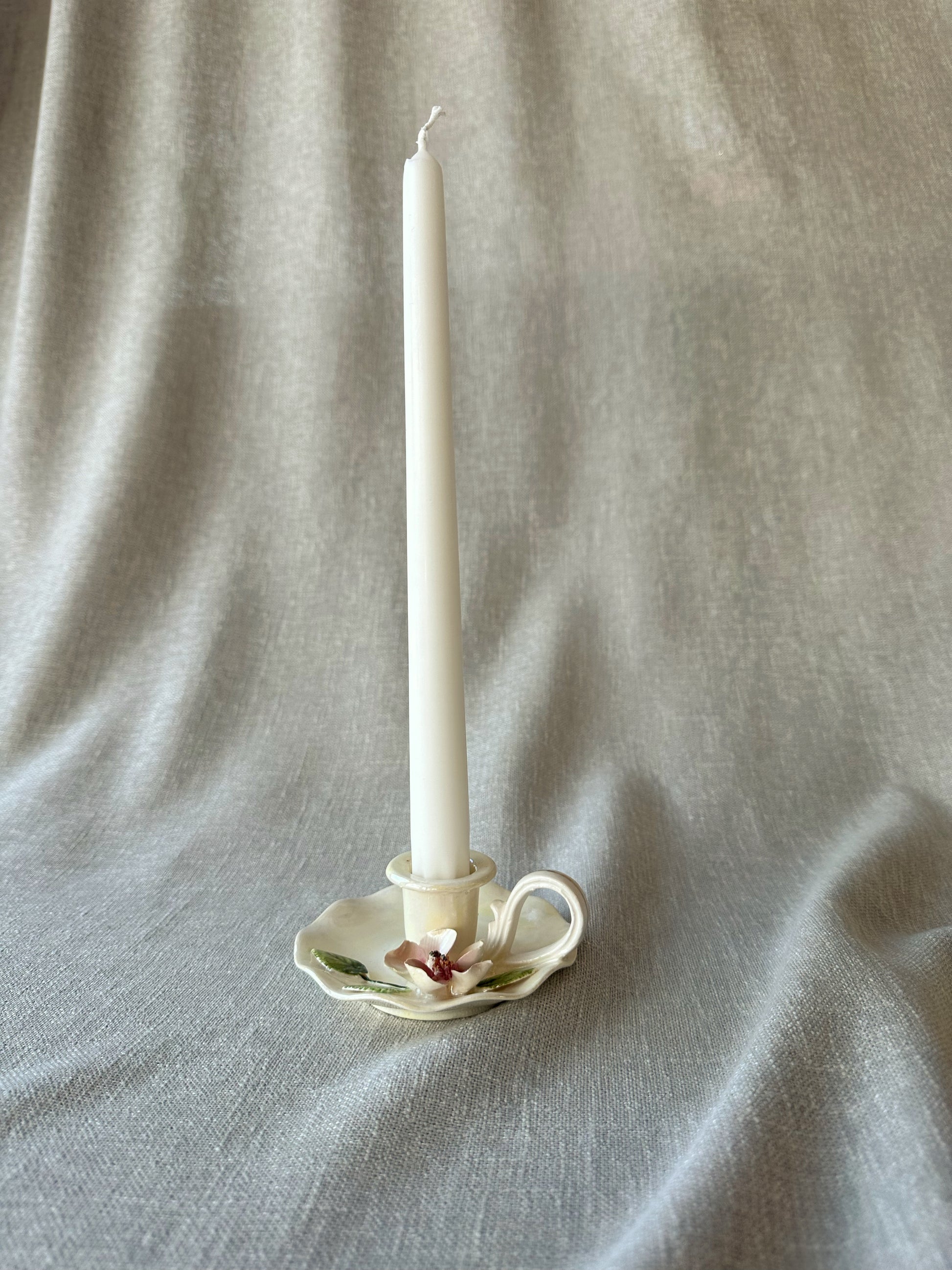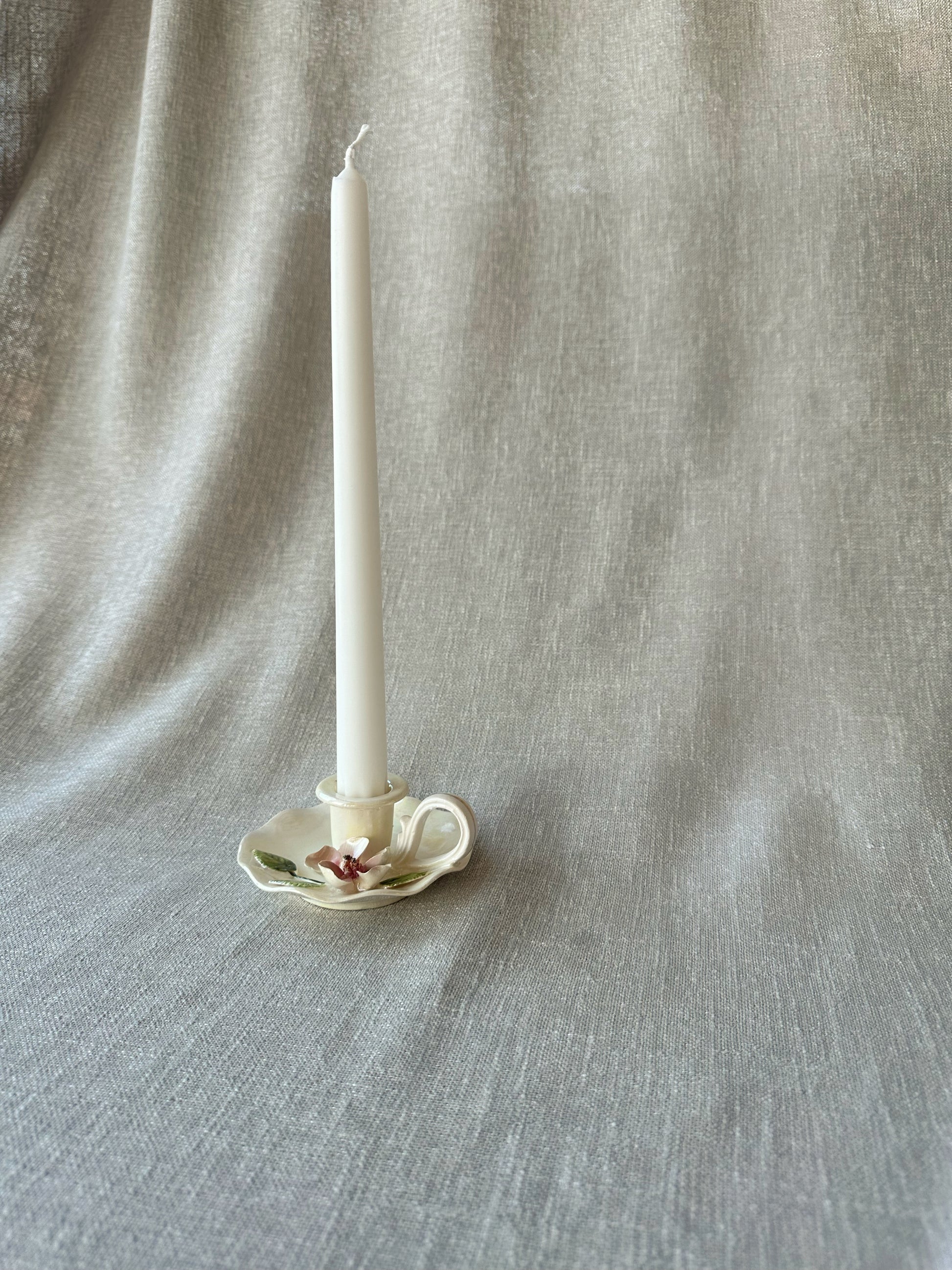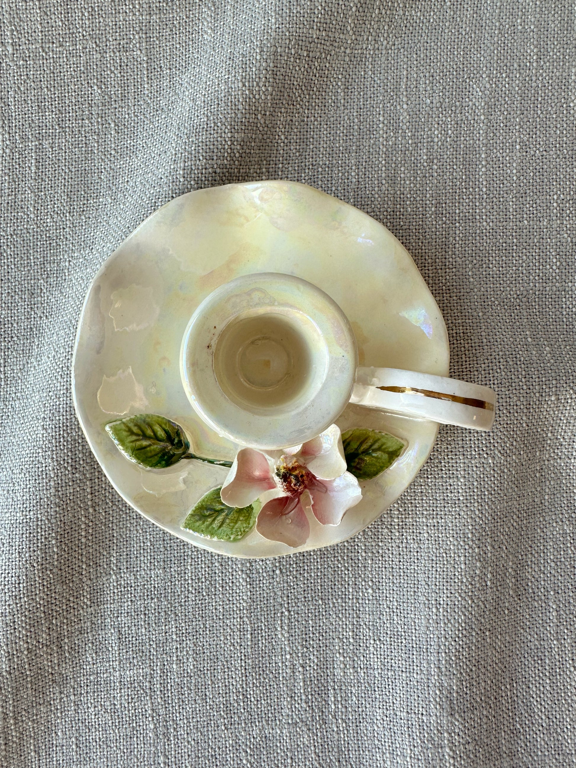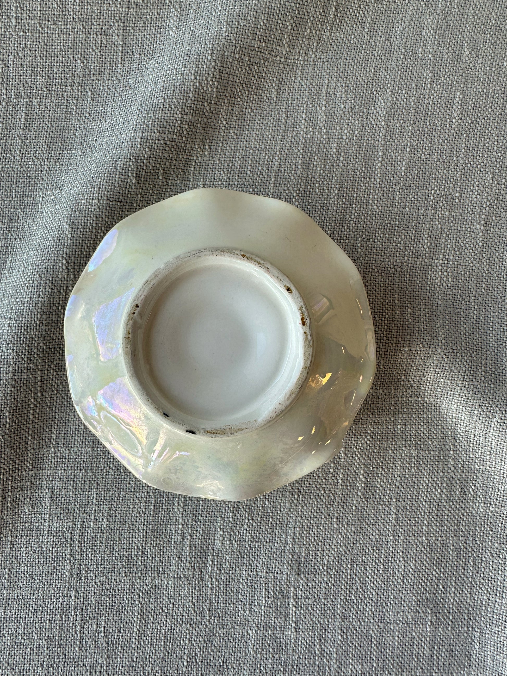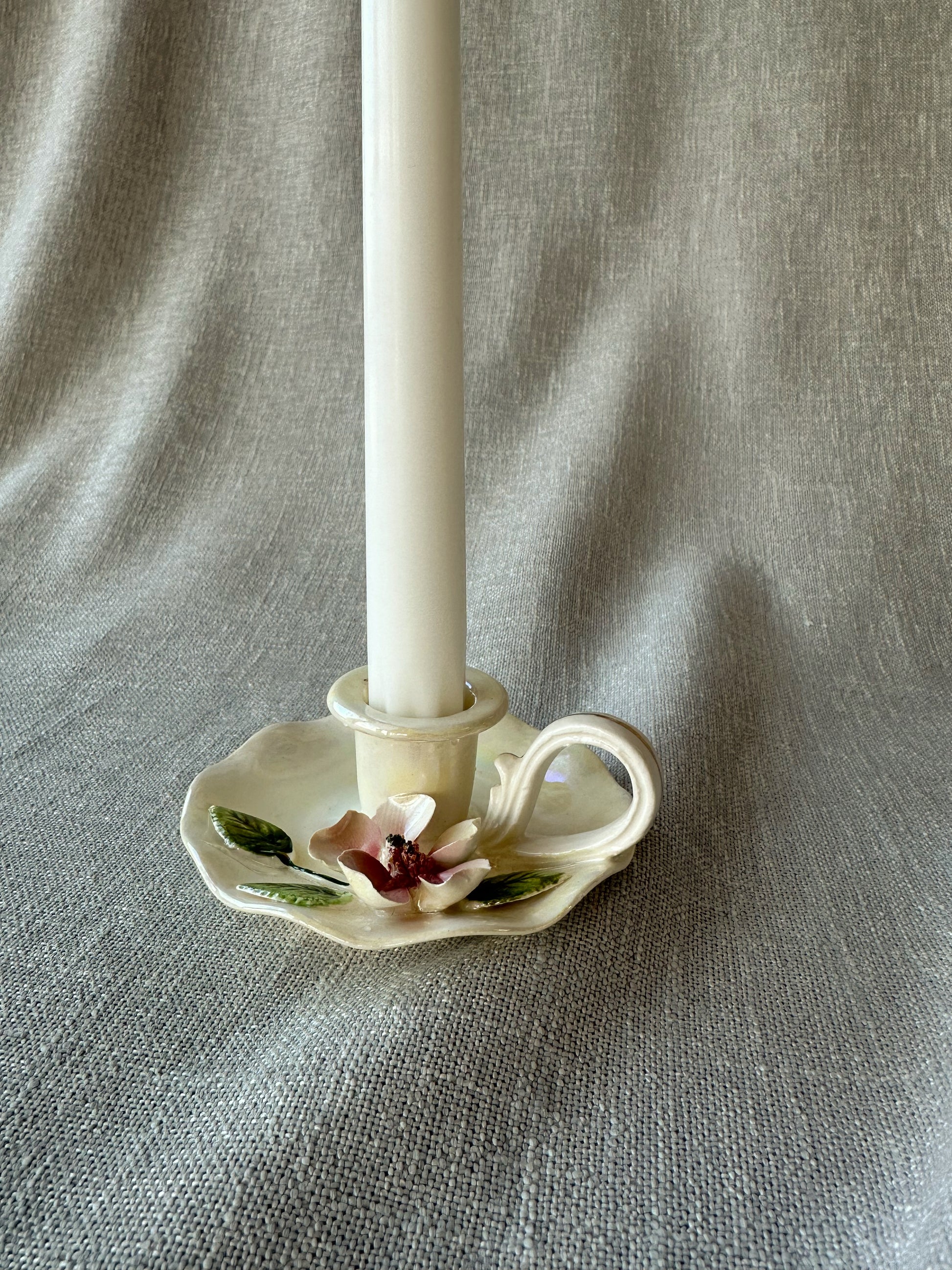 Unik liten nattljusstake i vackert pärlemorskimmer med en rosaskimrande blomma och blad på. Fint vintageskick med några små skrapmärken. Ca 10,5 cm i diameter.
