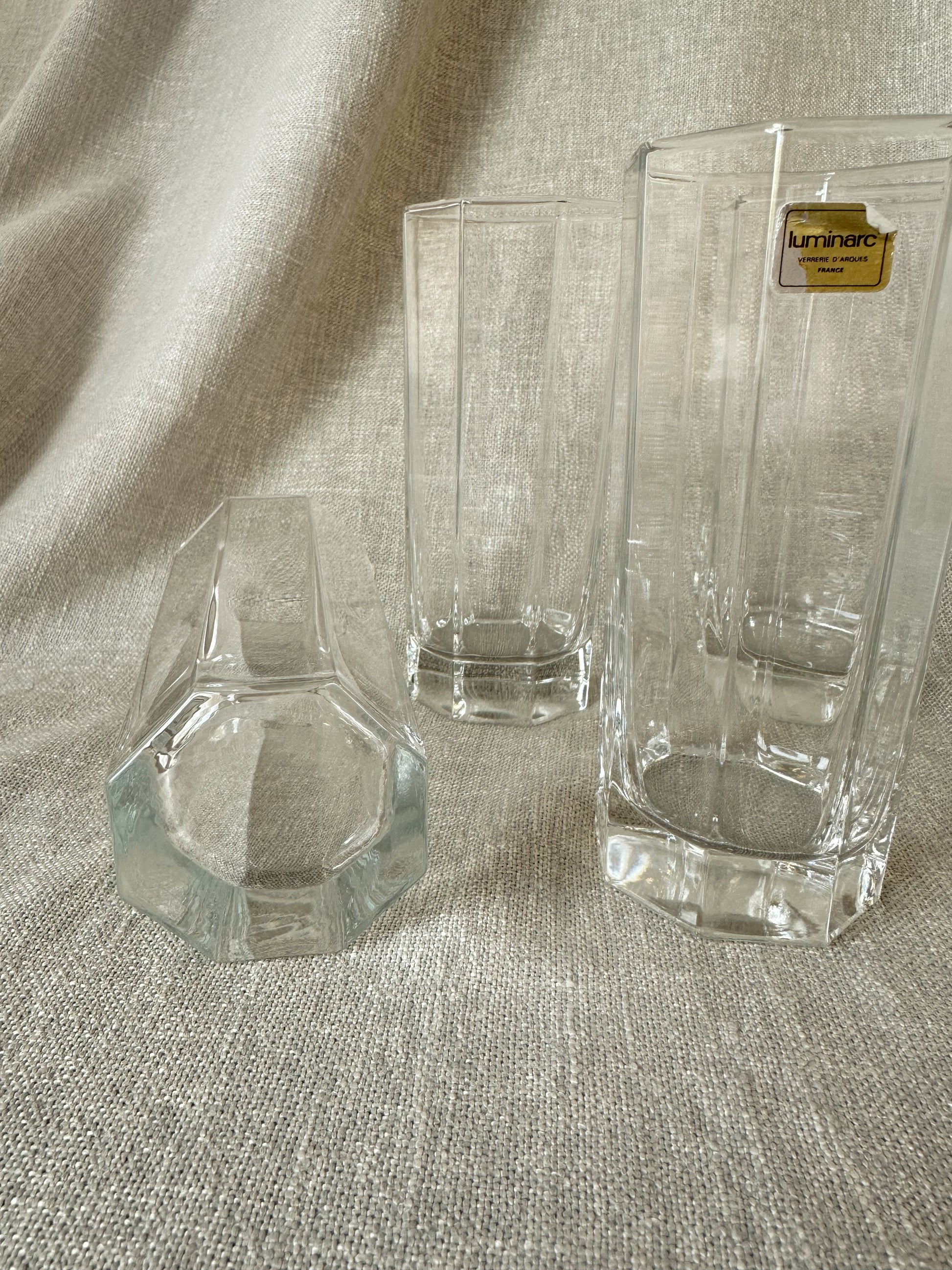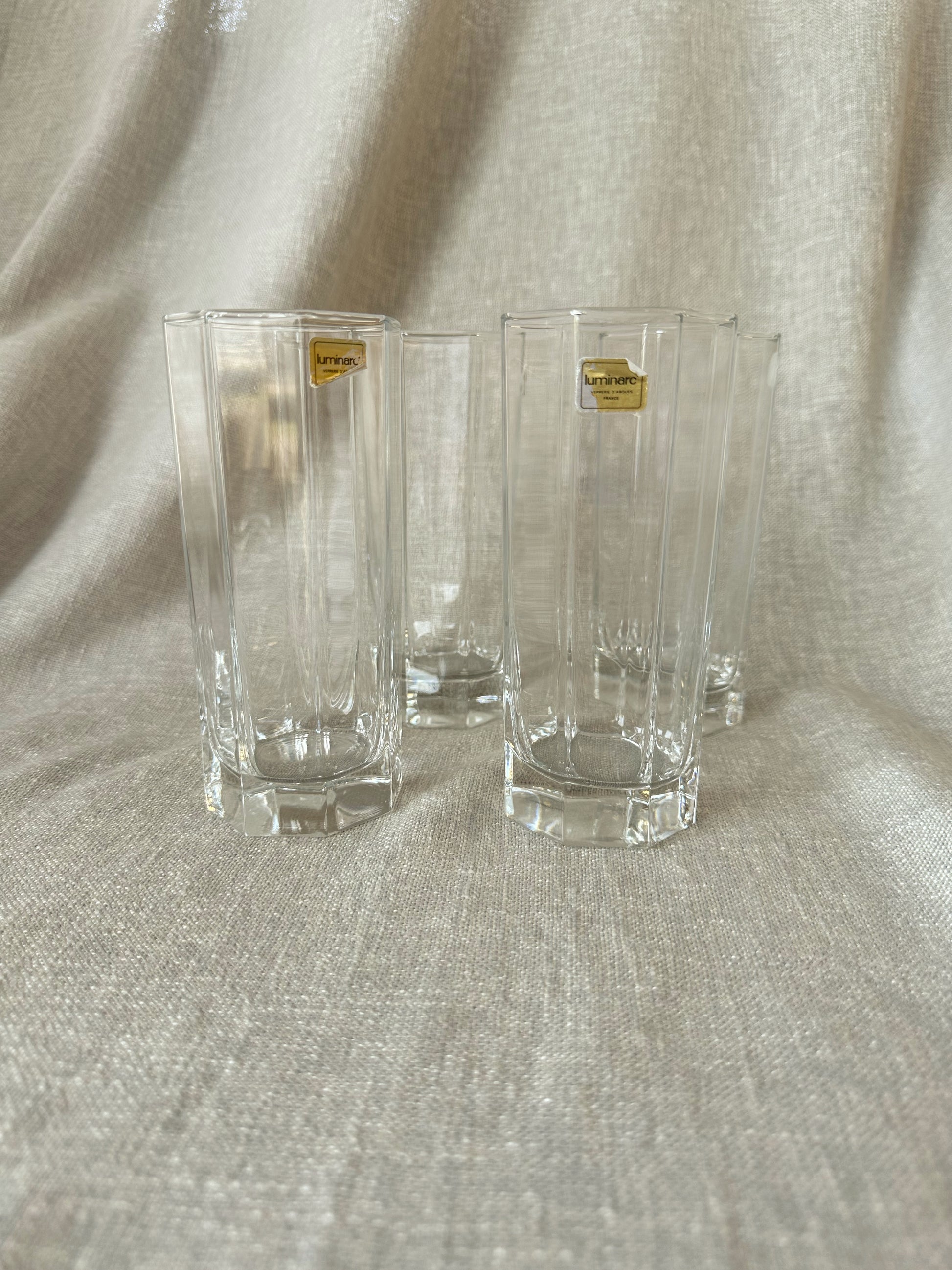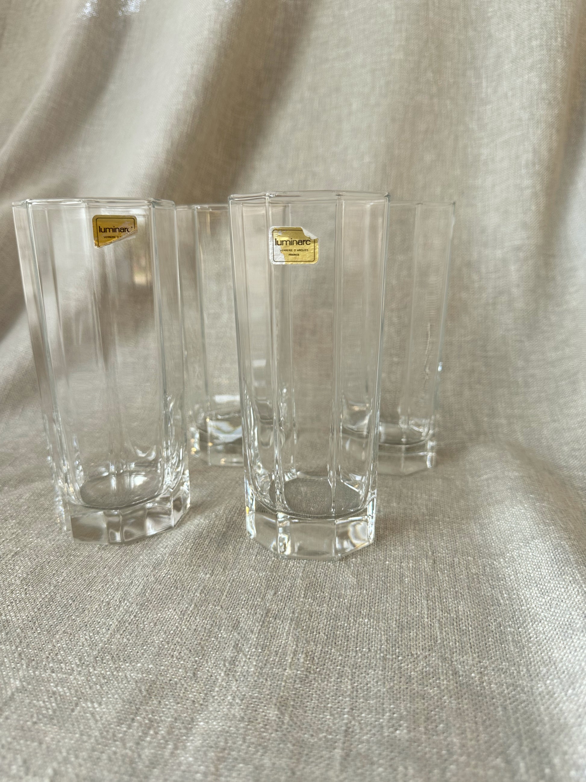 Set om 4 st oktagonformade glas från franska Luminarc. Ljuvliga att servera GT i! Stroleken är 14,5 cm höga och 6,5 cm i diameter. Felfritt skick!