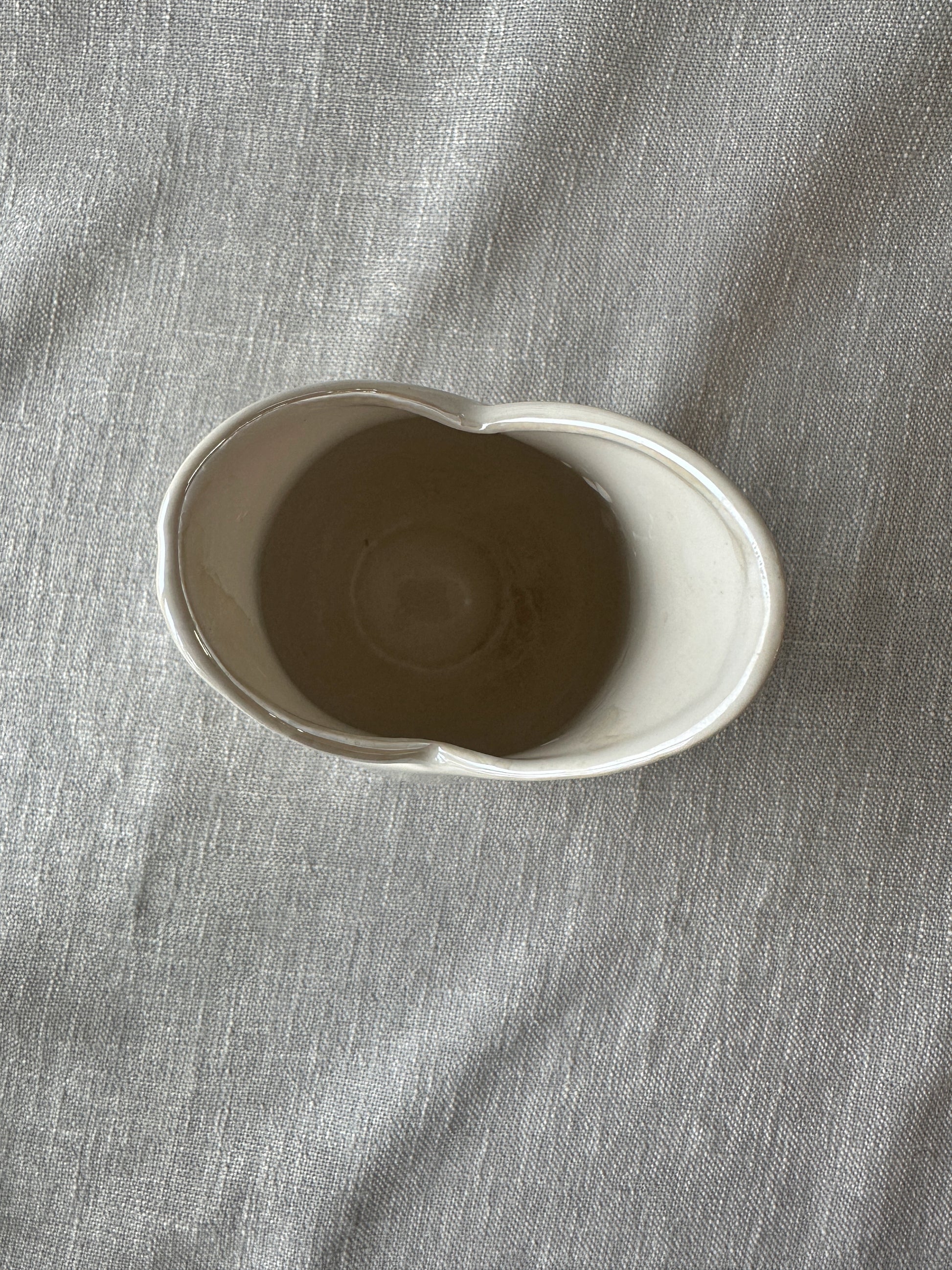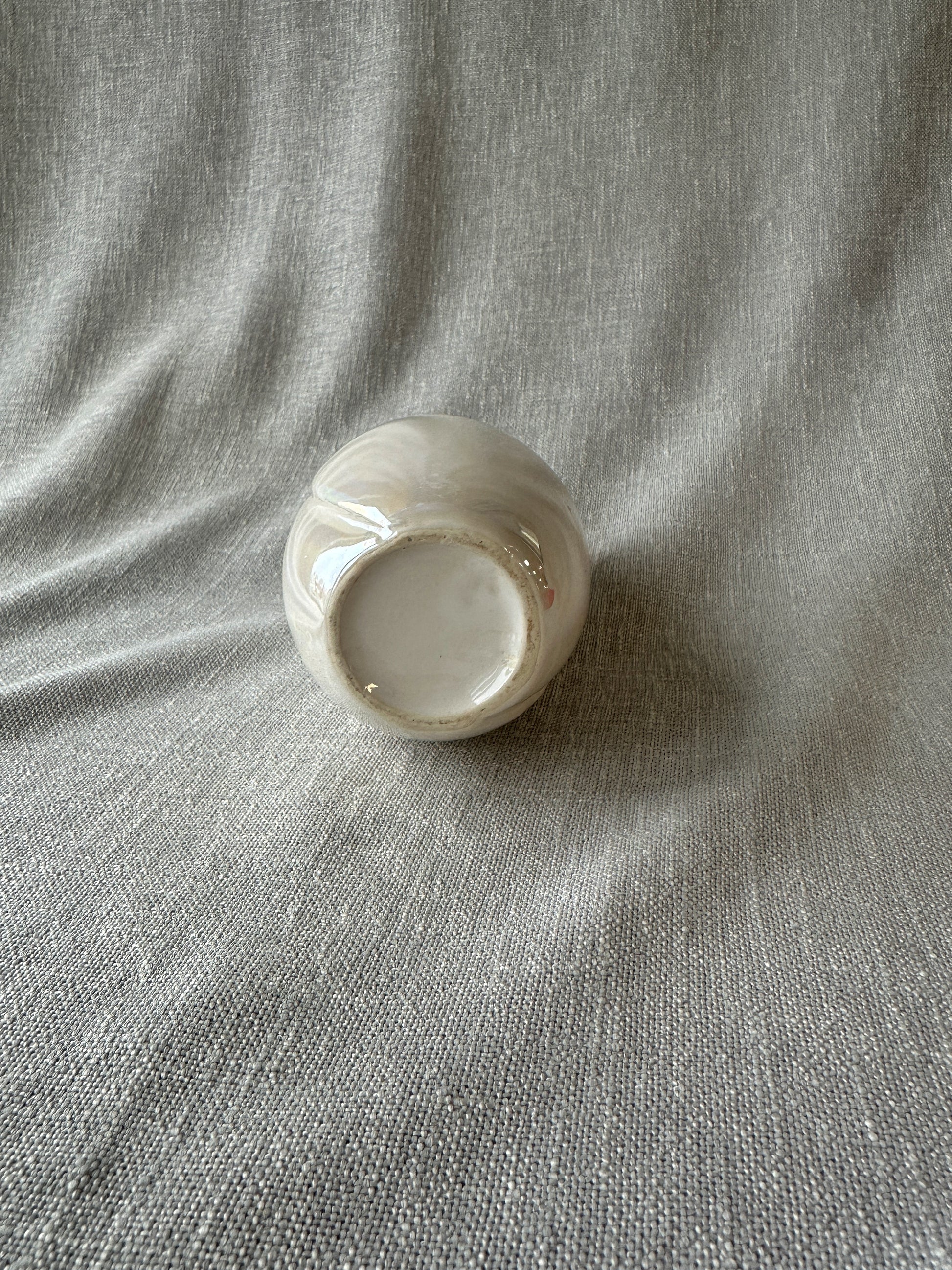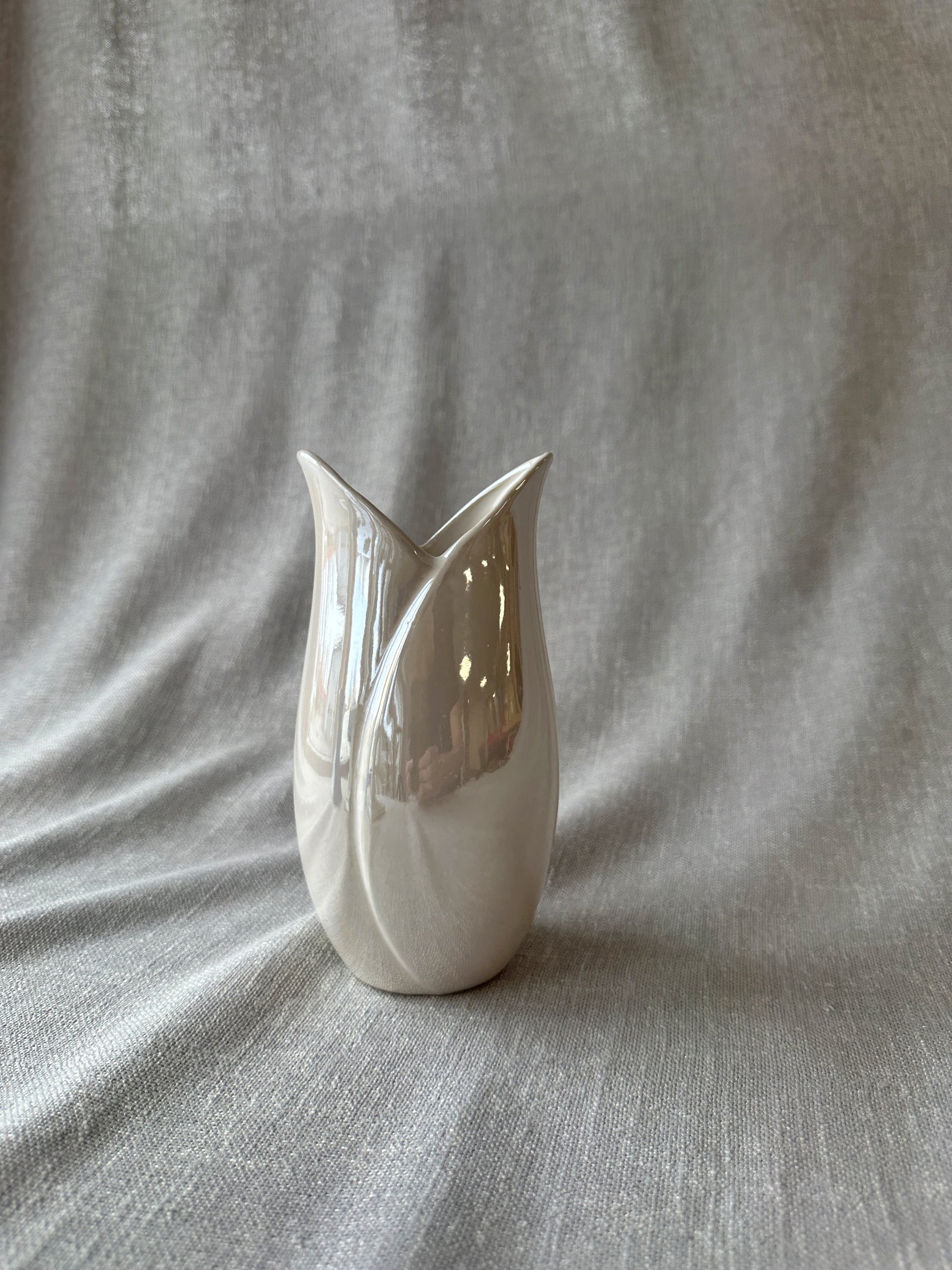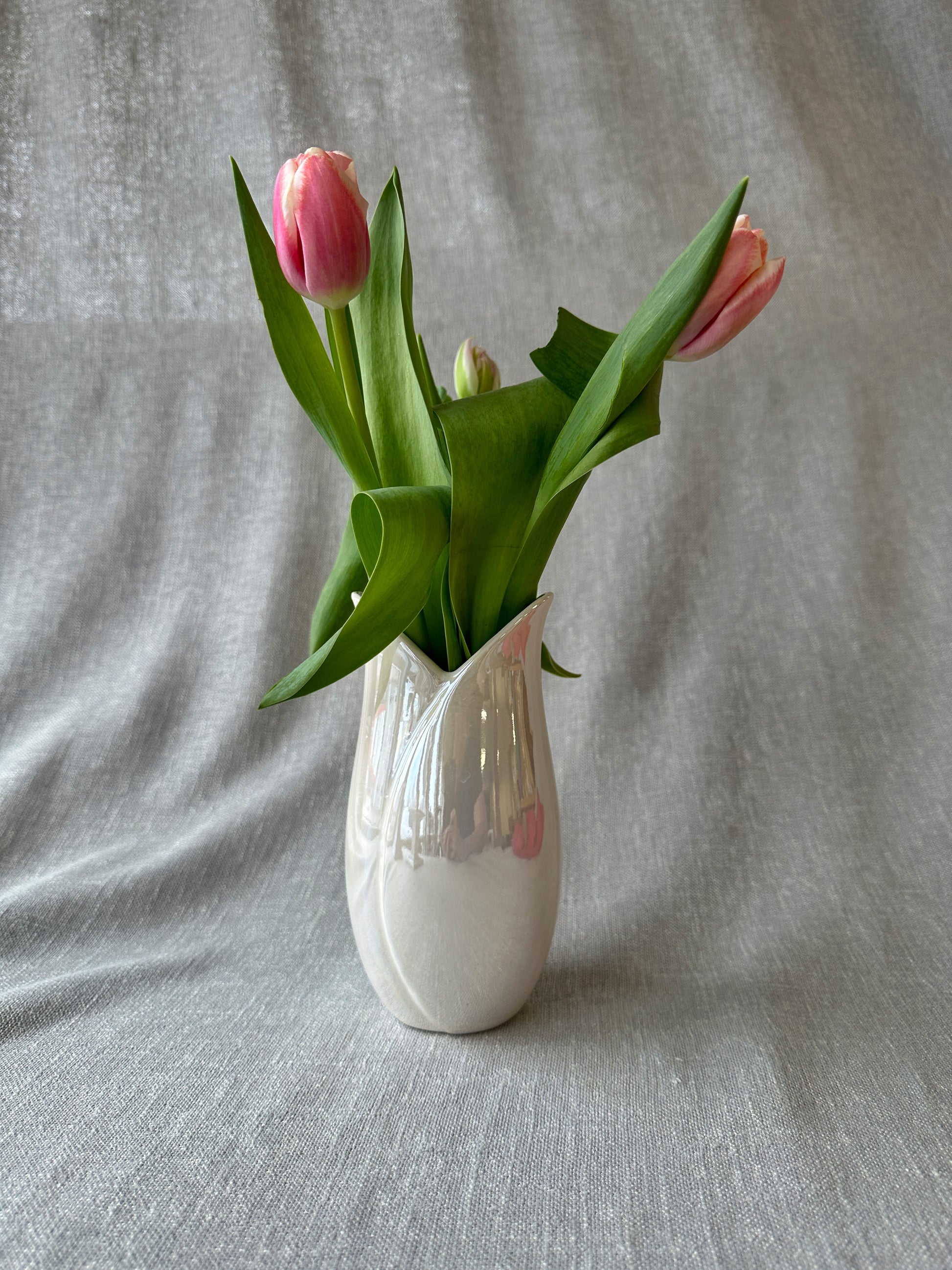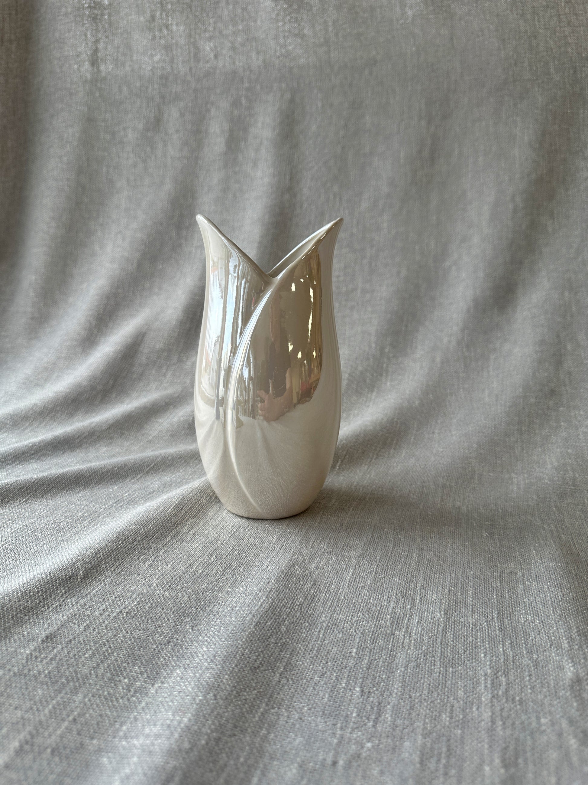 Söt liten pärlemorskimrande vas. Ca 16 cm hög och 7 cm bred. Fint vintageskick med några ytrepor och lite smuts i inuti.