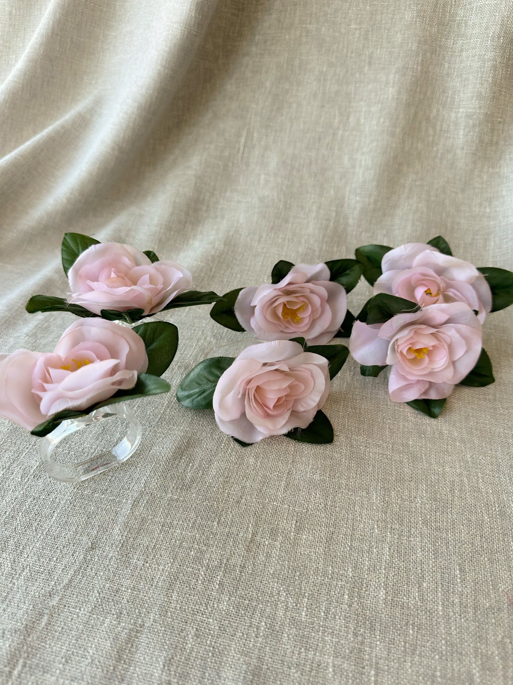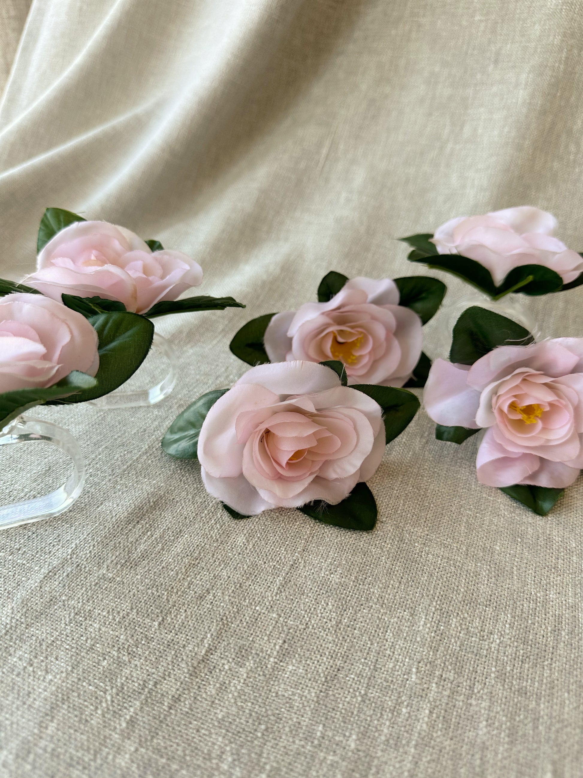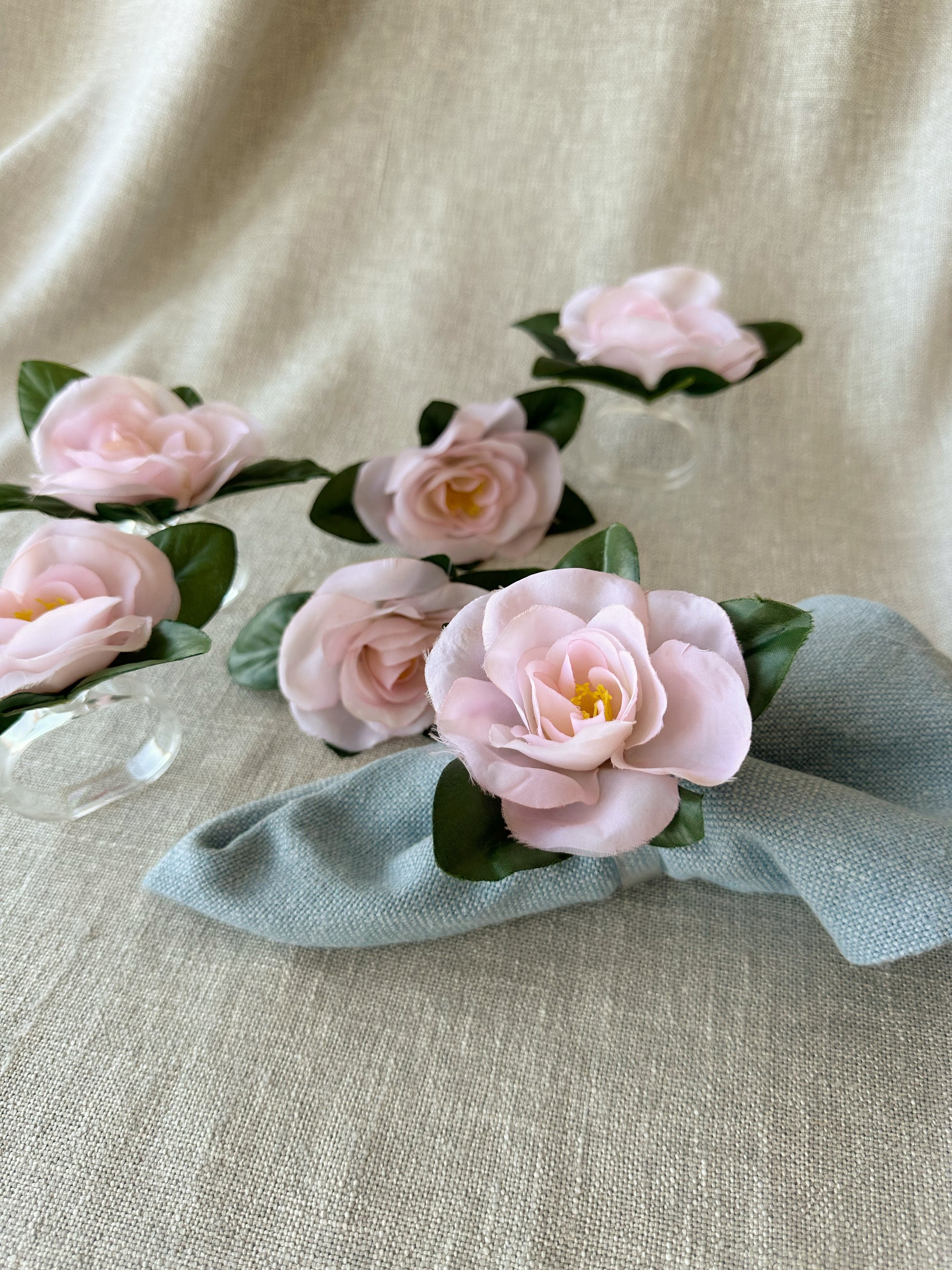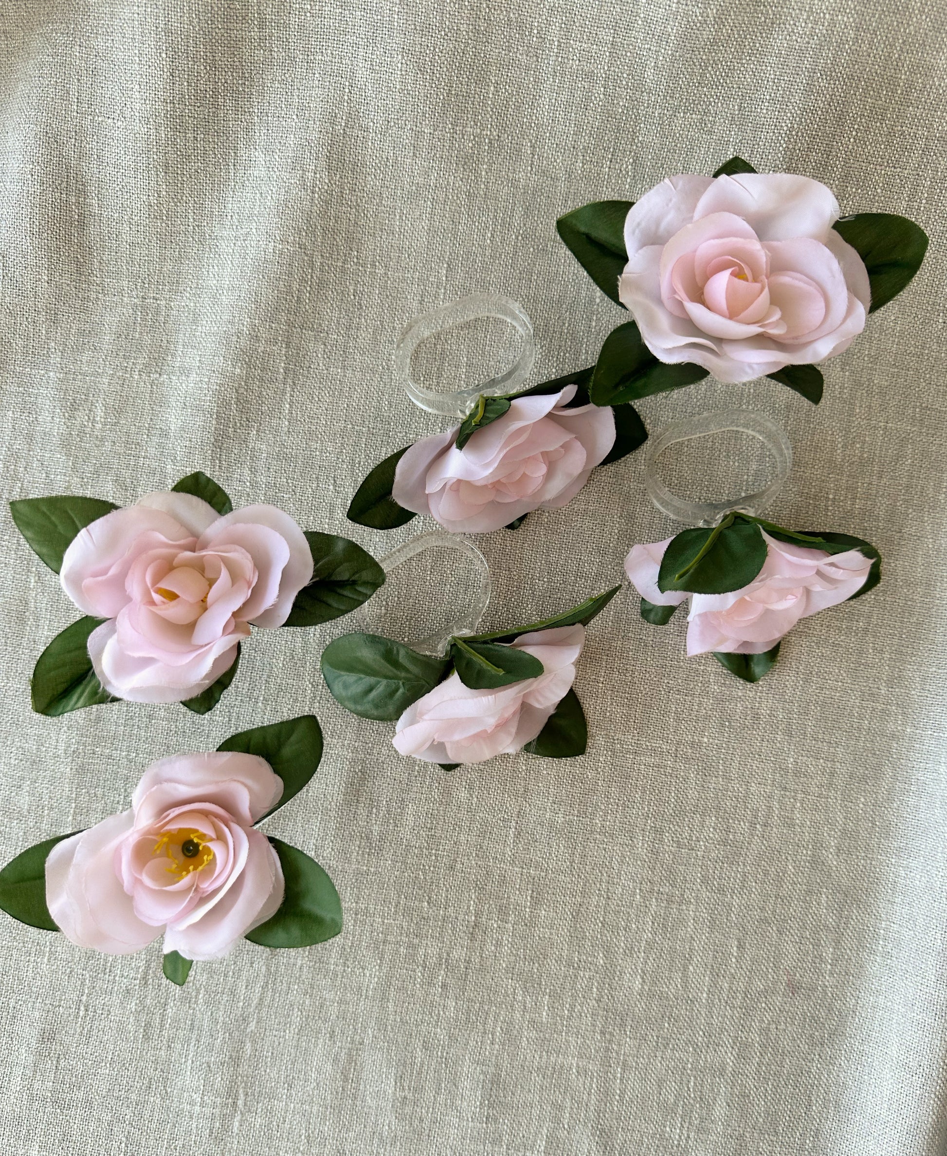 Set om 6 st underbara servettringar i tyg med rosa blommor och gröna blad. Lite galna men samtidigt så otroligt vackra i rätt sammanhang! Superfint vintage skick.