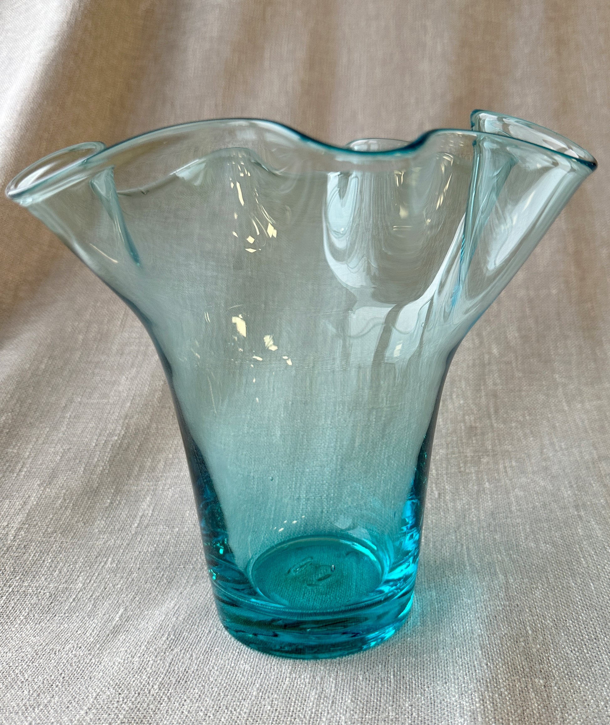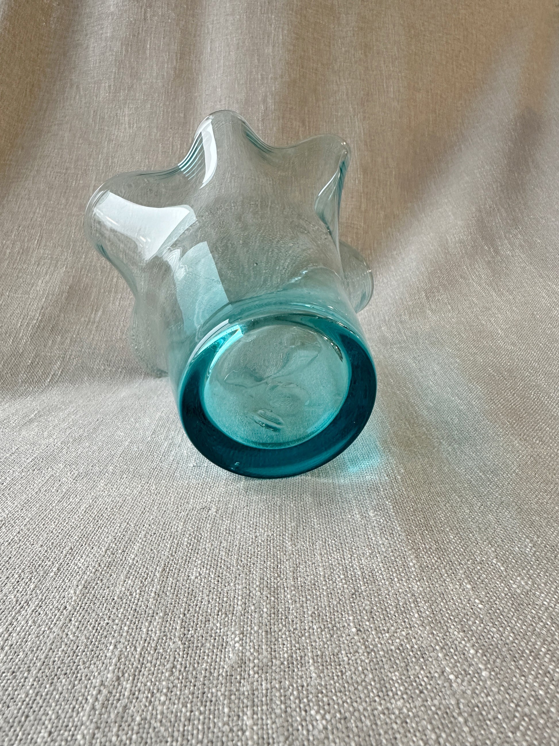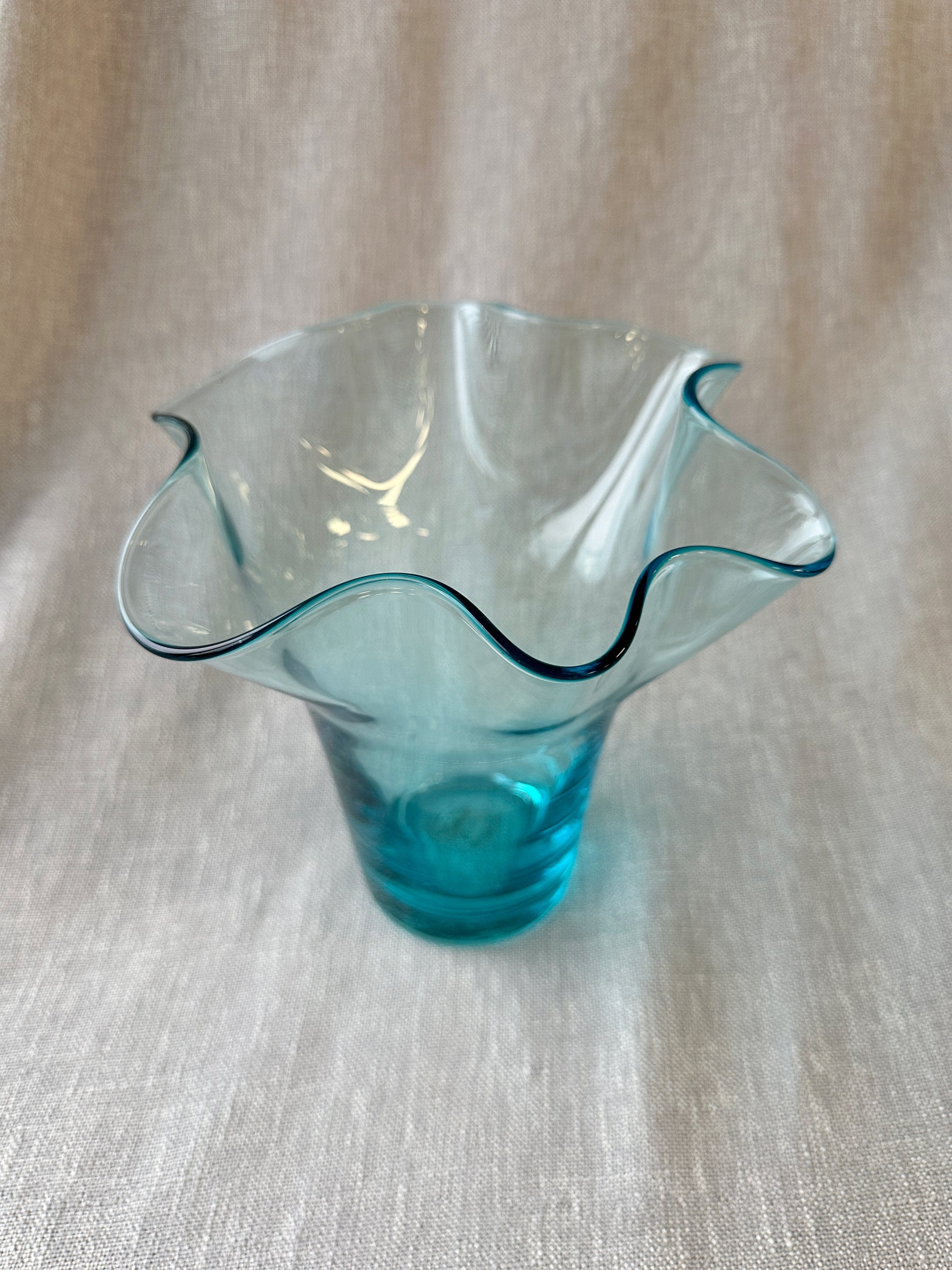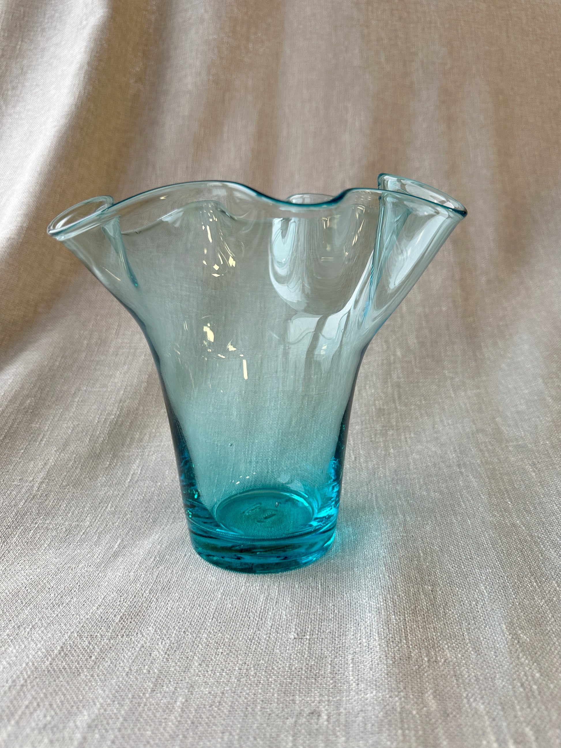 Vacker munblåst vas med vågig kant i en vacker blå nyans. Perfekt för tulpaner men även andra blommor.