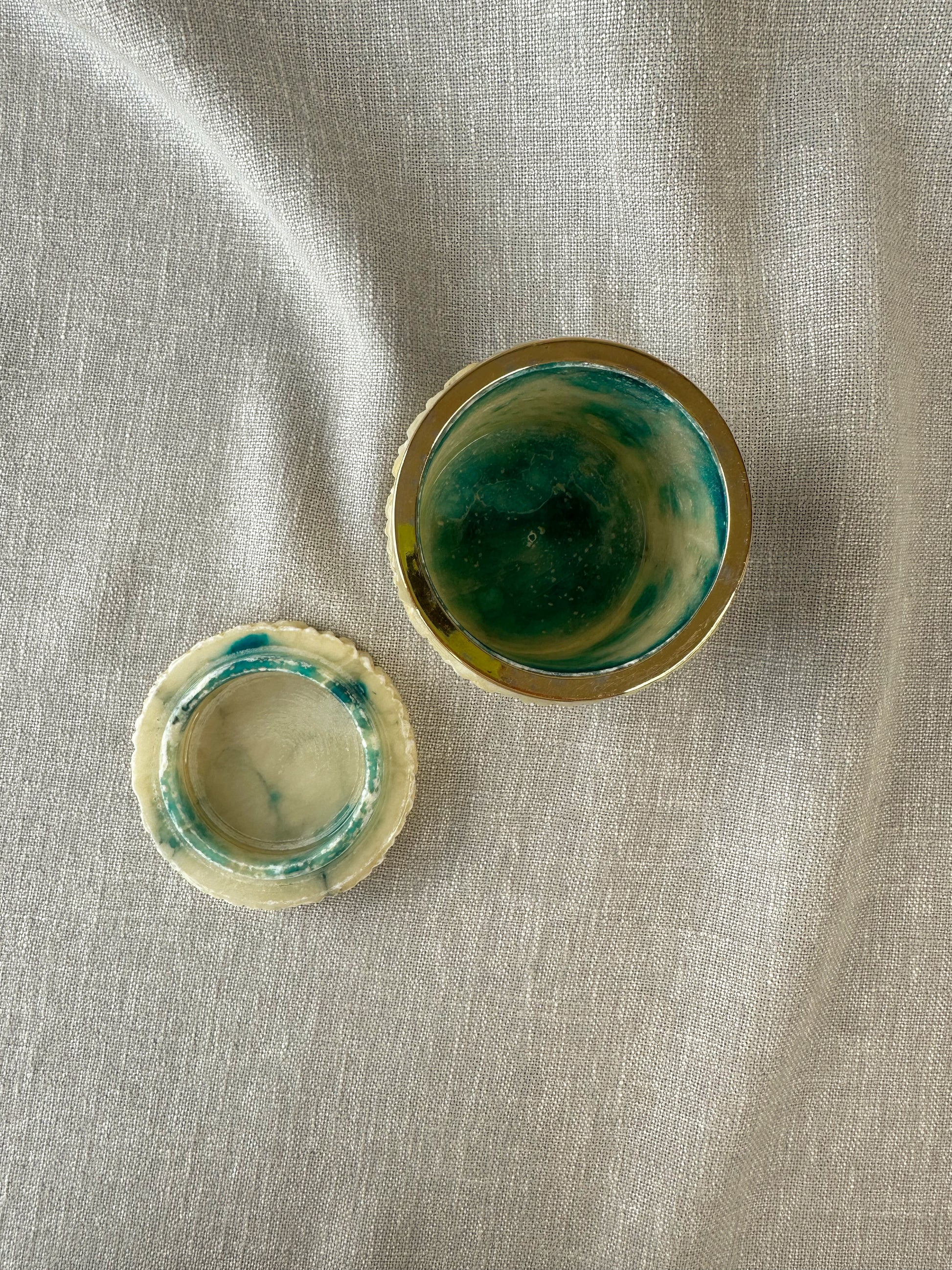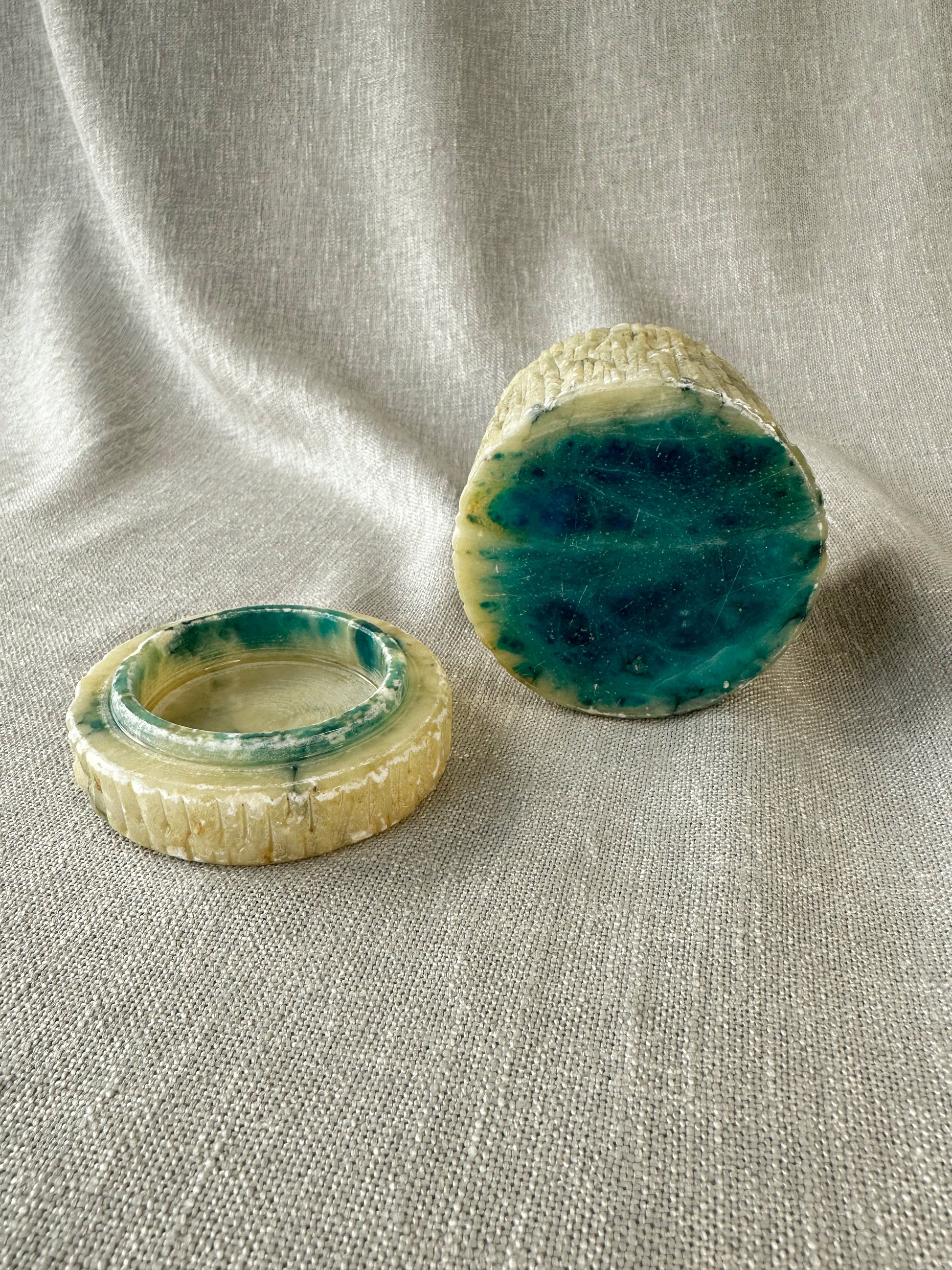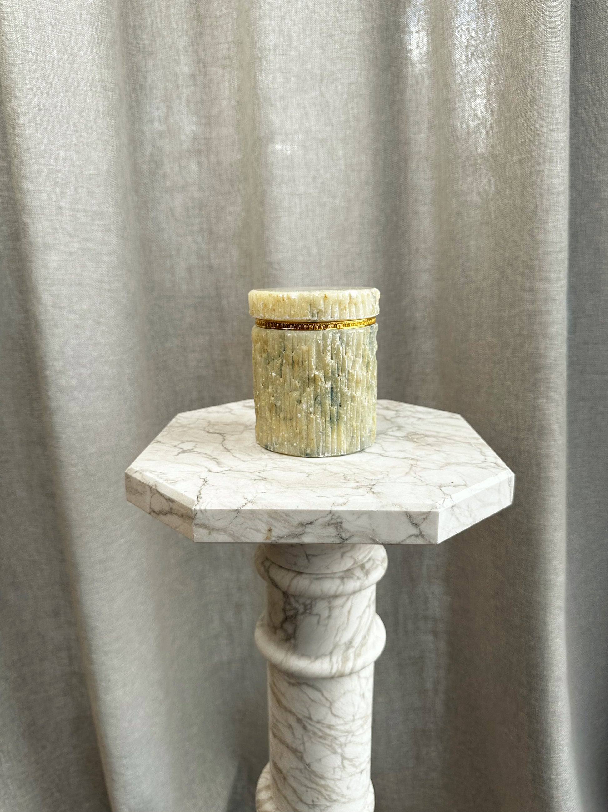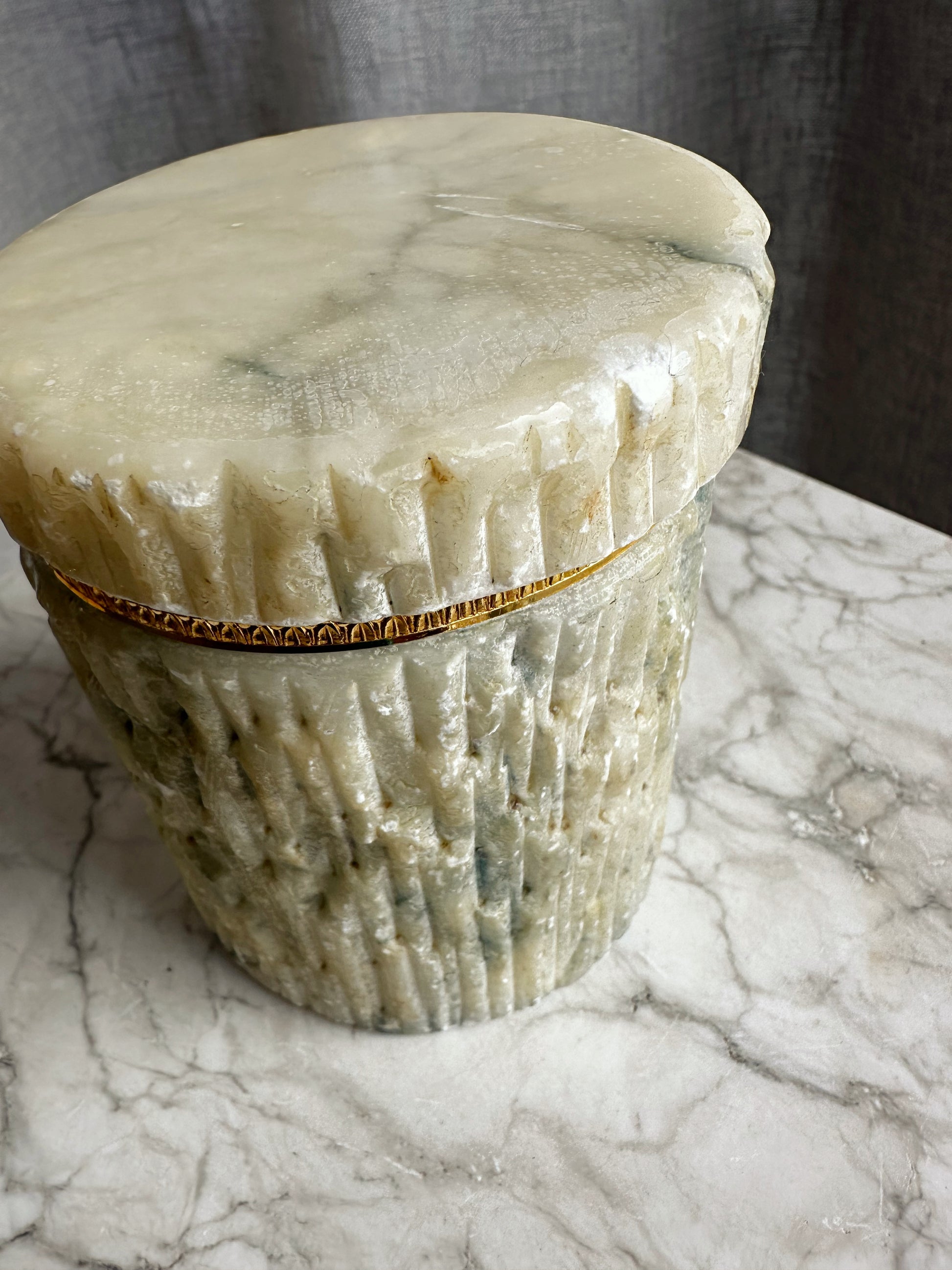 Vacker cylinderformad ask i marmor. Storleken är 10,5 cm hög och 8,5 cm i diameter. Perfekt i badrummet för förvaring av små ting.