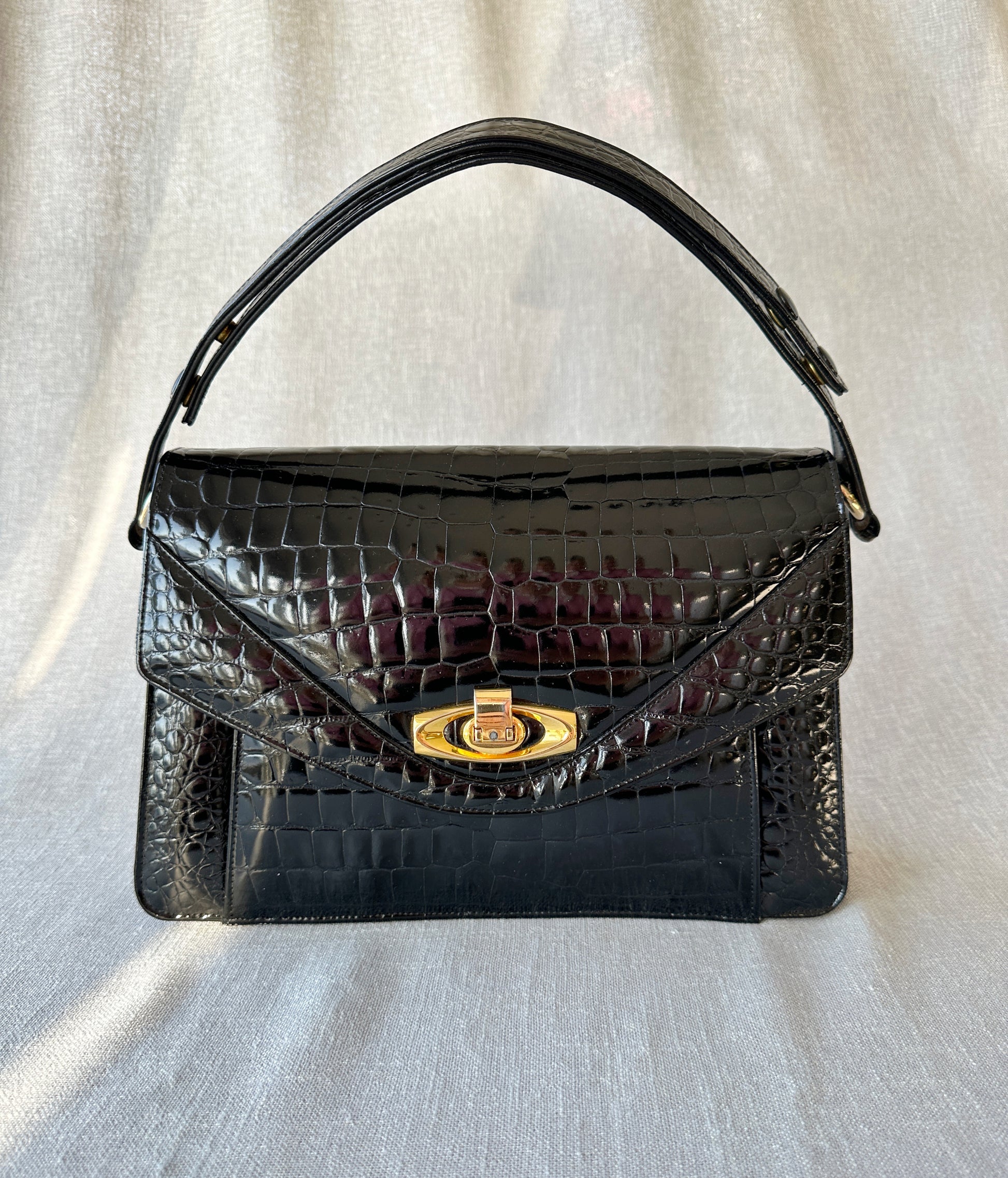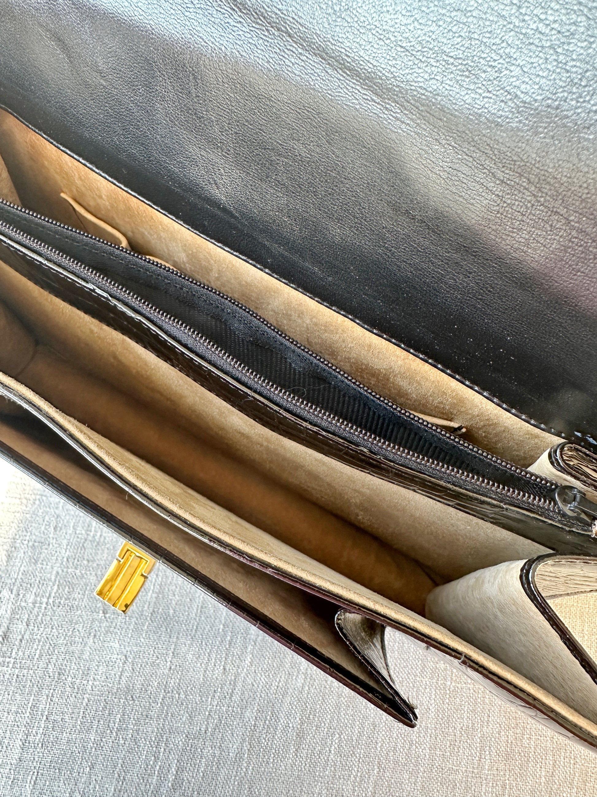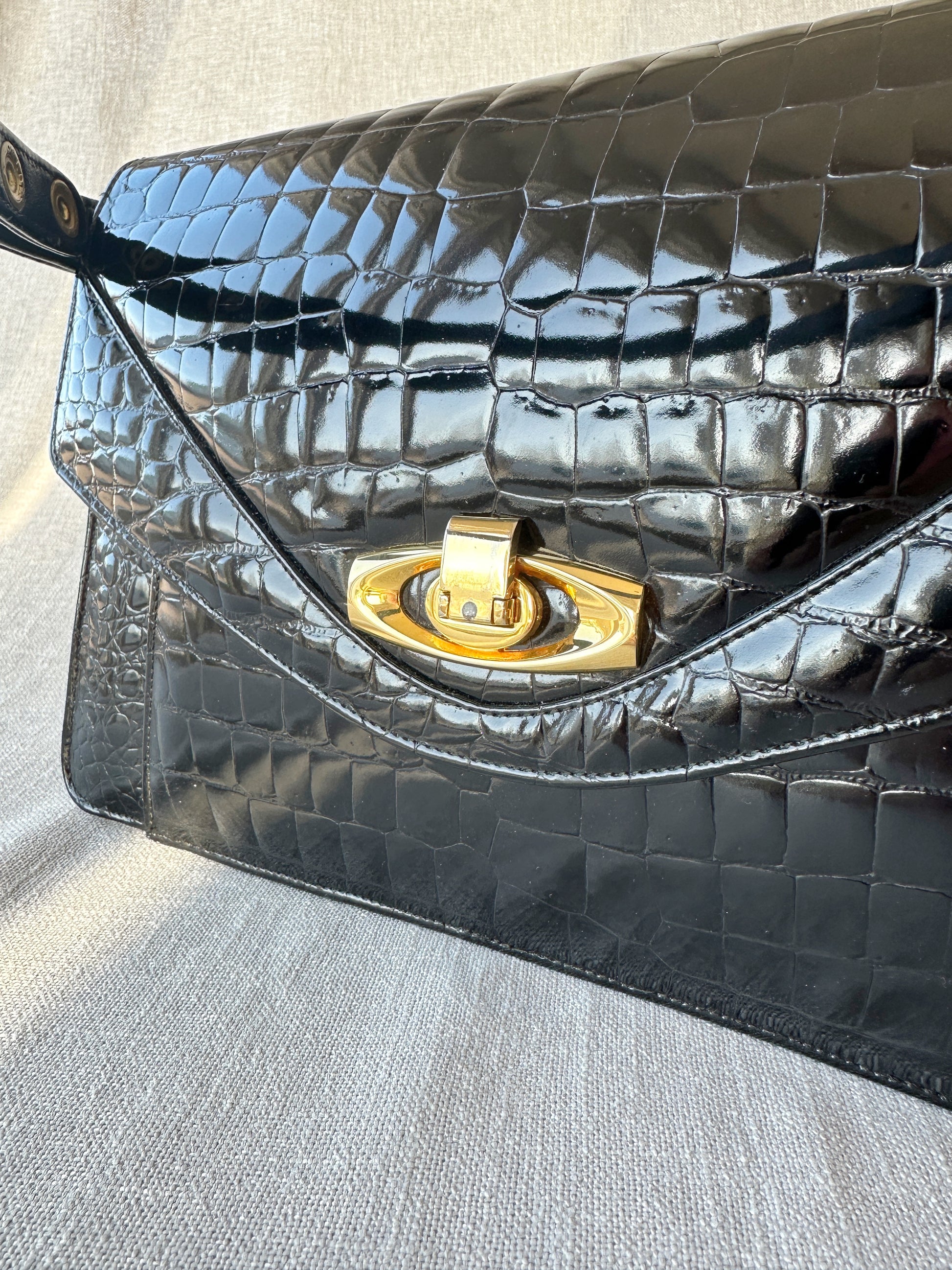 Underbar vintage handväska i crocopräglat skinn med fläckfritt ljusbrunt läderfoder på insidan. Handtaget går att justera något i längden med hjälp av tryckknappar. Ytterst lite slitage på guldspännet i övrigt är den i perfekt skick.