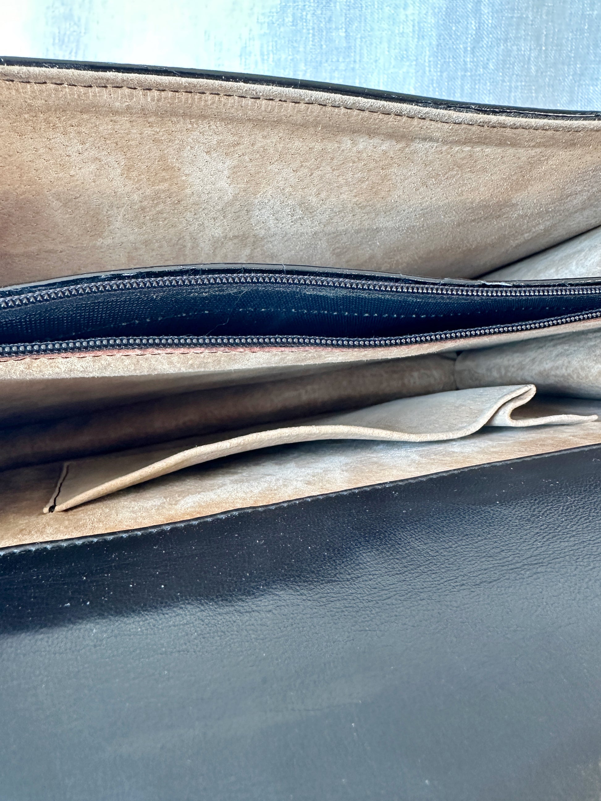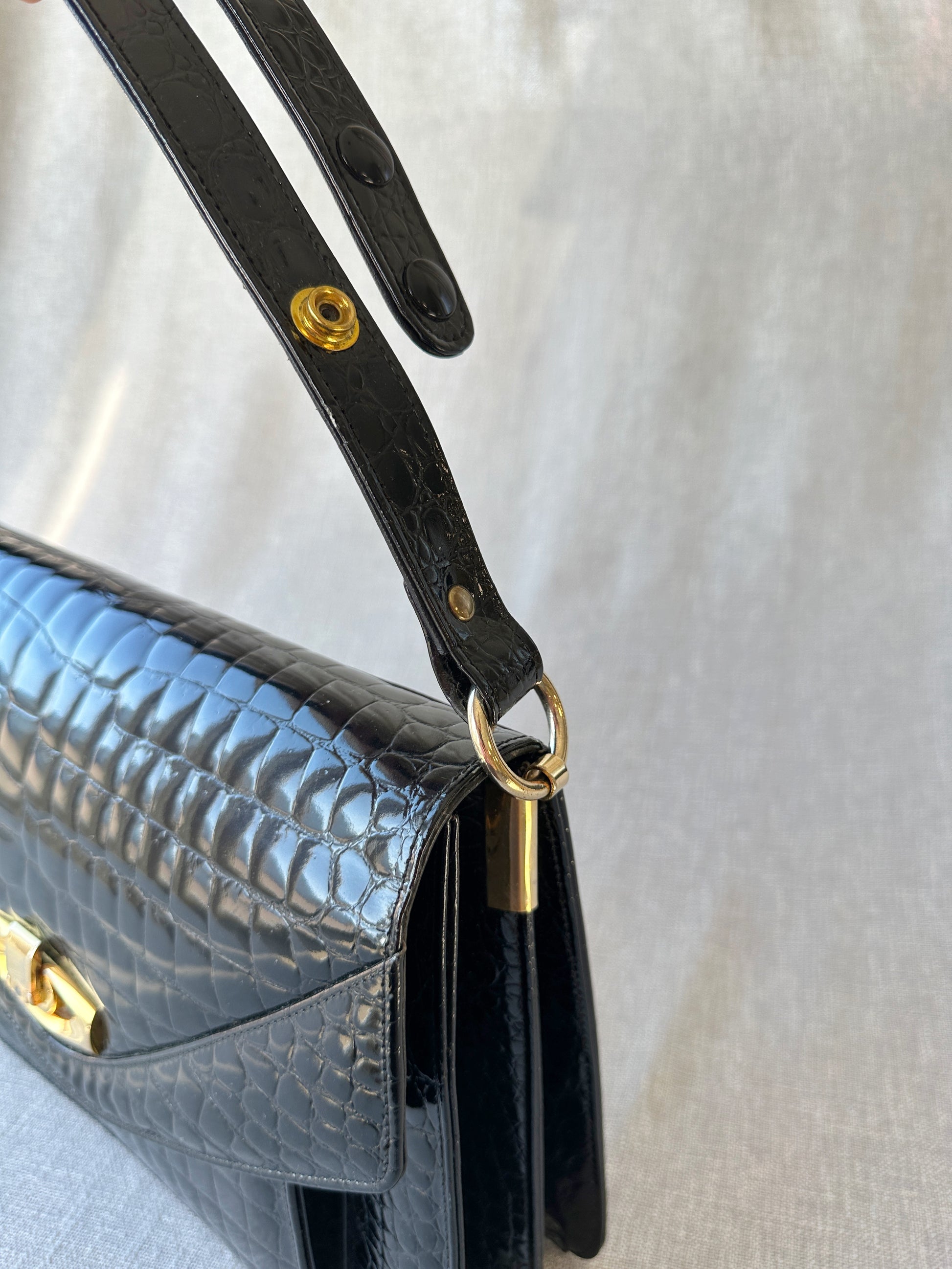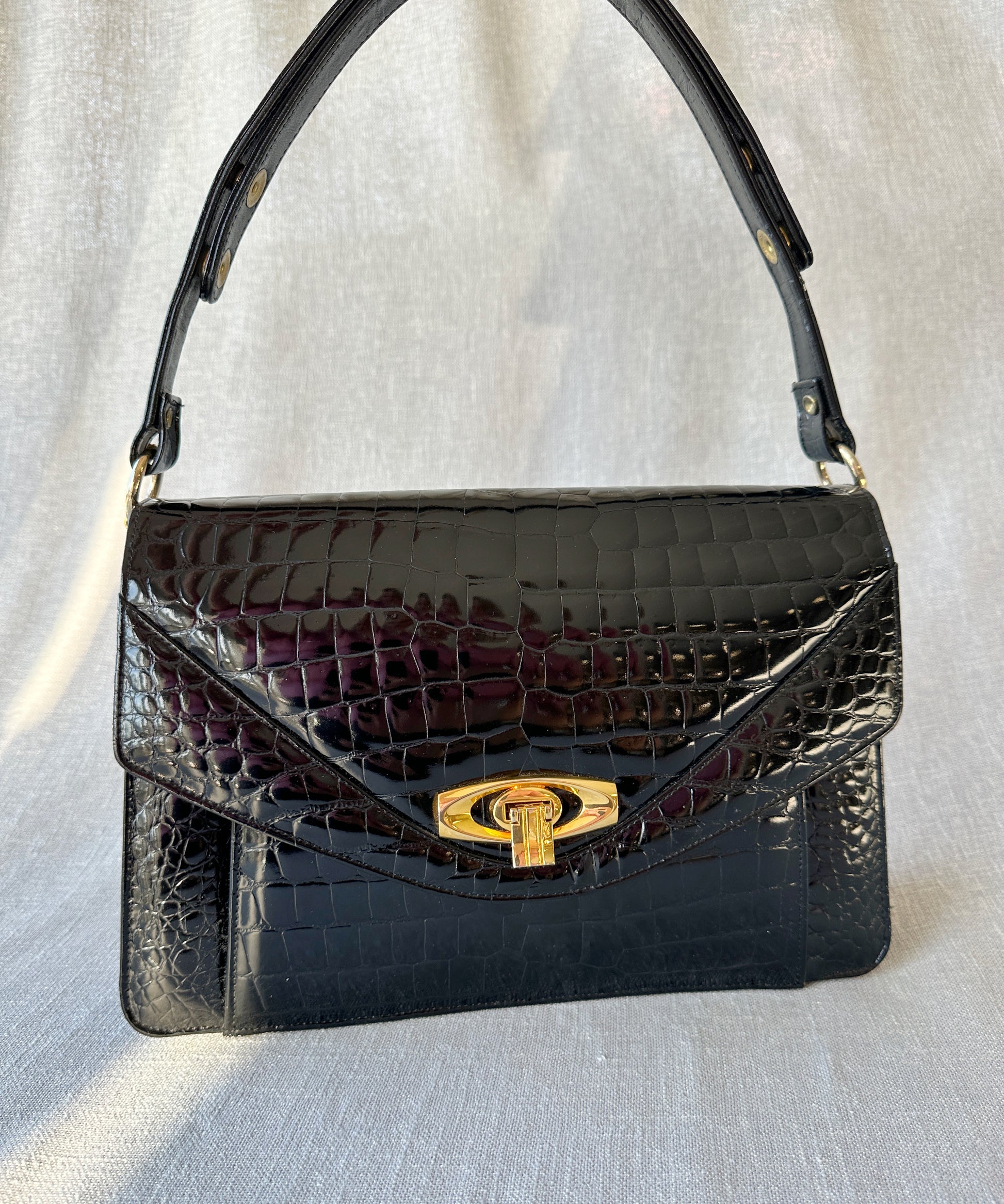 Underbar vintage handväska i crocopräglat skinn med fläckfritt ljusbrunt läderfoder på insidan. Handtaget går att justera något i längden med hjälp av tryckknappar. Ytterst lite slitage på guldspännet i övrigt är den i perfekt skick.