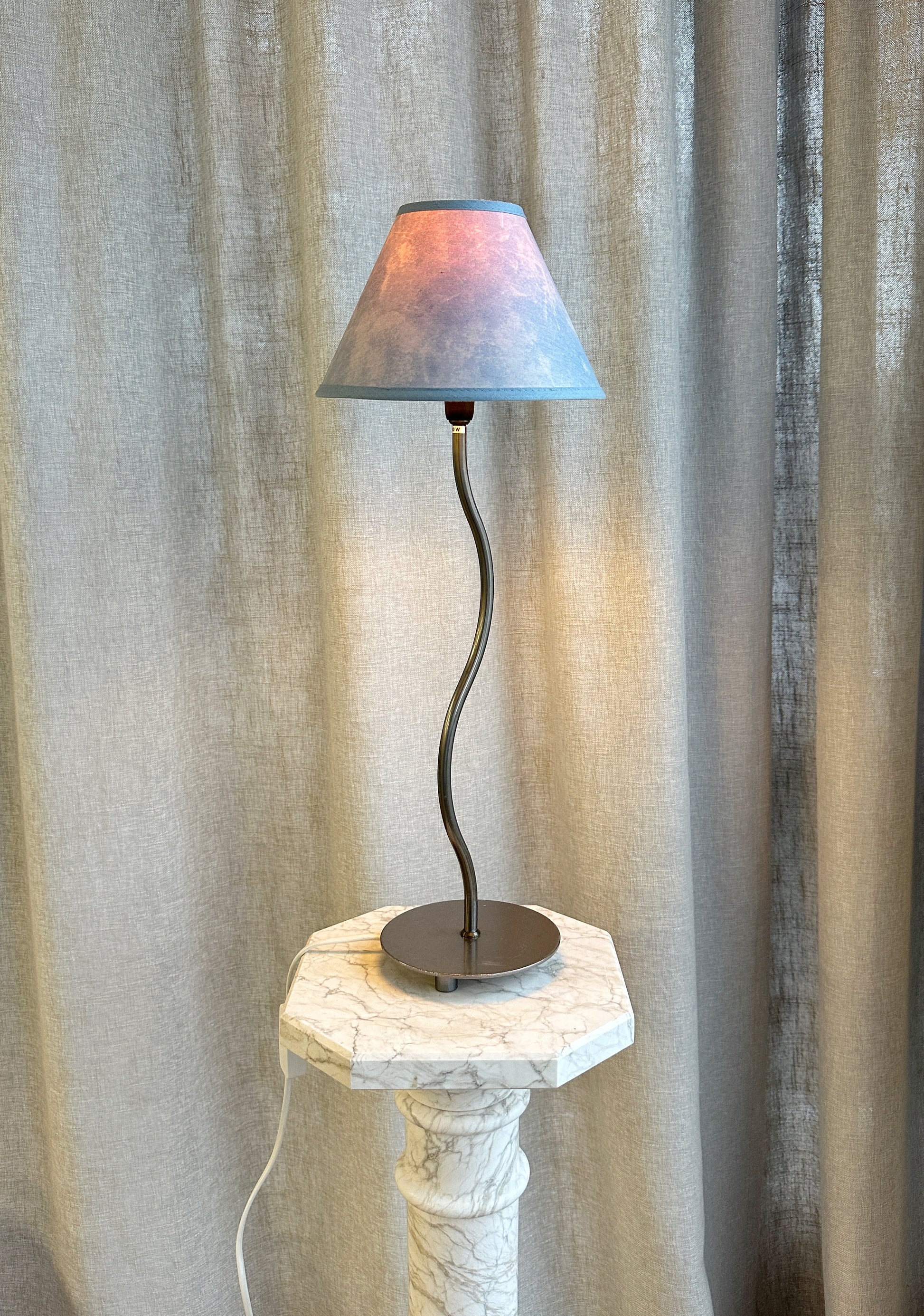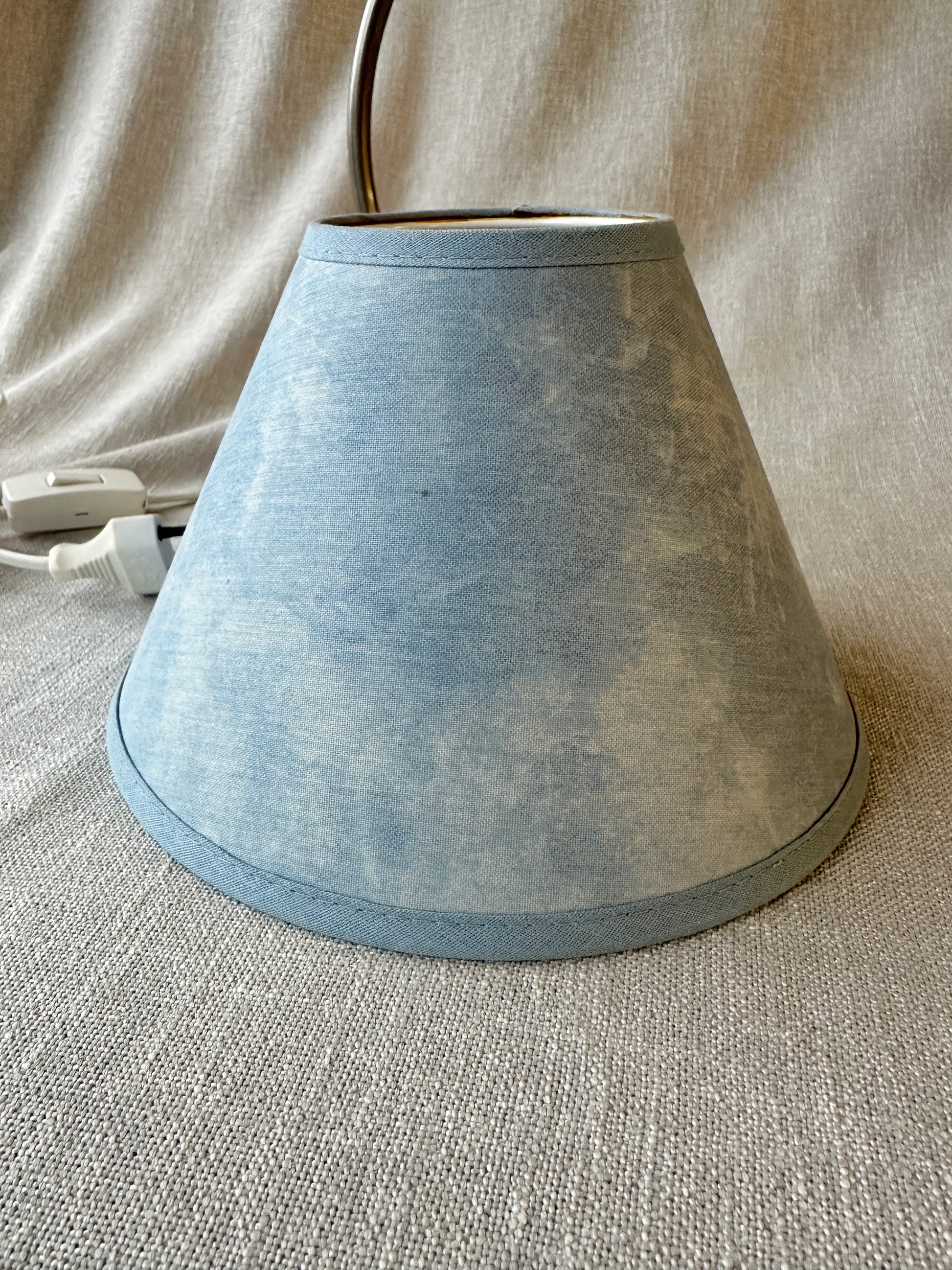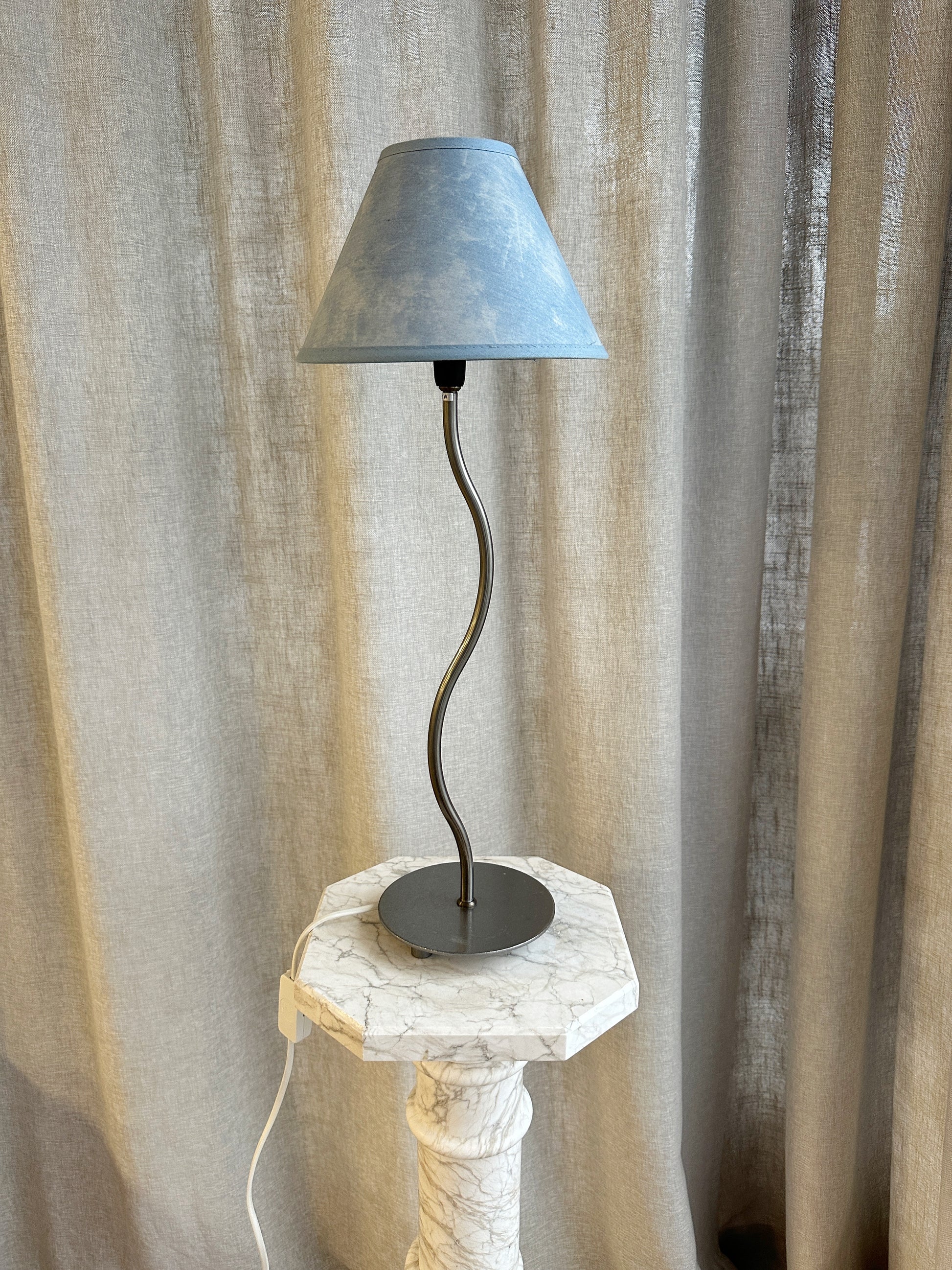 Ytterligare en härlig 90-tals klenod! Här är en stålfärgad lampfot ihopparad med en batikfärgad lampskärm i härlig himmelsblå nyans. Hög fot på 46 cm och skärmen är 14 cm hög och ca 20 cm i diameter. Någon liten fläck på skärmen samt ett jack i kontakten, se bilder.