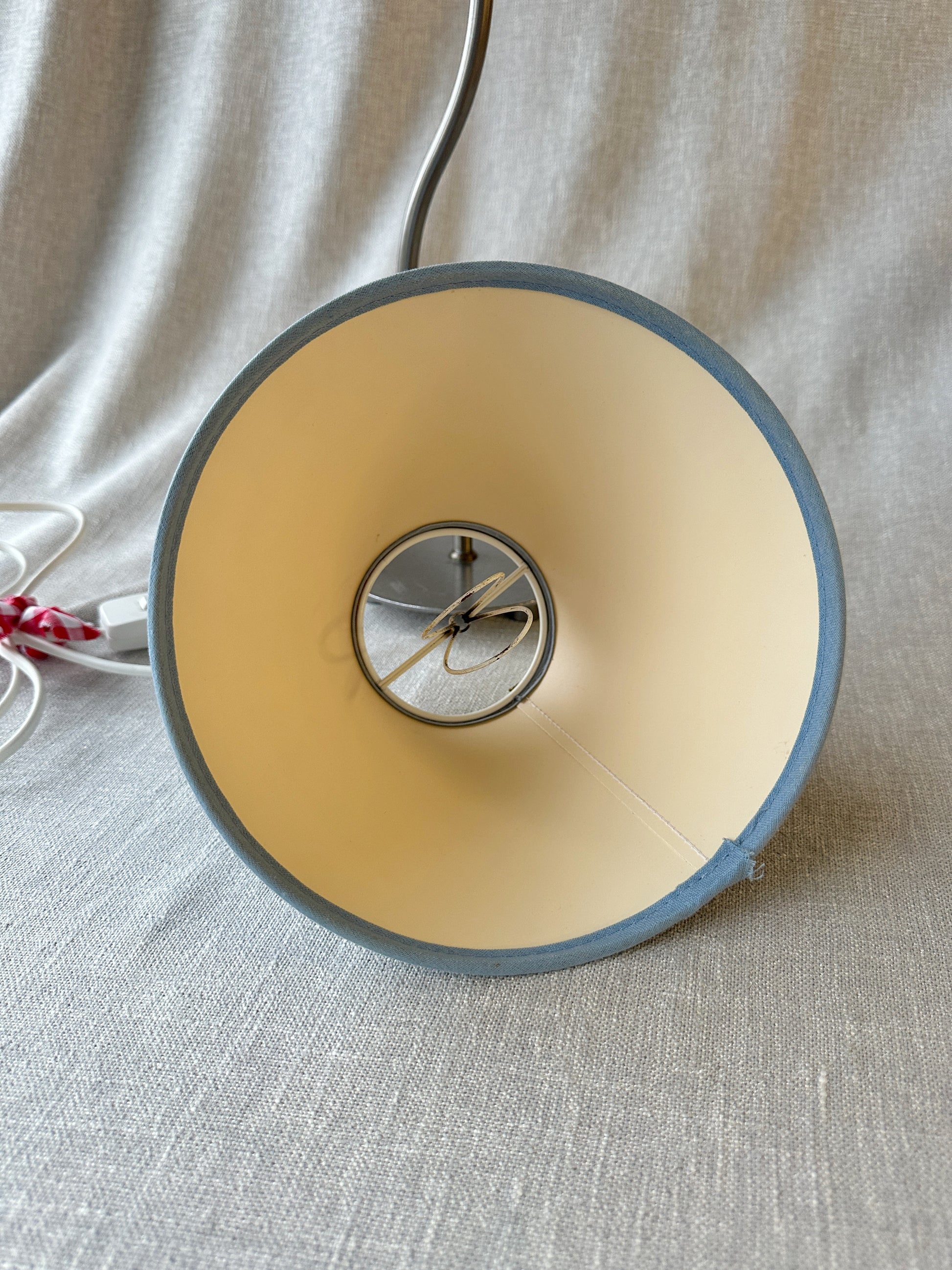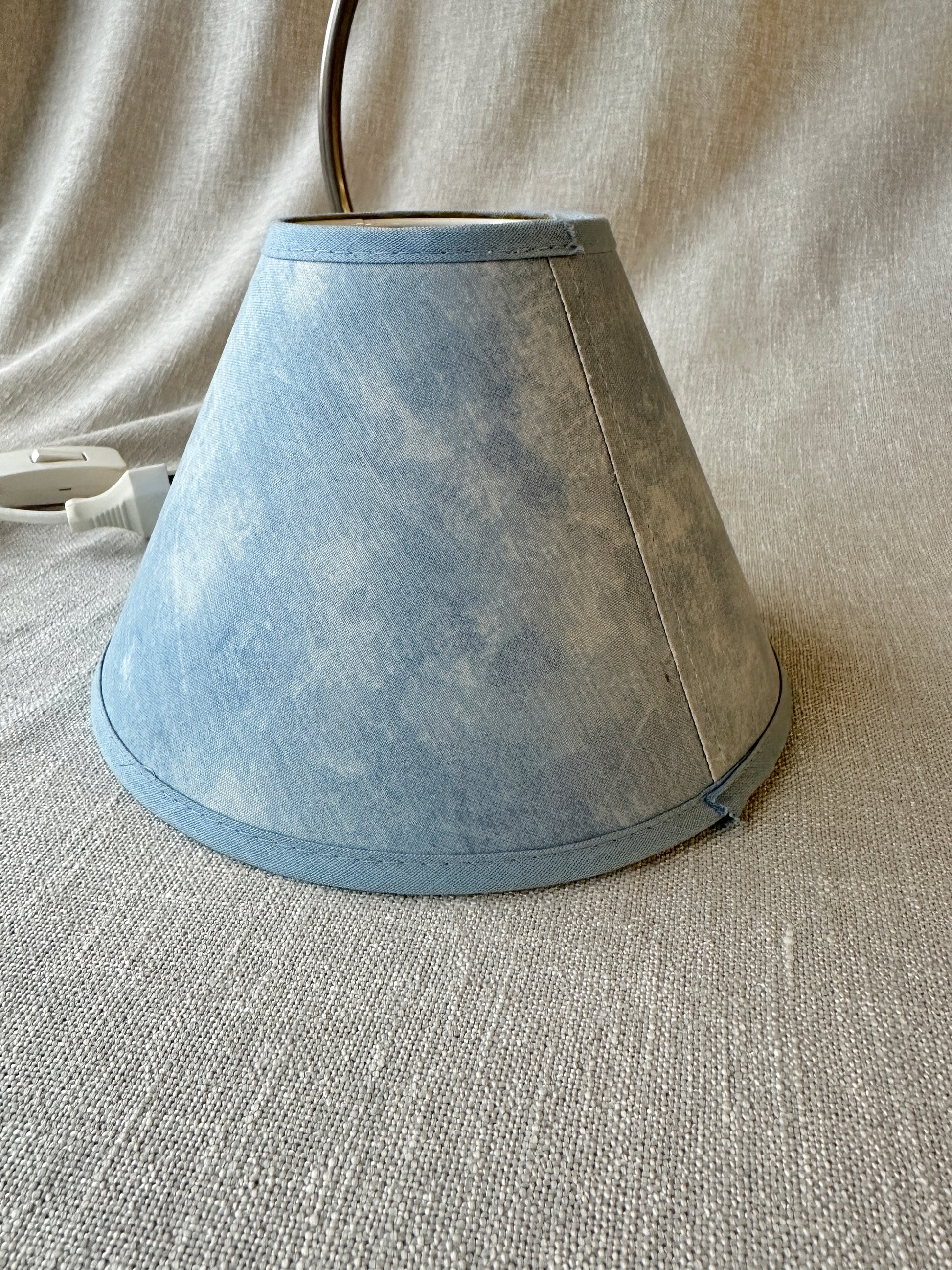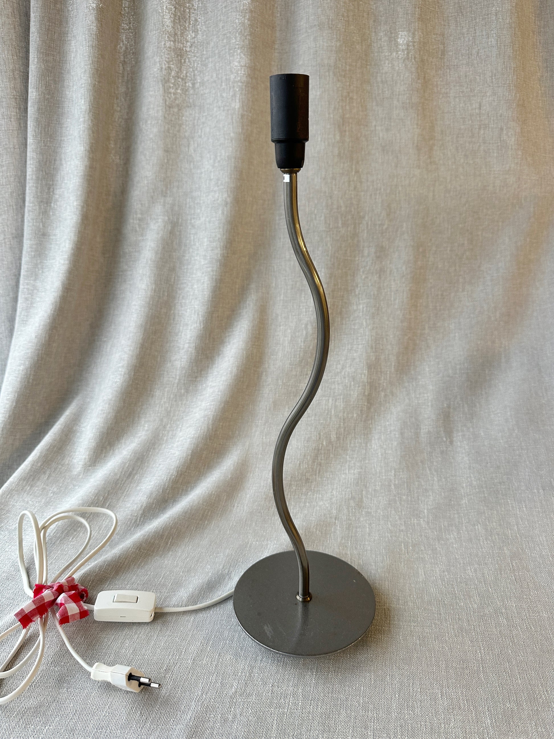 Ytterligare en härlig 90-tals klenod! Här är en stålfärgad lampfot ihopparad med en batikfärgad lampskärm i härlig himmelsblå nyans. Hög fot på 46 cm och skärmen är 14 cm hög och ca 20 cm i diameter. Någon liten fläck på skärmen samt ett jack i kontakten, se bilder.