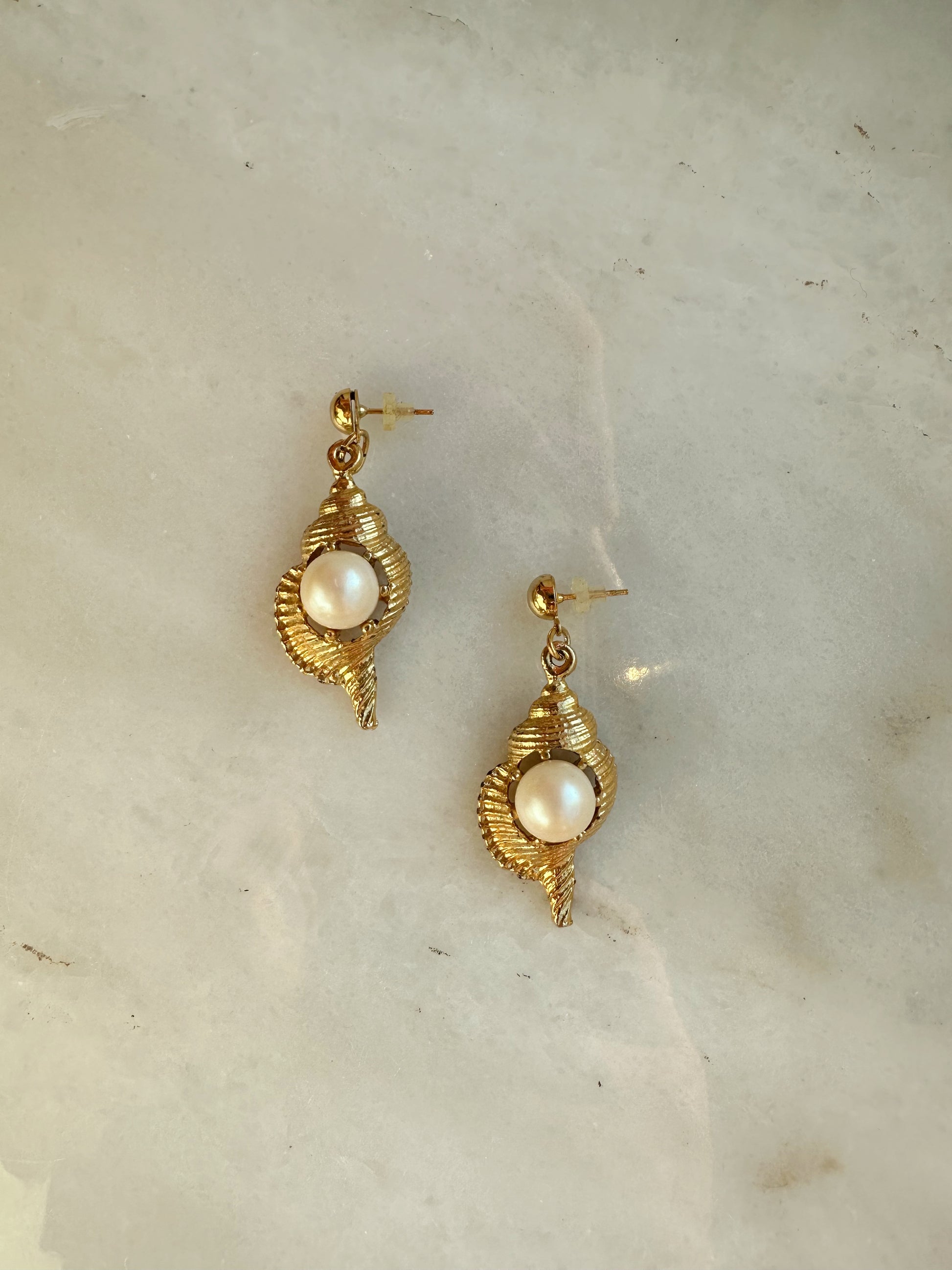 Ljuvliga vintage örhängen i form av en snäcka med en liten pärla på. Materialet är en okänd guldfärgad metall och pärlan är i plast. Längden är ca 3,5 cm.